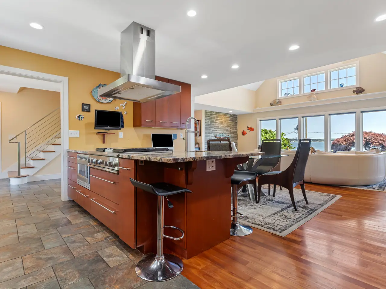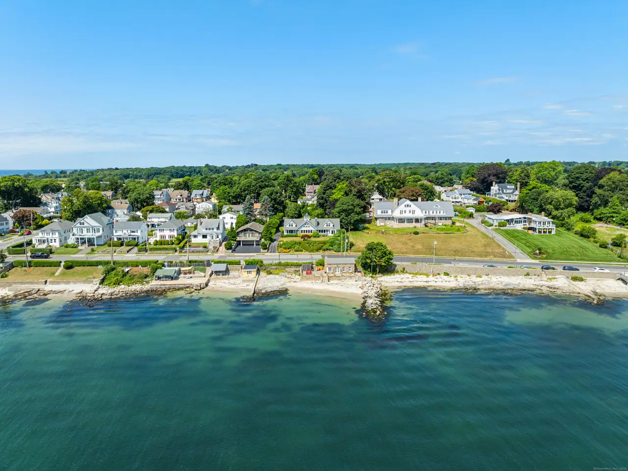 An enchanting New England home situated atop lush lawns with expansive panoramic water views overlooking a pageantry of sunrises, the beach, ocean views, sailboats, sea, sand, and iconic lighthouses-with a cast of passing ferries and ships. This extensively renovated home was taken down to the studs and rebuilt with high-end architectural finishes and thoughtful design. It has a bright and airy coastal feel. The interiors are drenched in light, overlooking a dazzling display of seascapes. Clean aesthetics strike a perfect balance between formal entertaining and cozy, private havens-elegant, yet casual and comfortable. You'll feel truly at home the moment you enter the sun-filled, luxurious main living level. Conversations are shared throughout the living room, dining room, den, and spacious kitchen-all with stunning water views of Long Island Sound! Retreat at day's end to the main level primary suite with a luxurious bath, his and hers walk-in closets, ensuite laundry, and more water views from every window. Upstairs, a spacious landing with glistening windows and a sky dome leads to two guest suites, each with an en-suite bath. The intrigue continues on the lower level: a welcoming expanse ideal for guests, billiards, game nights, and a vintage "bar" with stools from a legendary downtown restaurant-all beckoning as a party space or haven for the tots. Private membership to Neptune Park Beach, one of the East Coast's finest, is included.
