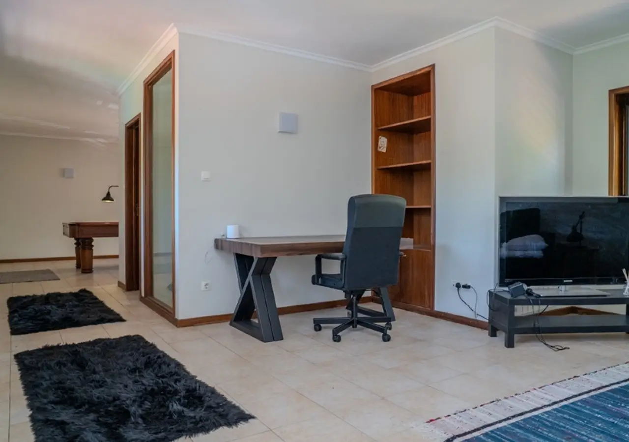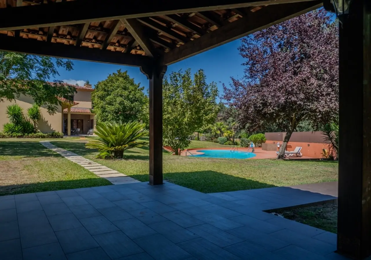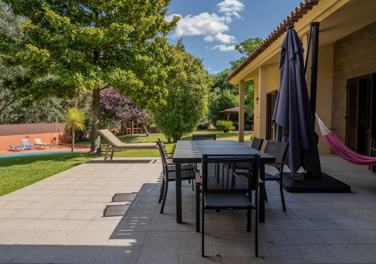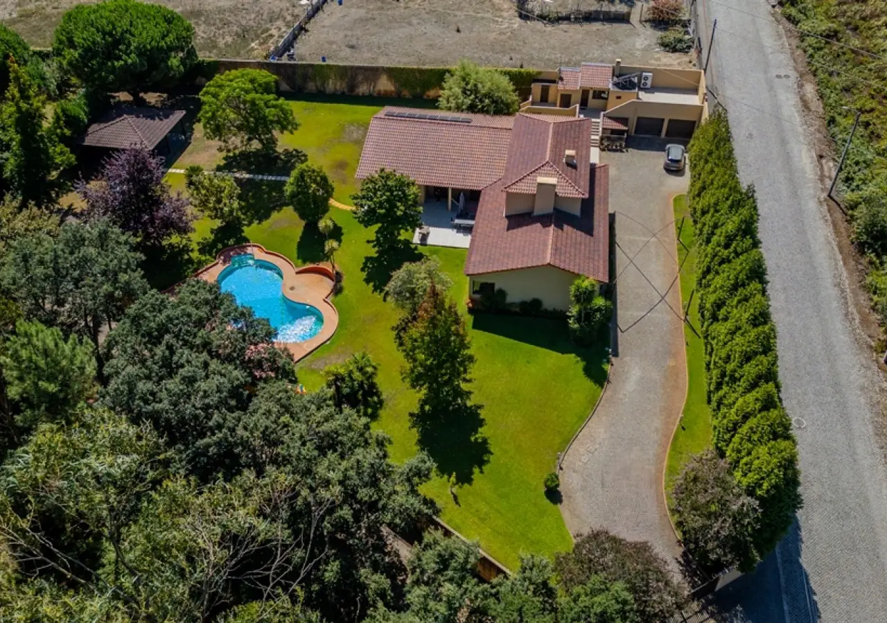 Fantastic villa with garden and swimming pool for sale in Trofa. The house is mainly on the first floor, with a generous living room with a fireplace, a guest bathroom and a kitchen with a pantry. This social area is complemented by a pleasant lawned garden with a swimming pool, as well as an outdoor dining area. As for the private area, the villa has five bedrooms, two of which are en-suite. On the upper floor there is a games room with a support bathroom. Set on a magnificent plot, this villa is ideal for outdoor leisure time with family or friends. 15 minutes from Porto and Francisco Sá Carneiro Airport. CHARACTERISTICS: Plot Area: 3 000 m2 | 32 292 sq ft Deployment Area: 443 m2 | 4 768 sq ft Building Area: 458 m2 | 4 930 sq ft Bedrooms: 5 Bathrooms: 5 Garage: 2 Energy efficiency: B FEATURES: House clad in hood; Support porch with barbecue; Solar panels; Central heating with heat pump; Borehole for pool and garden irrigation; Outdoor laundry, storage and space for technical area; Closed garage for 2 cars.