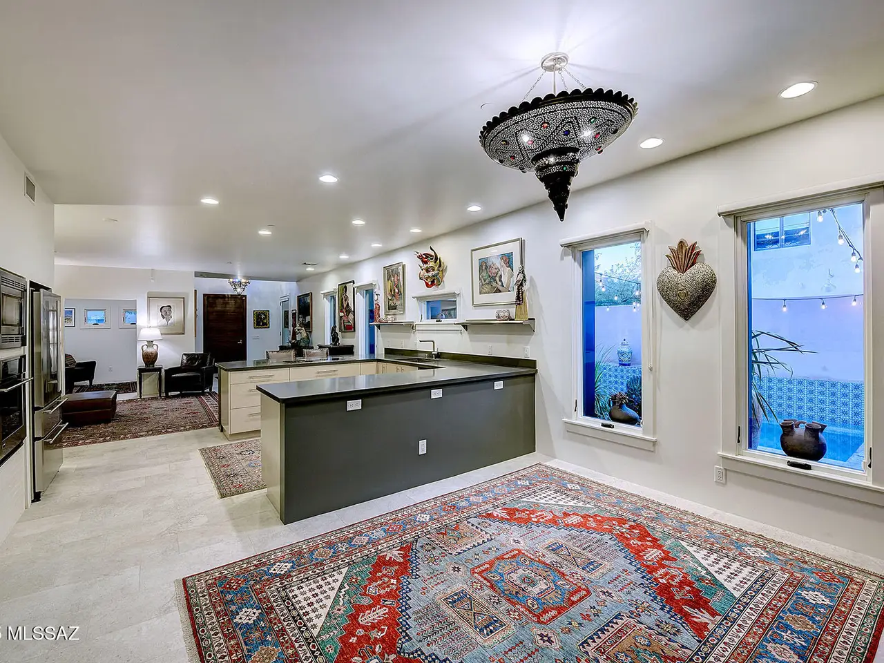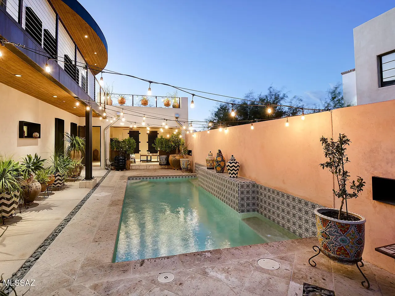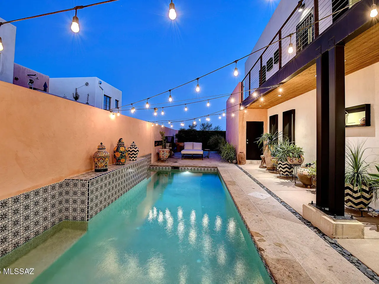 Discover a rare gem: an iconic home nestled in the heart of Mercado San Agustin. This elegant, custom-designed residence radiates European charm and features a versatile floor plan perfect for modern living. The spacious, light-filled great room on the ground floor boasts luxurious Chamonix porcelain tile, while the upstairs invites you in with bright, airy spaces covered in warm plank-wood flooring. Downstairs the beautifully appointed kitchen offers ample storage, a dining area, walk-in pantry, and stainless-steel appliances. A cozy den and guest bedroom with an upgraded bathroom complete with Villa Deco Graphite tile are conveniently located downstairs. Ascend to the second level, where you'll find another guest bedroom with an en-suite bath, adjoining the primary bedroom a private