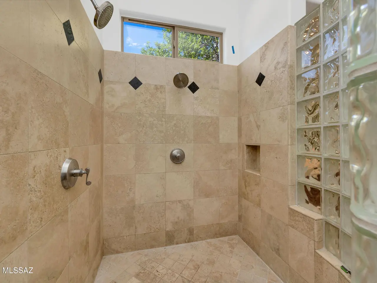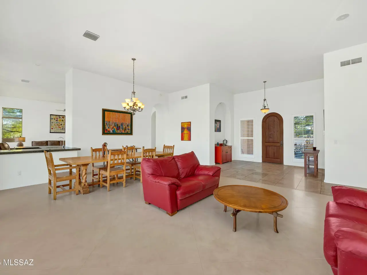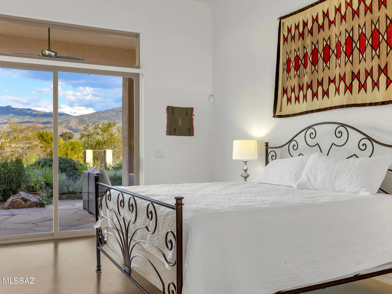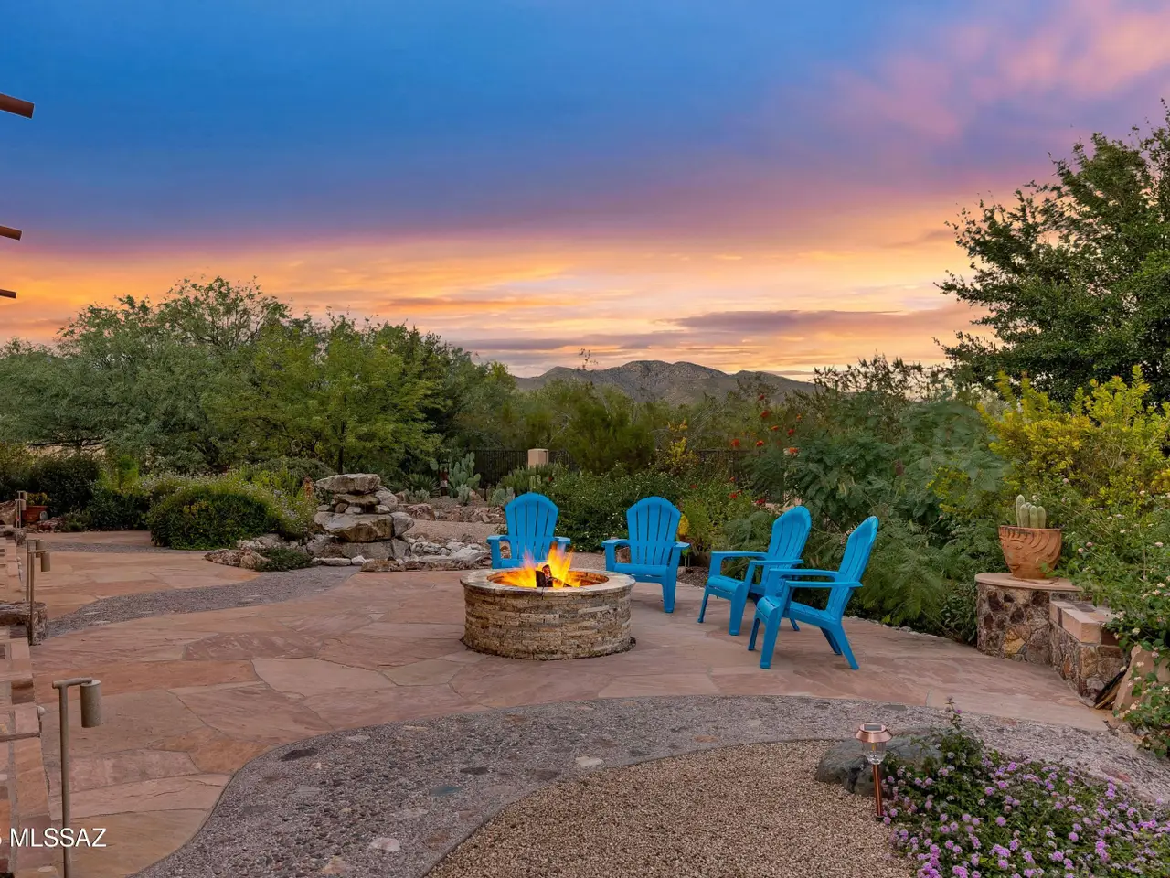 Nestled at the end of a quiet cul de sac, and perched on 49ers CC Estates most elevated plateau, this polished and modern home's wall of glass showcases the Rincon mountain range in an unparalleled way. On nearly an acre, the backyard offers an entertainer's delight including surround sound speakers, butterfly garden, granite fire pit, outdoor shower and hot tub. Open and airy split floor plan that seamlessly integrates gourmet kitchen (6-burner Dacor oven/warming drawer and abundant cabinetry) with a living room fireplace and wet bar. The great room and family room flow into a sweeping flagstone patio. Luxurious primary suite includes two expansive walk-in closets, a 2 person shower and soaking tub. Enjoy the 49ers golf course, clubhouse, restaurant, fitness center and heated lap pool.
