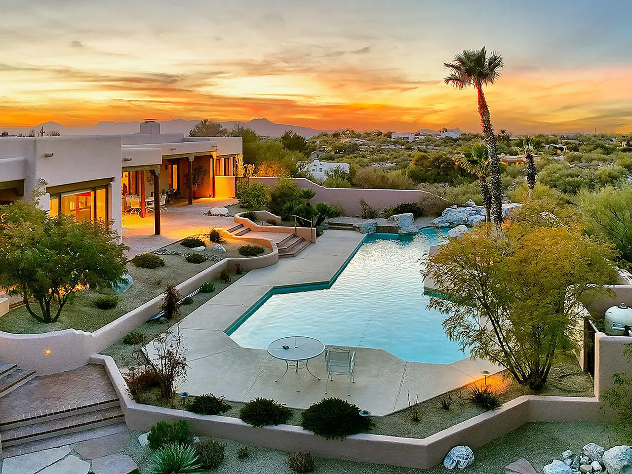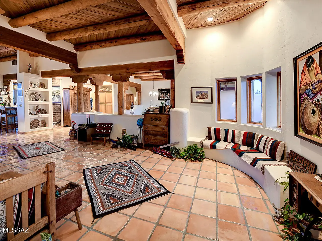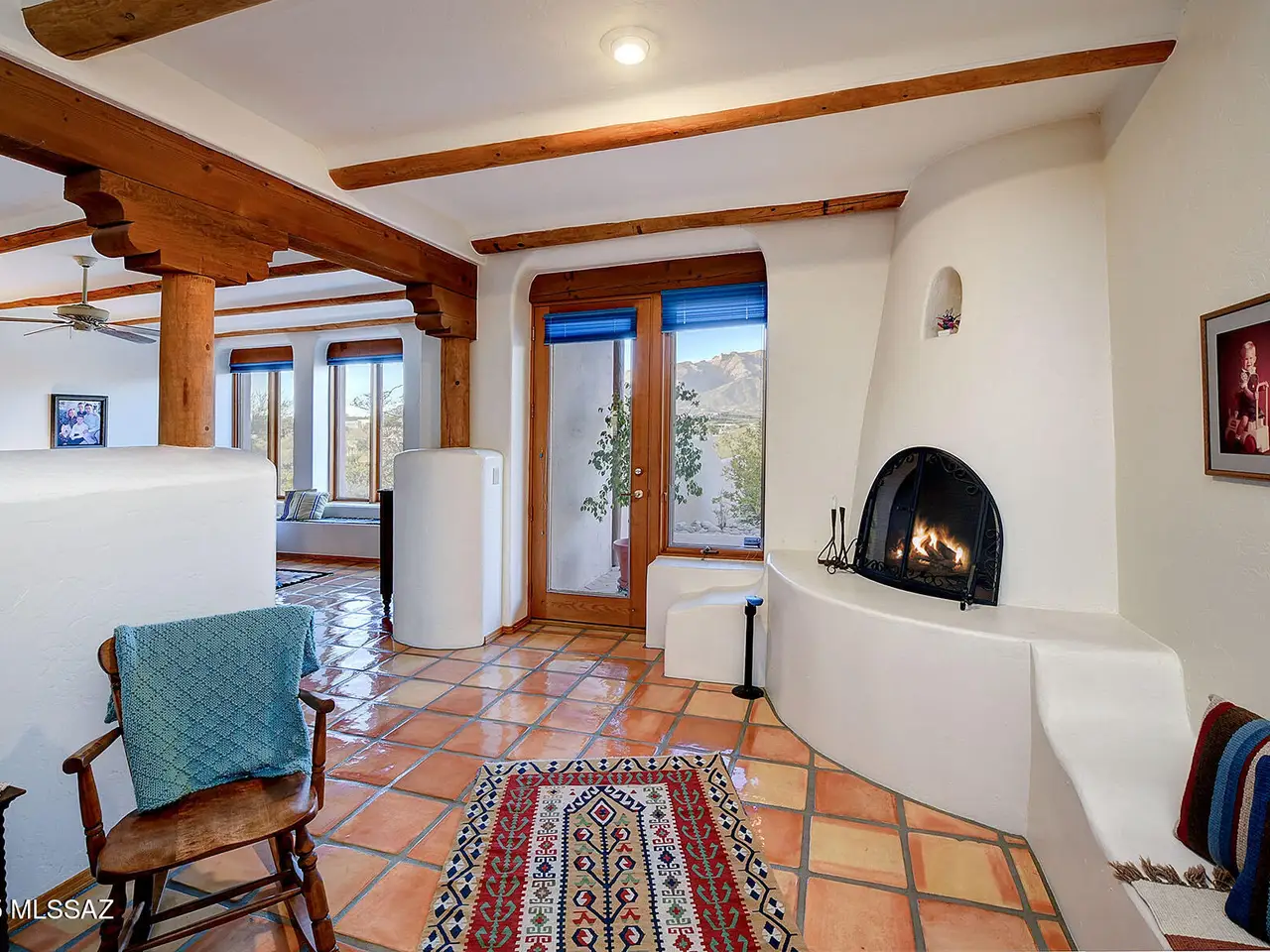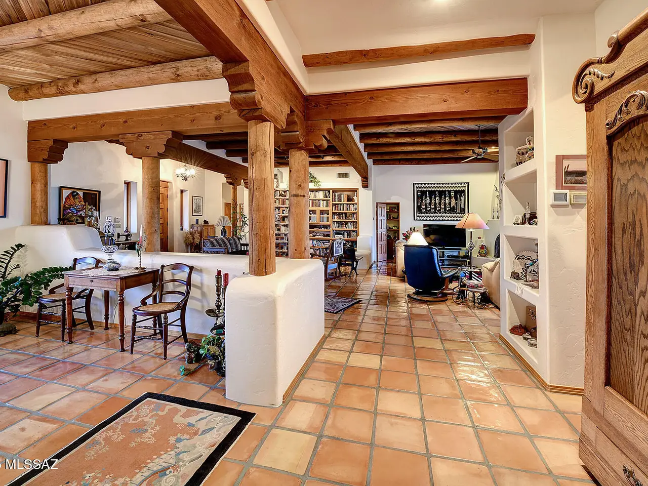 Exceptional Mike Wachs Southwestern-Style Home in Prestigious Catalina Foothills Estates #10. Nestled within the sought-after, guard-gated Catalina Foothills Estates #10, this stunning 4, 948 sq. ft. all-masonry stucco home sits on a rare double lot spanning 2.89 acres. Designed to embrace breathtaking, unobstructed views of the Catalina Mountain and iconic Finger Rock, this five-bedroom plus den retreat offers the perfect blend of luxury, character, and timeless Southwestern charm. Perched high on a hill, a circular driveway leads to an inviting courtyard entry, complete with a covered patio and captivating city views. A grand 4-inch-thick oak front door welcomes you into the spectacular great room, featuring Saltillo tile floors, viga-beamed and cedar strip ceilings with corbels, an expansive display bookshelf, charming beehive fireplace, walls of windows, and a mud adobe bar area, all thoughtfully designed to maximize the striking mountain backdrop. An adjacent formal dining room provides a charming space for entertaining. The warm and inviting Southwestern-style kitchen boasts a spacious center island, ample cabinetry, Talavera countertops, and a bright breakfast area. The gracious primary suite includes a cozy seating area, a beehive fireplace with a niche, a walk-in closet, dual vanities, and direct access to the backyard. A generous 1, 491 sq. ft. three-car garage with an RV bay provides abundant walk-in storage rooms. Outside, the park-like backyard is a true oasis, featuring an expansive rear porch, a lap pool with a waterfall, an artificial turf area, and stunning panoramic mountain views. This quality-built home is a masterpiece of craftsmanship, brimming with charm and character at every turn. A must-see to fully appreciate!