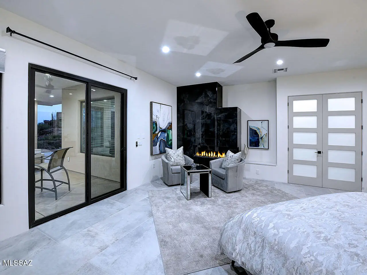 Stunning, like-new 2023 contemporary perched on La Paloma Drive, the highest street in the coveted Coronado Foothills Estates of Tucson's Catalina Foothills. Set on a glorious one-acre lot embraced by the Catalina Mountains and Coronado National Forest, this 3, 605 sq. ft. residence offers 4 bedrooms, 4.5 baths, and a 3-car garage--designed to showcase sweeping city lights, mountain vistas, and dramatic sunrise and sunset views from every room. Built by renowned master builder Paul Rondelli, the home welcomes you into a striking great room with soaring ceilings, walls of glass, porcelain tile flooring, a sleek fireplace, and an open dining area--perfect for entertaining. The chef's kitchen is both functional and modern, featuring stainless steel appliances, a spacious center island with a breakfast bar, abundant counter space, and a walk-in pantry. The luxurious primary suite is a private retreat with a fireplace, direct access to the covered patio, and a spa-inspired bathroom boasting quartz finishes, a walk-in glass shower, a soaking tub, and a generous walk-in closet with custom built-ins. Each bedroom has an en-suite bath and a walk-in closet. Additional highlights include a large laundry room with a sink, and a light-filled garage with windows and epoxy coated floors. Located within the Catalina Foothills School District #16, this home offers the perfect blend of contemporary style, move-in-ready convenience, and unrivaled views, all just minutes from shopping, dining, and city amenities, yet peacefully above the bustle of daily life.
