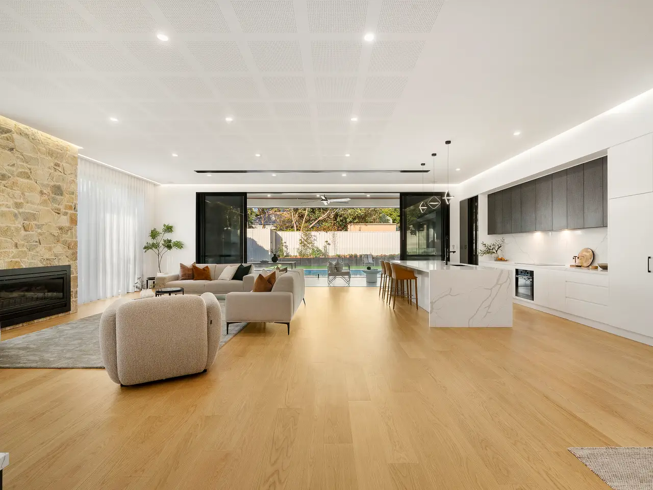 Statement stone feature wall with embedded gas fireplace