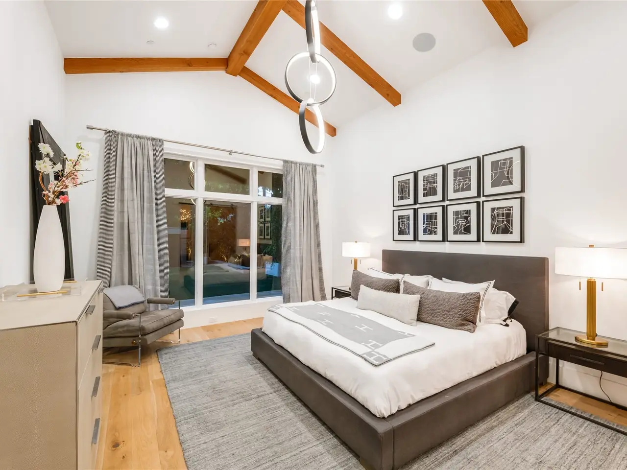 - Luxurious primary suite with vaulted beamed ceiling & spa-like bath