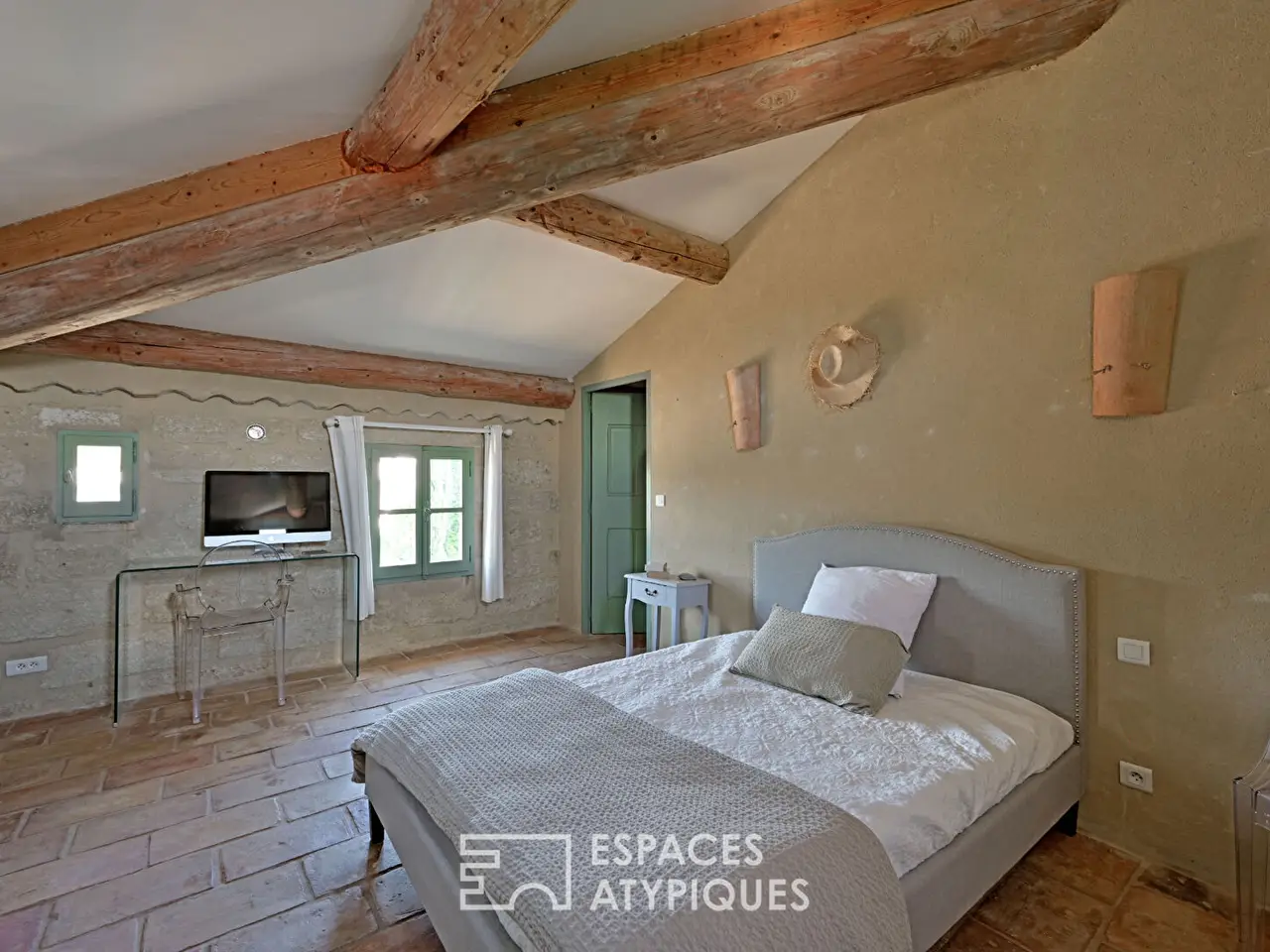 A stone's throw from Uzes, nestled in a secluded village where time seems to stand still, this stone residence of approximately 365 sqm spreads its old-world charm around a sunny courtyard, with a terrace and swimming pool, and a hanging garden. Behind a small, discreet entrance courtyard, a door crossed like a threshold, the gaze immediately rises under the majestic vaults of a former stable reinvented as a large living room. There, the rough stone interacts with a fireplace almost sculpted in the rock, and the light, fluid and soft, slides to the depths of its 59 sqm. The atmosphere is striking: both majestic and deeply welcoming. A little to one side, a second intimate living room with a vaulted ceiling in parefeuille houses a fireplace, like a heart beating in the stone. It opens, on one side, onto a double kitchen bathed in light with triple exposure, wooden island, cooking range and on the other onto the terrace. The adjoining dining room, delimited by a stone arch, opens generously to the exterior and extends the experience of the house towards the sky. On the upper floor of the south wing, the master suite stretches over 46 sqm. A triple exposure bedroom opens its windows onto the murmur of the stones and the softness of a covered terrace. A hallway lined with storage leads to an office, then to a bathroom where a claw-foot bathtub, Italian shower and stone basin create a timeless, almost romantic setting. Higher up, two bedrooms share a floor. One of them, extended by a suspended terrace, offers a view to the west that the sun sets ablaze each evening. A bathroom with simple and elegant lines discreetly completes this level. In the west wing, accessible independently, the first two bedrooms on the first floor overlook the courtyard and the rooftops of the old village, each with its own bathroom. On the upper floor, two further suites separated by a covered terrace open onto infinity. There, the view embraces the countryside as far as Mont Ventoux, in an almost painterly depth of field. Each room is designed as a refuge: generous volumes, noble materials, breathing space. The hanging garden, a little secluded, like a secret corner where one would come to read, dream, or simply be silent. Below, the main courtyard, approximately 162 sqm, comes alive with small nooks, soft shade, and sun-drenched corners. A summer dining room, a solarium, and a swimming pool with simple lines create a rich, fluid, and inspiring outdoor life. A workshop, wine cellar, pantry, bicycle storage, and a garage for two to three cars complete the ensemble. Electric underfloor heating on the south side, oil-fired radiators on the west side, double glazing, nothing has been left to chance. This house tells a story. That of old stones, of lived-in silence, and of an art of living that time cannot alter. Located 4 kilometers from Uzes, 30 minutes from Avignon TGV, 28 kilometers from Nimes and 19 kilometers from the highway. Contact: Virginie 06 77 39 33 14 ENERGY CLASS: D / CLIMATE CLASS: C REF. 12187 Additional information * 10 rooms * 7 bedrooms * 6 bathrooms * 2 floors in the building * Property tax : 4 000 €