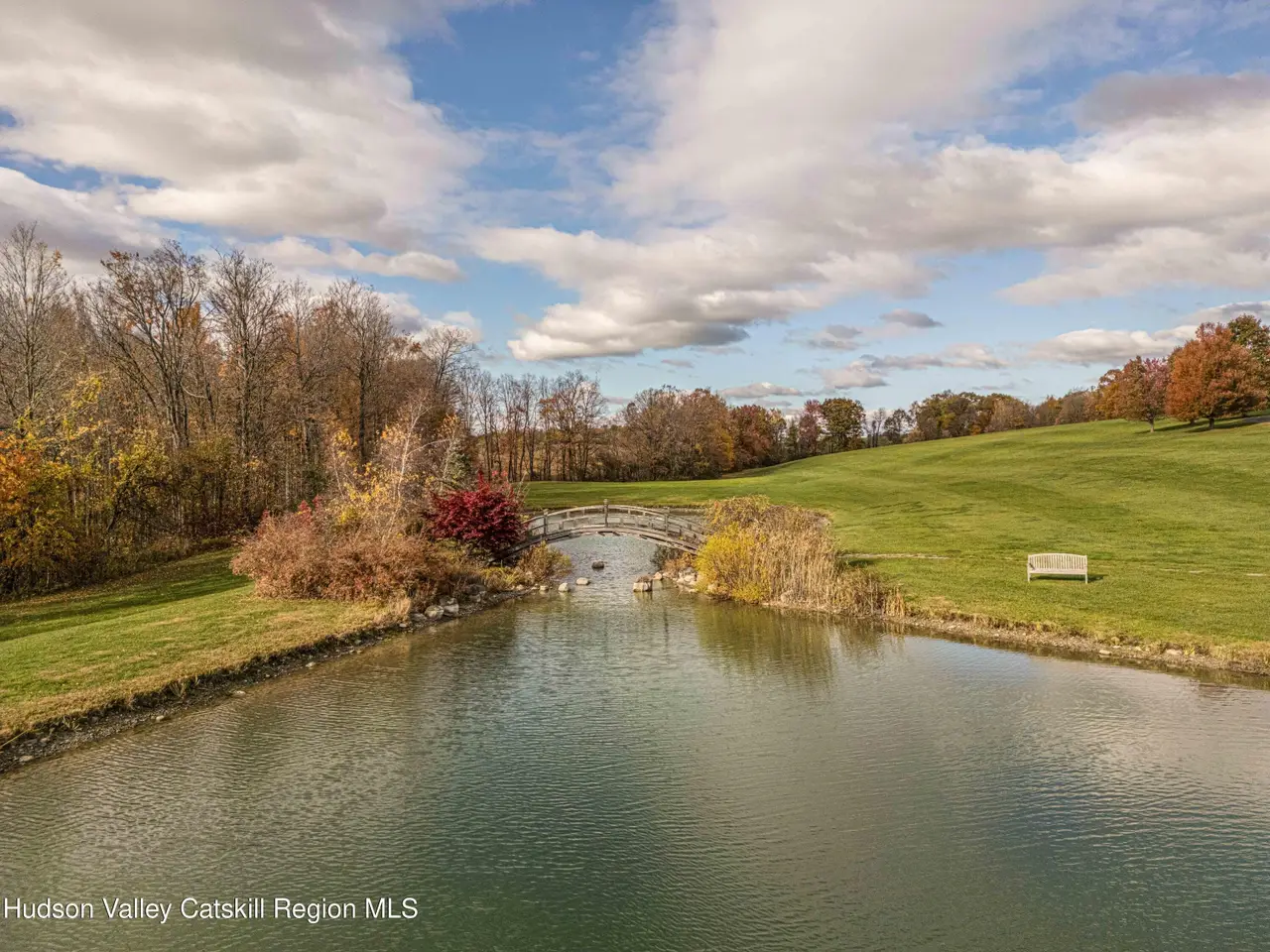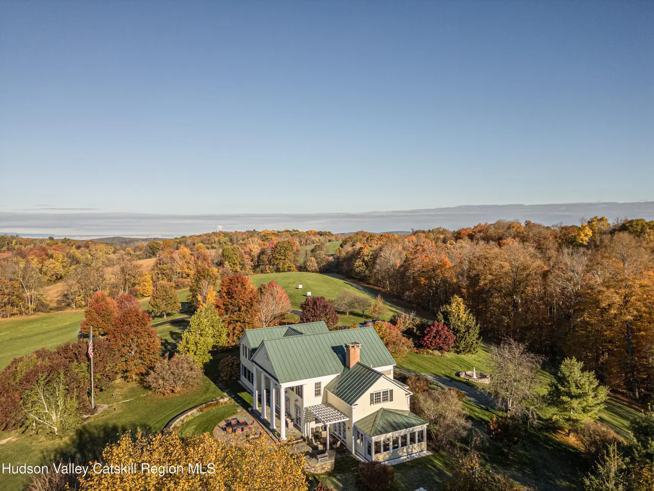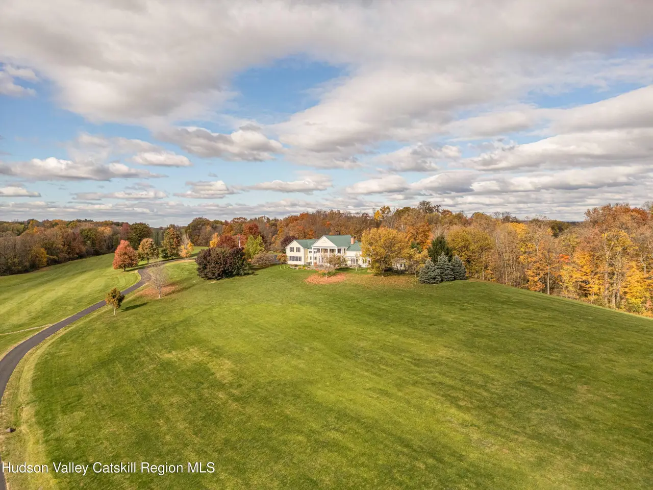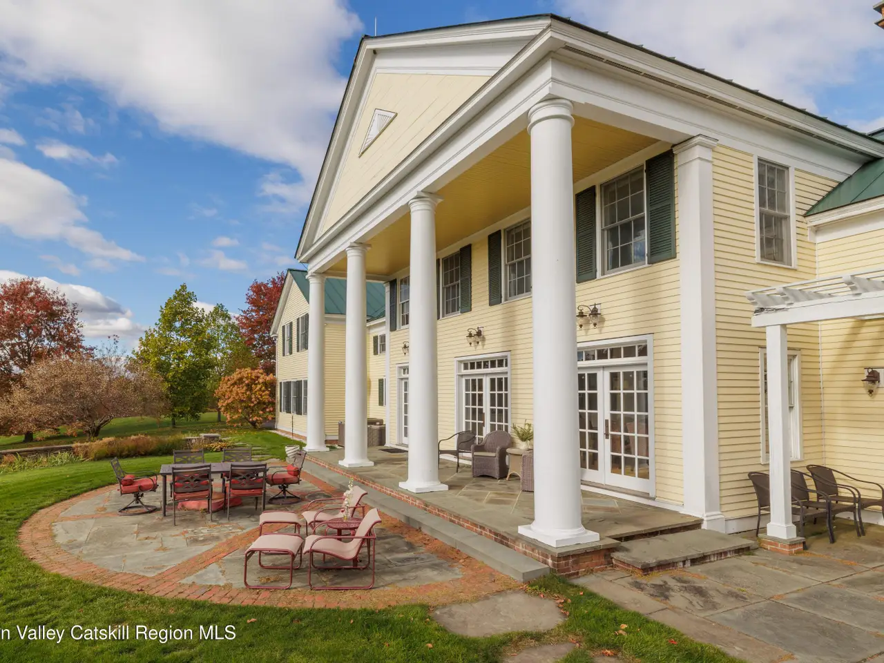 Welcome to Notre Colline Estate, a private country compound set on more than 56 acres of rolling meadows, gardens, ponds, and Catskill Mountain views. French for ''Our Hill,'' Notre Colline has an easy sense of belonging to its landscape. A long-paved drive leads to this elegantly designed 5,760 square-foot home, inspired by classic Greek Revival architecture. Built in 2005 for comfort, entertaining, and longevity, it features a standing-seam metal roof, radiant heated floors, energy-efficient heat pumps, and a fully integrated smart home system that manages lighting, temperature, security, video, and sound. The main level opens to bright, connected gathering spaces centered around a modern chef's kitchen with a large custom island, a counter depth paneled fridge, and professional-grade appliances. French doors from the dining area and breakfast nook open to a wide stone patio with an outdoor kitchen framed by landscaped gardens and open lawns, creating an easy indoor-outdoor flow. A paneled cherry wood office with built-in cabinetry and a wood-burning stove offers a quiet workspace beside a three-season sunroom, and a spacious living room with a gas fireplace invites relaxed evenings with friends and family. Upstairs, the grand primary suite feels like a private retreat, complete with a gas fireplace, two walk-in closets and a luxurious bath with a soaking tub and steam shower. Three additional bedrooms, a guest living room, two full bathrooms and a laundry room complete the second floor. The finished lower level adds generous additional living space with a recreation room, billiards area, kitchenette, sauna and full bath, ideal for guests or wellness use. An attached three-car heated garage features a porcelain tile floor and plenty of space for storage. Outdoors, a peaceful aerated pond lies at the center of the property, crossed by a charming footbridge and bordered by open lawns and walking paths. The grounds also include raised-bed gardens with irrigation, a potting shed, and a newly constructed insulated 26x34 foot outbuilding with water, electric, and space for six or more vehicles. Every detail has been considered for efficiency and ease, from spray-foam insulation and upgraded hydronic systems to improved drainage and a generator. Located minutes from Chatham village, Notre Colline Estate offers refined country living in beautiful Columbia County.