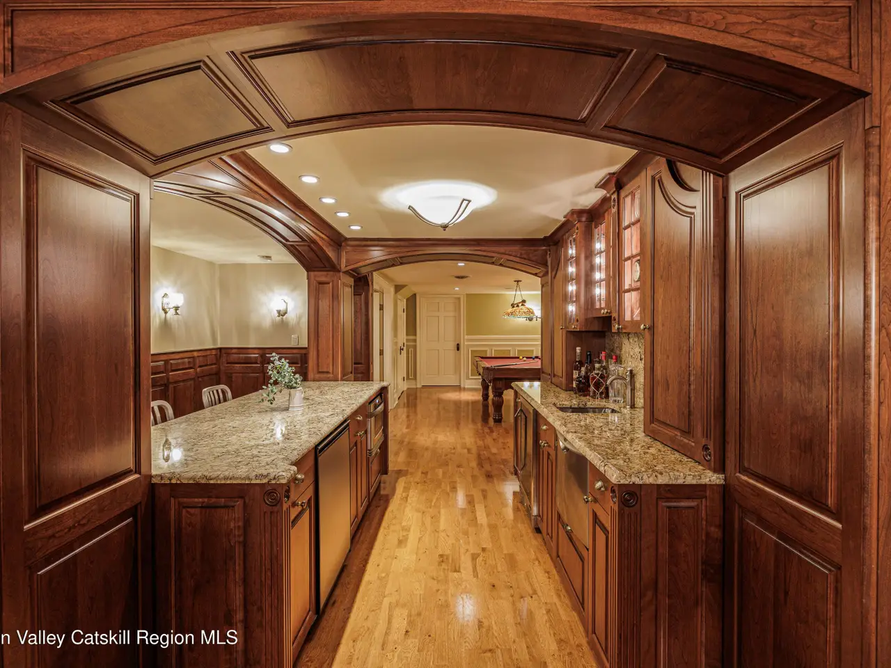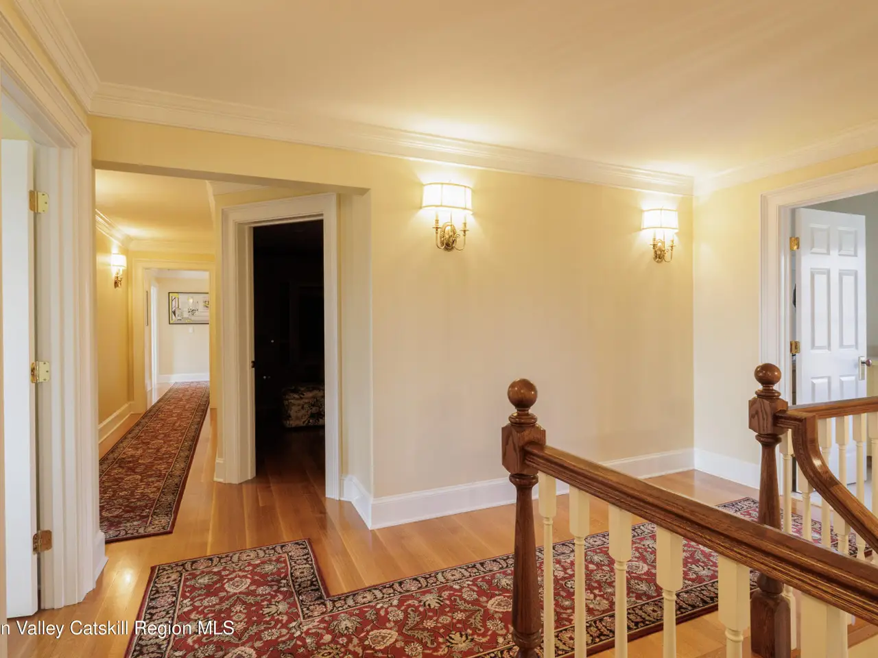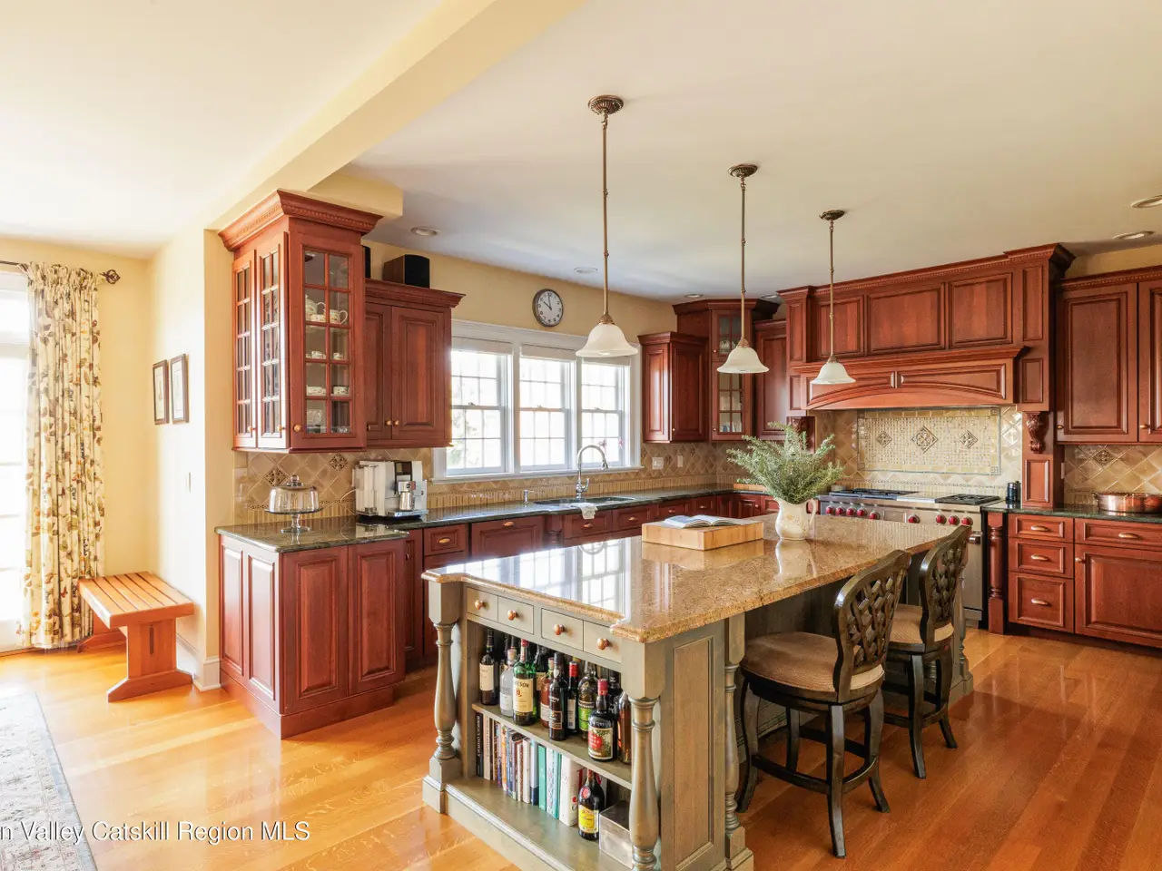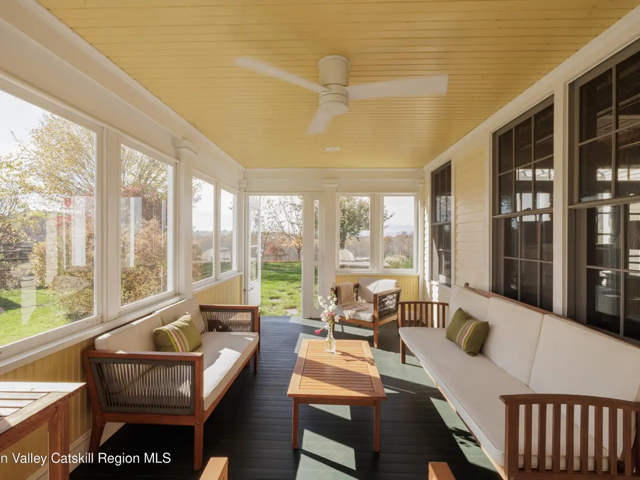 Welcome to Notre Colline Estate, a private country compound set on more than 56 acres of rolling meadows, gardens, ponds, and Catskill Mountain views. French for ''Our Hill,'' Notre Colline has an easy sense of belonging to its landscape. A long-paved drive leads to this elegantly designed 5,760 square-foot home, inspired by classic Greek Revival architecture. Built in 2005 for comfort, entertaining, and longevity, it features a standing-seam metal roof, radiant heated floors, energy-efficient heat pumps, and a fully integrated smart home system that manages lighting, temperature, security, video, and sound. The main level opens to bright, connected gathering spaces centered around a modern chef's kitchen with a large custom island, a counter depth paneled fridge, and professional-grade appliances. French doors from the dining area and breakfast nook open to a wide stone patio with an outdoor kitchen framed by landscaped gardens and open lawns, creating an easy indoor-outdoor flow. A paneled cherry wood office with built-in cabinetry and a wood-burning stove offers a quiet workspace beside a three-season sunroom, and a spacious living room with a gas fireplace invites relaxed evenings with friends and family. Upstairs, the grand primary suite feels like a private retreat, complete with a gas fireplace, two walk-in closets and a luxurious bath with a soaking tub and steam shower. Three additional bedrooms, a guest living room, two full bathrooms and a laundry room complete the second floor. The finished lower level adds generous additional living space with a recreation room, billiards area, kitchenette, sauna and full bath, ideal for guests or wellness use. An attached three-car heated garage features a porcelain tile floor and plenty of space for storage. Outdoors, a peaceful aerated pond lies at the center of the property, crossed by a charming footbridge and bordered by open lawns and walking paths. The grounds also include raised-bed gardens with irrigation, a potting shed, and a newly constructed insulated 26x34 foot outbuilding with water, electric, and space for six or more vehicles. Every detail has been considered for efficiency and ease, from spray-foam insulation and upgraded hydronic systems to improved drainage and a generator. Located minutes from Chatham village, Notre Colline Estate offers refined country living in beautiful Columbia County.