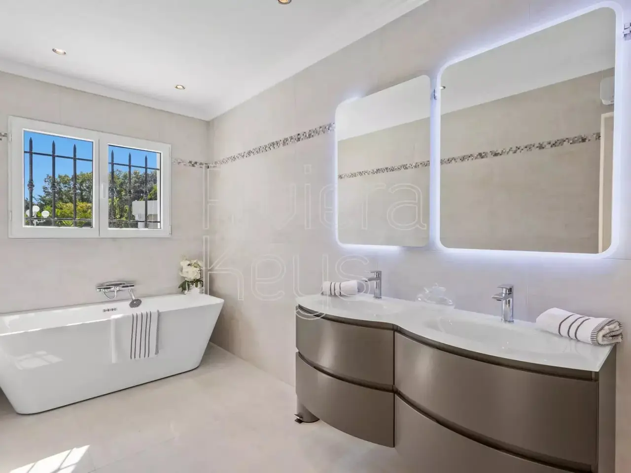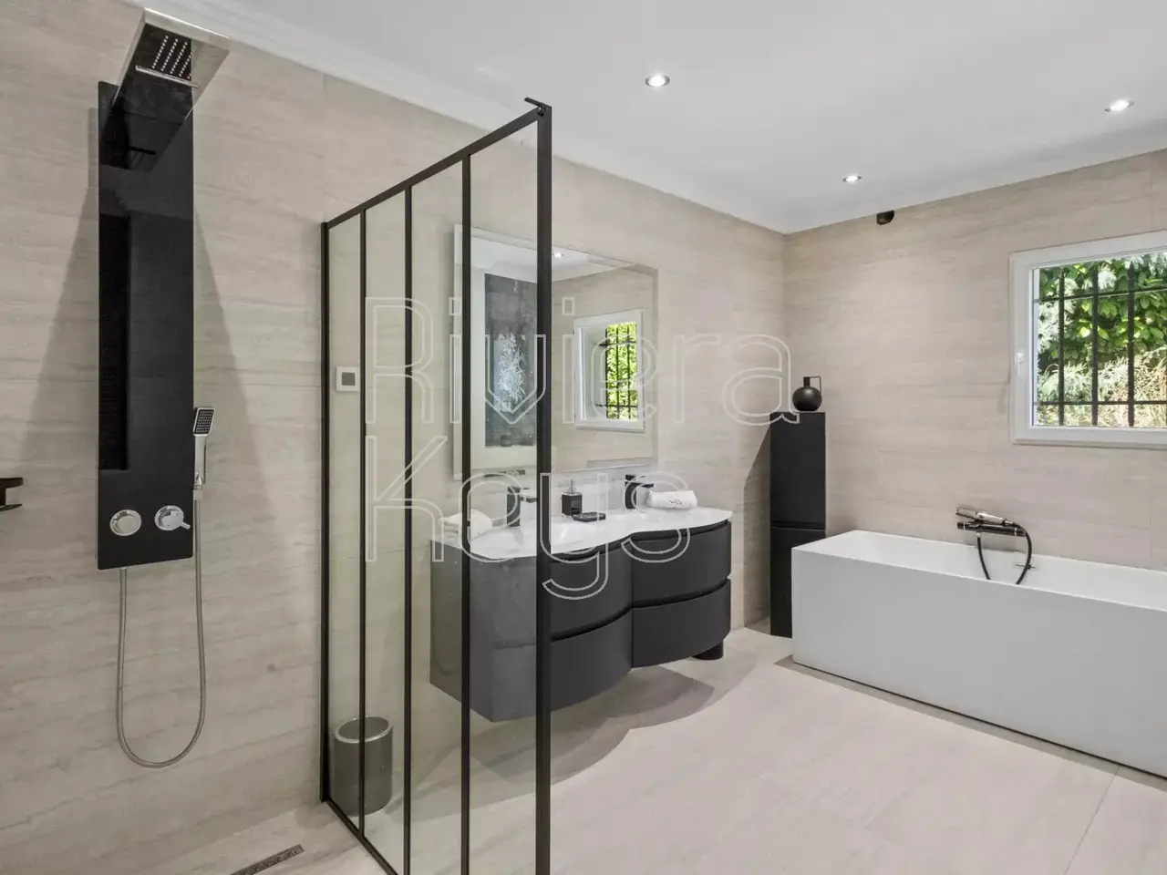 In Vallauris, nestled on the hills, stands a villa fully renovated in 2021. Set on a landscaped plot of 2,555 m², this 280 m² property combines generous volumes with top-quality amenities, enjoying complete privacy.The spacious 70 m² living room opens on one side onto a sun-drenched terrace, and on the other towards the hills of the Niçois hinterland, with a glimpse of the sea. The open-plan kitchen, both stylish and welcoming, perfectly complements the adjoining dining area.4 en-suite bedrooms are located on the main level, each with its own shower room, 2 of which benefit from direct access to the swimming pool and pool house.On the garden level, an independent 80 m² apartment offers 2 additional bedrooms, a shower room, and a large covered terrace facing the landscaped garden. A closed garage and multiple parking spaces within the property complete this exceptional home.
