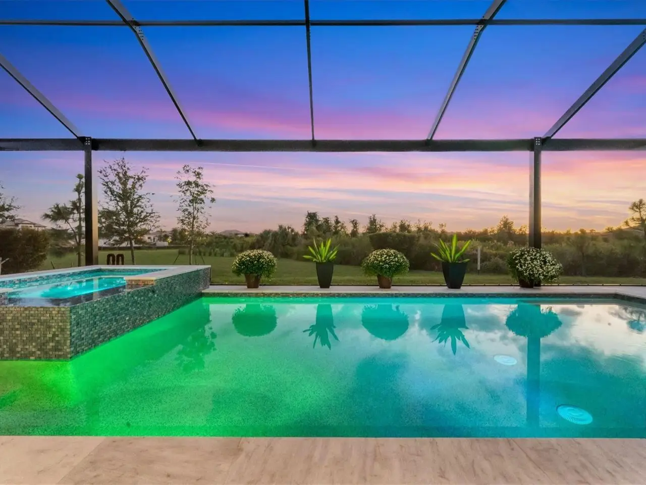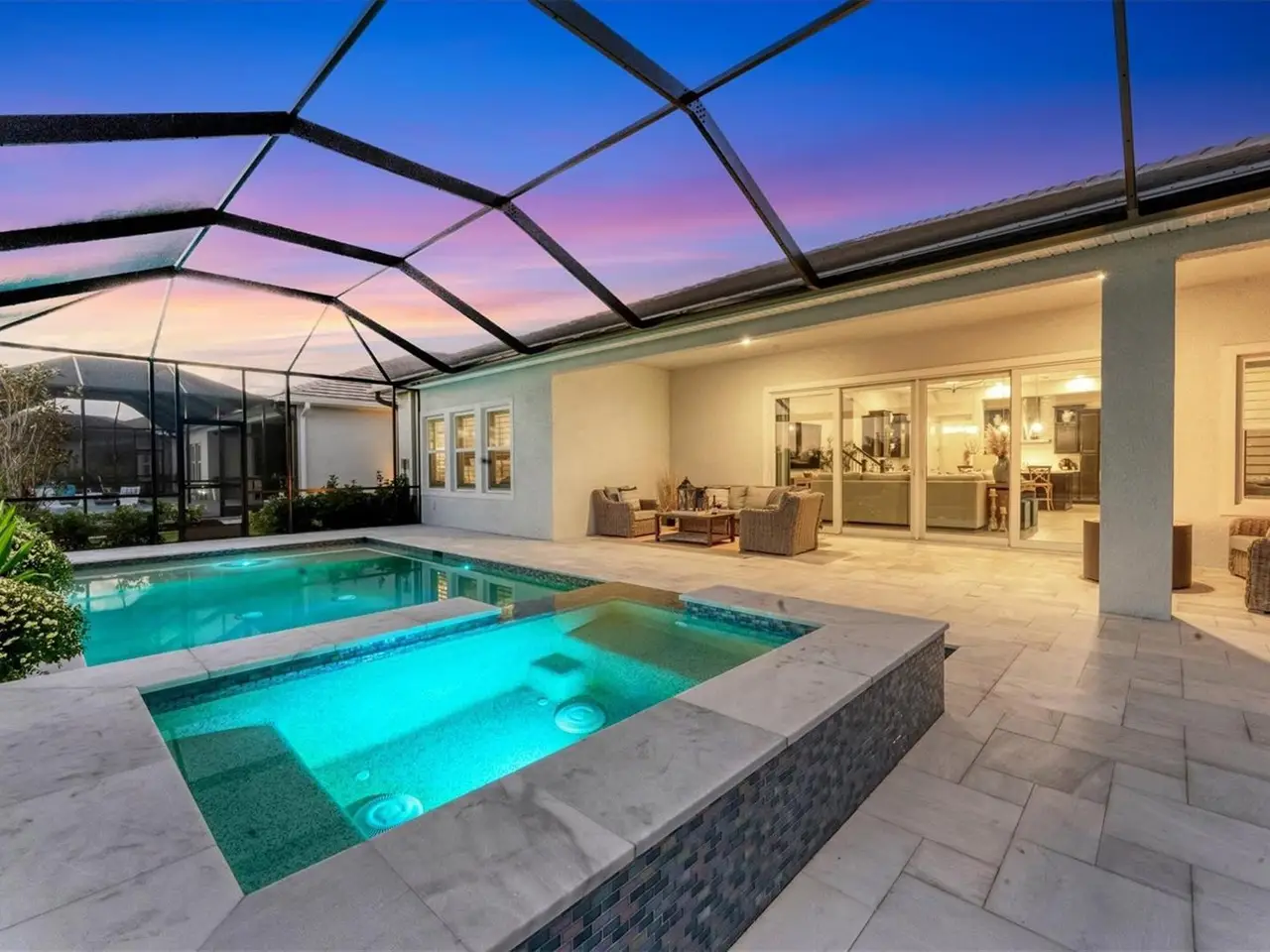 Travertine tile lanai with natural preserve backdrop