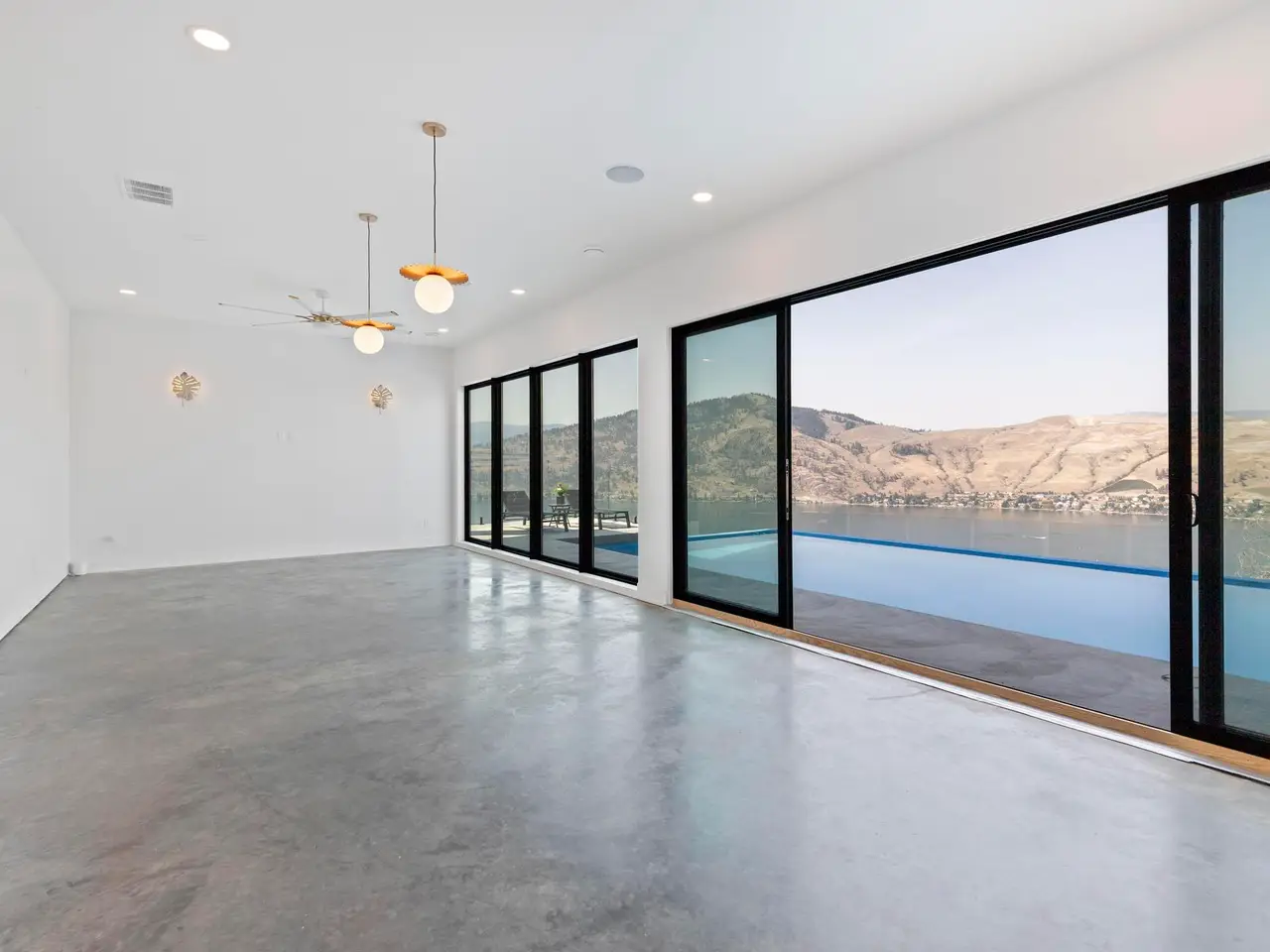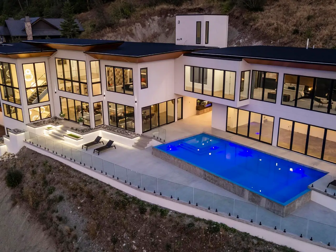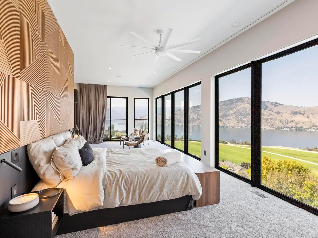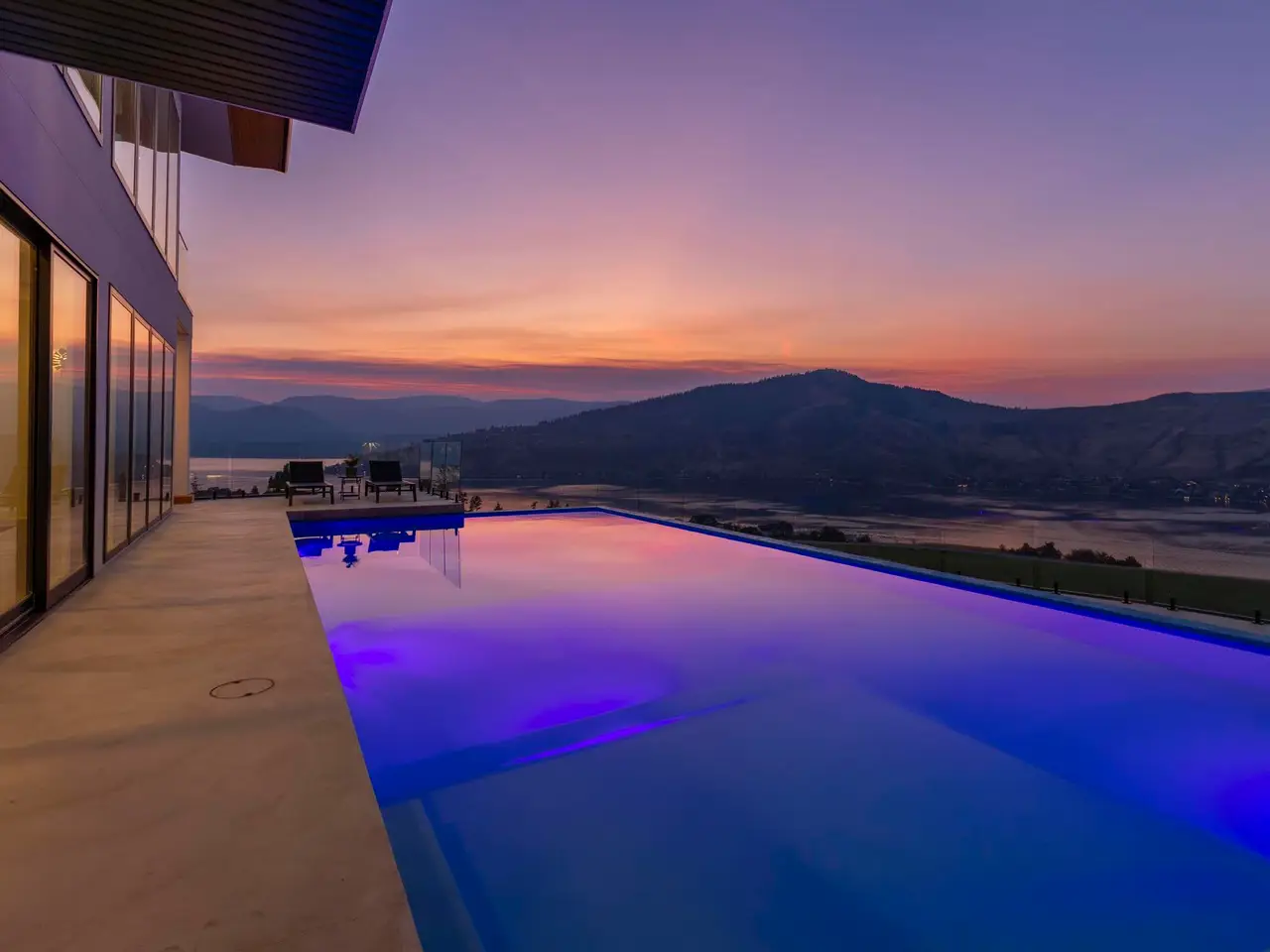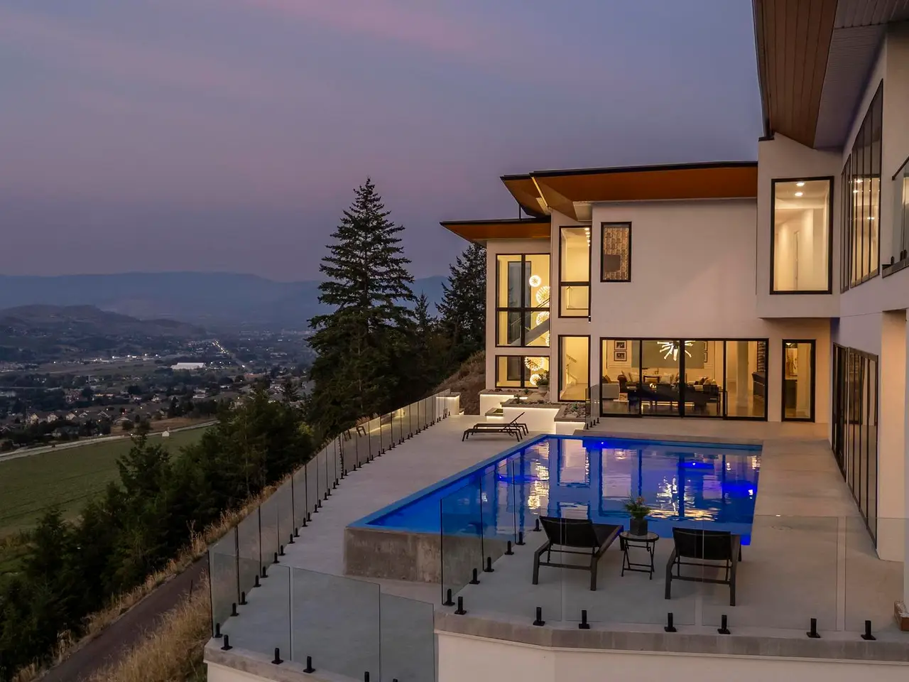 Listed by Unison Jane Hoffman Realty | Experience unparalleled & expansive lake views from a residence meticulously designed to celebrate the natural splendour of the scenery Okanagan situated in the exclusive Beverly Hills estates gated community. Floor-to-ceiling glass throughout creates an intimate connection with outdoors, framing breathtaking views of the lake, mountains, and nearby equestrian fields. Light pours into every space, ensuring you’re bathed in natural beauty every moment. This remarkable 5 bedroom, 9-bathroom home has multiple flex rooms, secret rooms & masterfully blends luxury with functionality and adaptability offering seamless indoor-outdoor living. The main level is anchored by a show stopping kitchen equipped with coffee bar & scullery with exquisite finishing details that flows into expansive living + dining areas. A striking open-linear fireplace creates a warm and inviting atmosphere. The primary suite, a true retreat occupies its own private wing. Encased in glass, it offers uninterrupted vistas and features a spa-like ensuite, spacious walk-in closet equipped with safe room & laundry. Designed for entertaining, the home’s pool area is positioned to preserve the panoramic views, while generous patios extend the living space outdoors. A poolside room offers a versatile space, perfect as a private suite or a dedicated entertaining hub. With a triple garage for vehicles and hobbies and an elevator that connects all three levels, this home is built for convenience and aging in place.