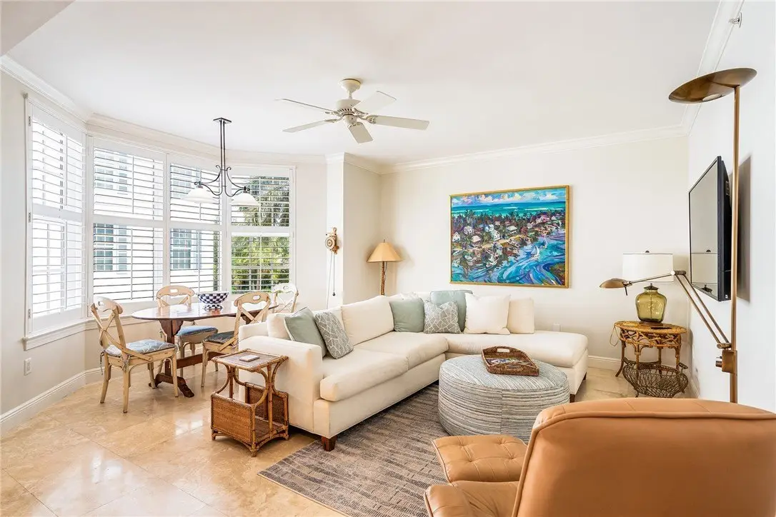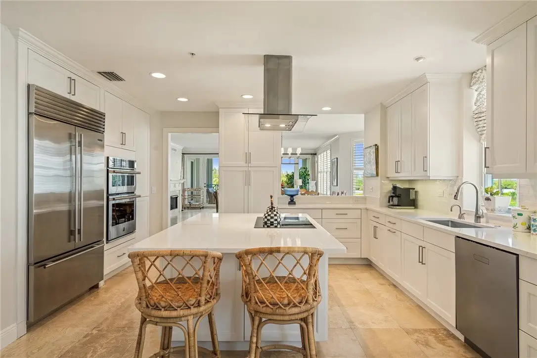 Elegant condo offers unobstructed views of Indian River Intracoastal waterway. Beautifully finished w/Saturnia marble floors in Living Area, custom built-ins, crown moldings, custom window treatments, gas fireplace. New kitchen quartz counter tops, new top of the line appliances, buffet bar, interior painted 2020. New AC units in 2024. Electric roll patio screens, private elevator entry, 2 Car AC garage. Heated pool & fitness room across from Clubhouse. Deeded Beach Access. Seller paid the $35,000 assessment for Exterior Painting, new roof plus the Clubhouse. Incorrect Sq. ft. in tax record.