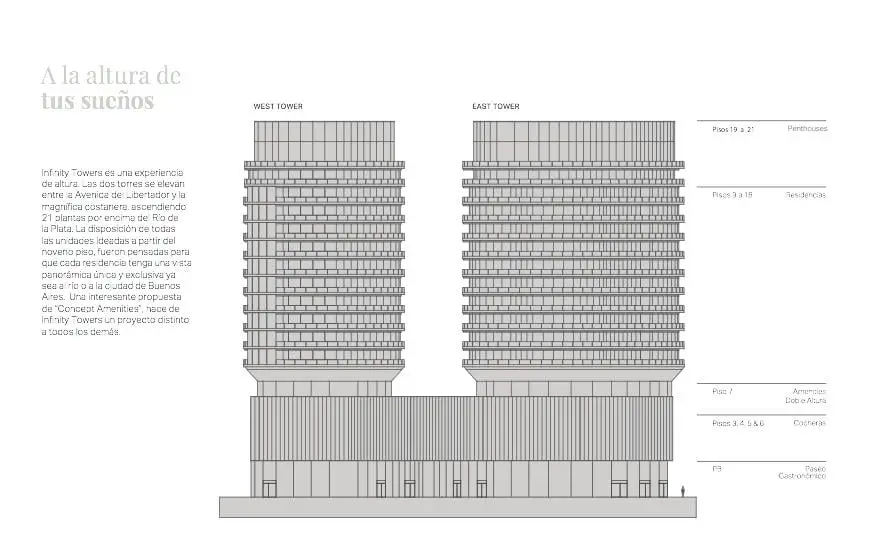 Located at the intersection of Libertador Avenue and Arenales Street, the distinctive residential building stands in Vicente López. It has a ground floor of commercial premises that adds more than other offers in the area. The building is made up of three basements, ground floor, two between floors and 18 more floors. The units are distributed in the two elliptical towers from 24 meters high, ensuring that all units have views from above, towards the Río de la Plata and/or the City of Buenos Aires. The 130 units have 161 parking spaces. Units of 2, 3, 4 and 5 rooms. 14 penthouses of 3 levels. 8th floor amenities: SUM, meeting rooms, indoor pool, gym, sauna and grills. Ask about other units! The property offered is not accessible for people with reduced mobility. Details Total area: 404 m2 Type: Apartment Bedrooms: 3 Age: Brand new Bathrooms: 2 Toilettes: 2 Covered area: 307 m2 Uncovered area: 55 m2 Semi-covered area: 41 m2 Rooms: 4