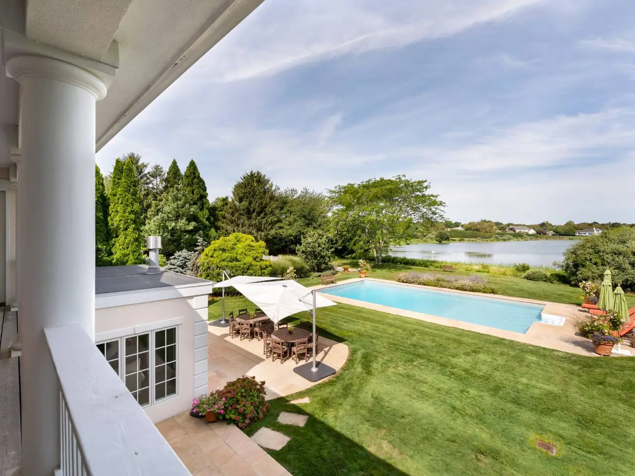 This beautiful private Mediterranean style sun filled 8,000 square-feet of living space, west oriented pond front with great sunsets over tranquil waters is located in coveted Estate Section of Southampton Village. House has been totally renovated to the highest standards. The interior renovation features grey hardwood floors throughout, brand new top of the line kitchen including professional chef 6 burning viking stove, hood and grill plus double ovens, double dishwasher, ice maker, wine cooler and sub zero refrigerator; the all brand new white kitchen also includes a eat-in dining and casual seating TV family room with fireplace and french doors leading to the magnificent mature landscaping grounds and outdoor terraces, as well as to the 25x50 heated waterside gunite pool, sunken har-tru tennis and bocce courts. The six bedroom, 5.5 bath has been also totally renovated plus, each bedroom has new flat TVs. Enjoy total privacy at the superb 1,200 square foot master suite with a unique state of the art just upgraded and redone 360 square foot master bath with his and hers separate vanities and a 8-foot shower including two showers heads. Additional features are formal dining room, cathedral ceilings formal living room with fireplace, library/den, finished lower level with gym, pool table and media TV room area including extra bedroom and full bath with private entrance. This house has it all! Available two weeks in August thru LD 2023.
