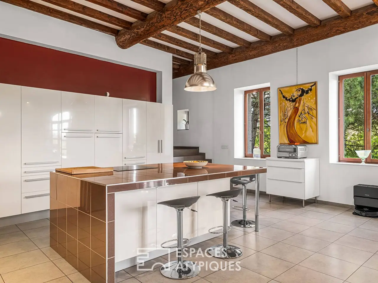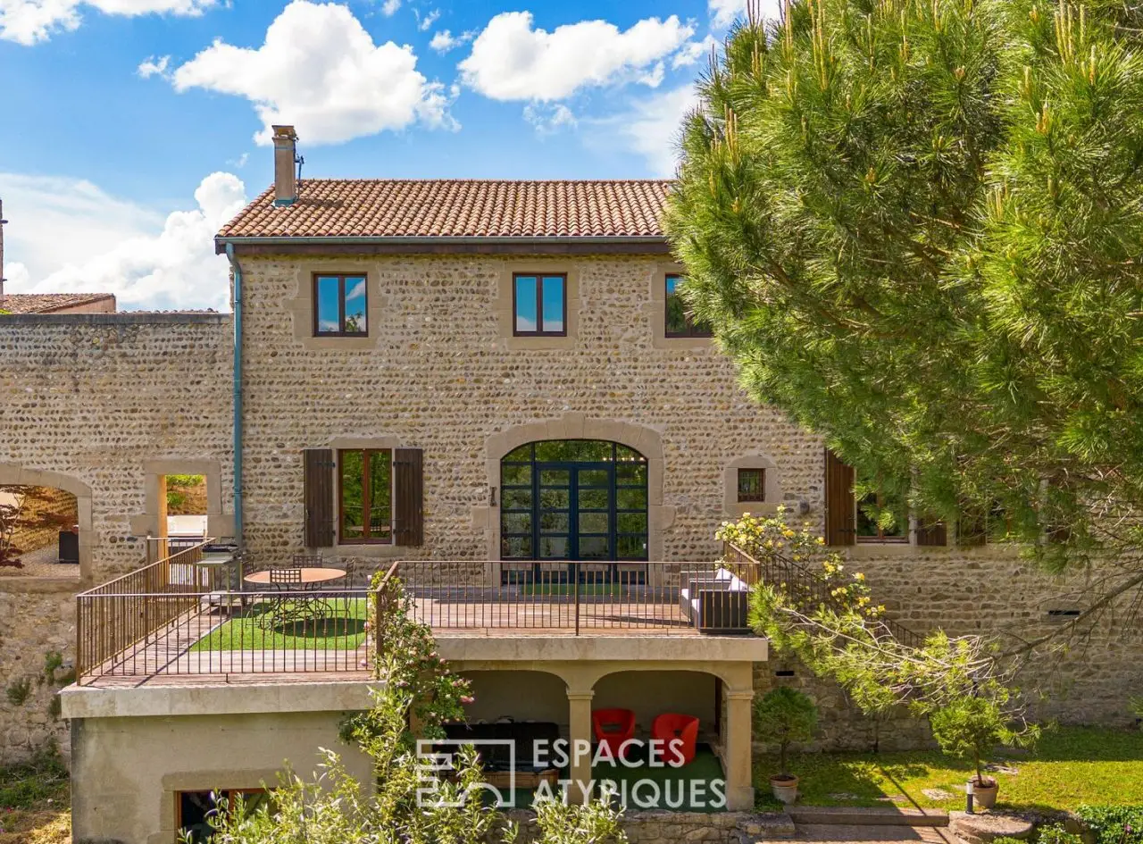 Located in Vourles, southwest of Lyon, this old farmhouse has been carefully transformed into a loft-style home. Behind its stone walls, the property reveals a warm atmosphere, blending old-world charm with a modern renovation. Exposed beams, raw materials, open spaces, and contemporary finishes create a harmonious balance. The property exudes a true personality, rare within 20 minutes of Lyon.The house offers 240 sqm of living space on a 2,975 sqm wooded plot. It includes four bedrooms, including a master suite, an office, a wine cellar, and a tasting room. The living areas boast high ceilings and generous volumes. The fluid and functional layout has been designed to accommodate all lifestyles, from shared moments to more intimate spaces. Outside, the landscaped garden offers a privileged setting, with no overlooked views.A carefully designed Japanese garden, a jacuzzi, and vast green spaces extend the interior volumes in a spirit of tranquility. The unobstructed view and the ambient calm reinforce the feeling of being elsewhere, while remaining close to the city. This property seduces with its singularity, its character and the quality of its renovation. A house of character, designed as a unique place to live, in the heart of nature, at the gates of Lyon.ENERGY CLASS: E / CLIMATE CLASS: B Estimated average amount of annual energy expenditure for standard use, established from energy prices for the years 2021, 2022, 2023 (subscriptions included): between EUR4,660 and EUR6,360.Contact: Florian - 06 14 12 03 34REF. 11041-1Additional information* 7 rooms* 4 bedrooms* 1 bathroom* 1 bathroom* Outdoor space : 2975 SQM* Parking : 6 parking spaces* Property tax : 1 900 €Energy Performance CertificatePrimary energy consumptione : 284 kWh/m2.yearHigh performance housing*A*B*C*D*284kWh/m2.year9*kg CO2/m2.yearE*F*GExtremely poor housing performance* Of which greenhouse gas emissionsb : 9 kg CO2/m2.yearLow CO2 emissions*A*9kg CO2/m2.yearB*C*D*E*F*GVery high CO2 emissionsEstimated average annual energy costs for standard use, indexed to specific years 2021, 2022, 2023 : between 4660 € and 6360 € Subscription IncludedAgency feesThe fees include VAT and are payable by the vendorMediatorMediation Franchise-Consommateurswww.mediation-franchise.com29 Boulevard de Courcelles 75008 ParisInformation on the risks to which this property is exposed is available on the Geohazards website : www.georisques.gouv.fr
