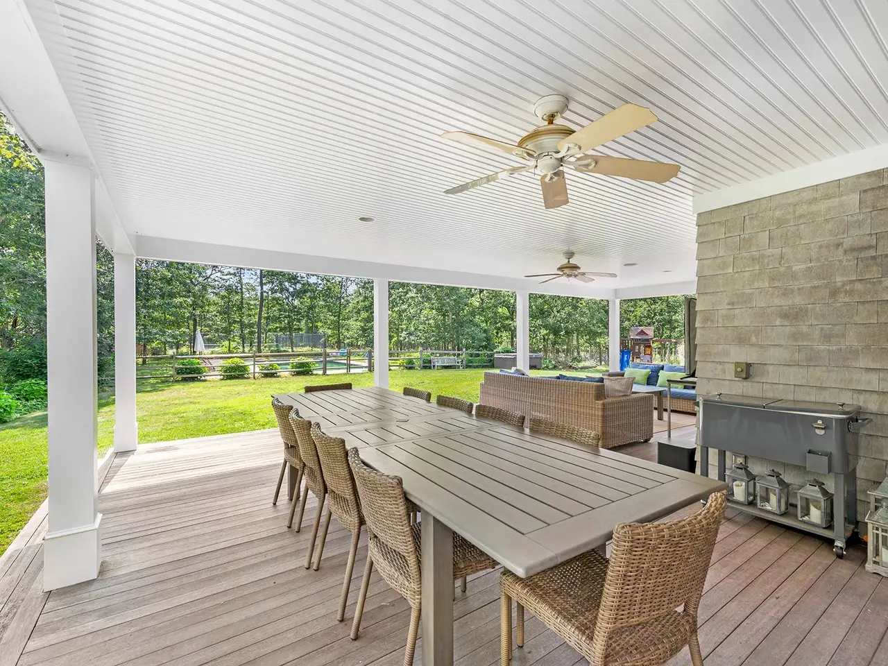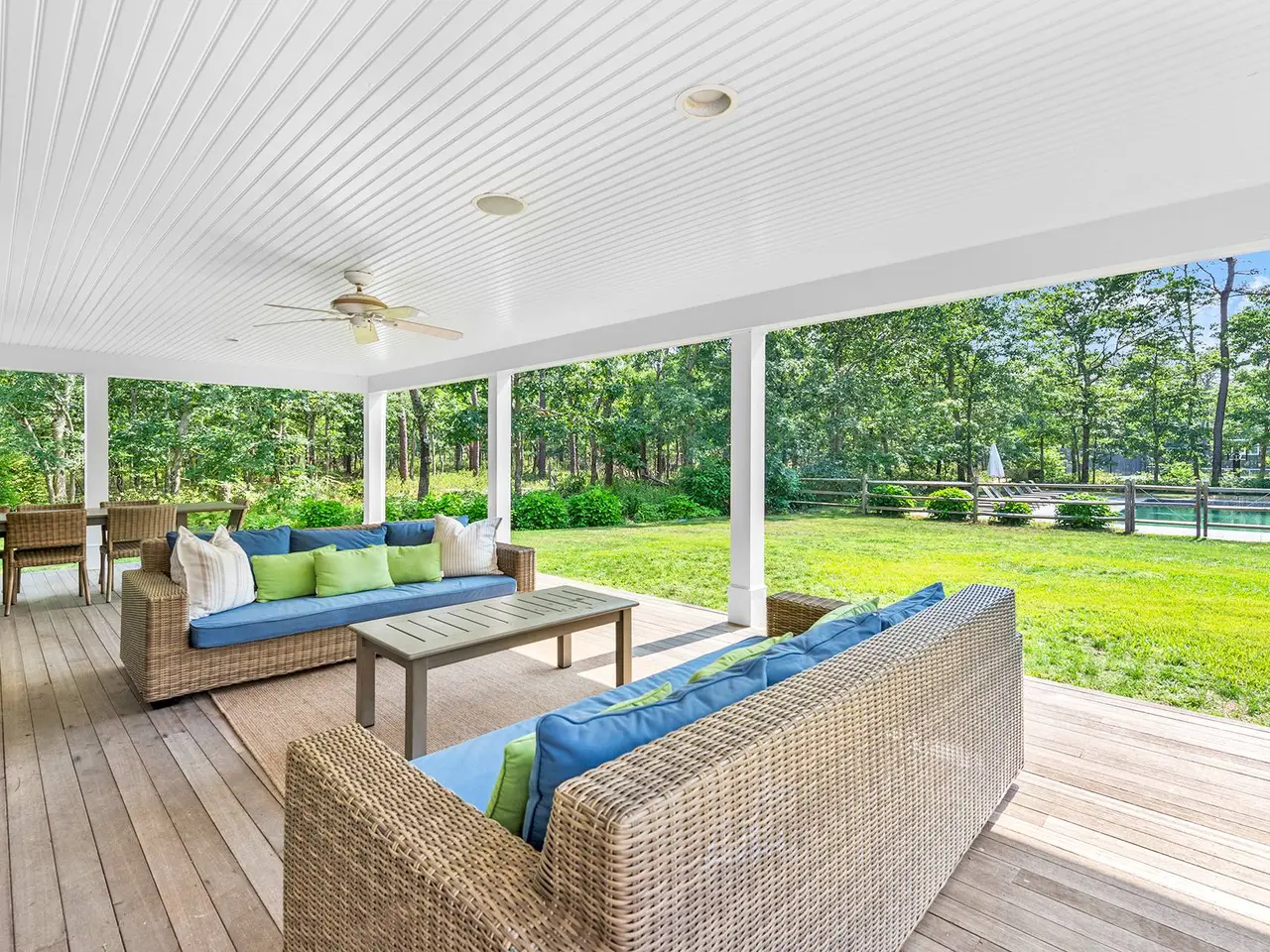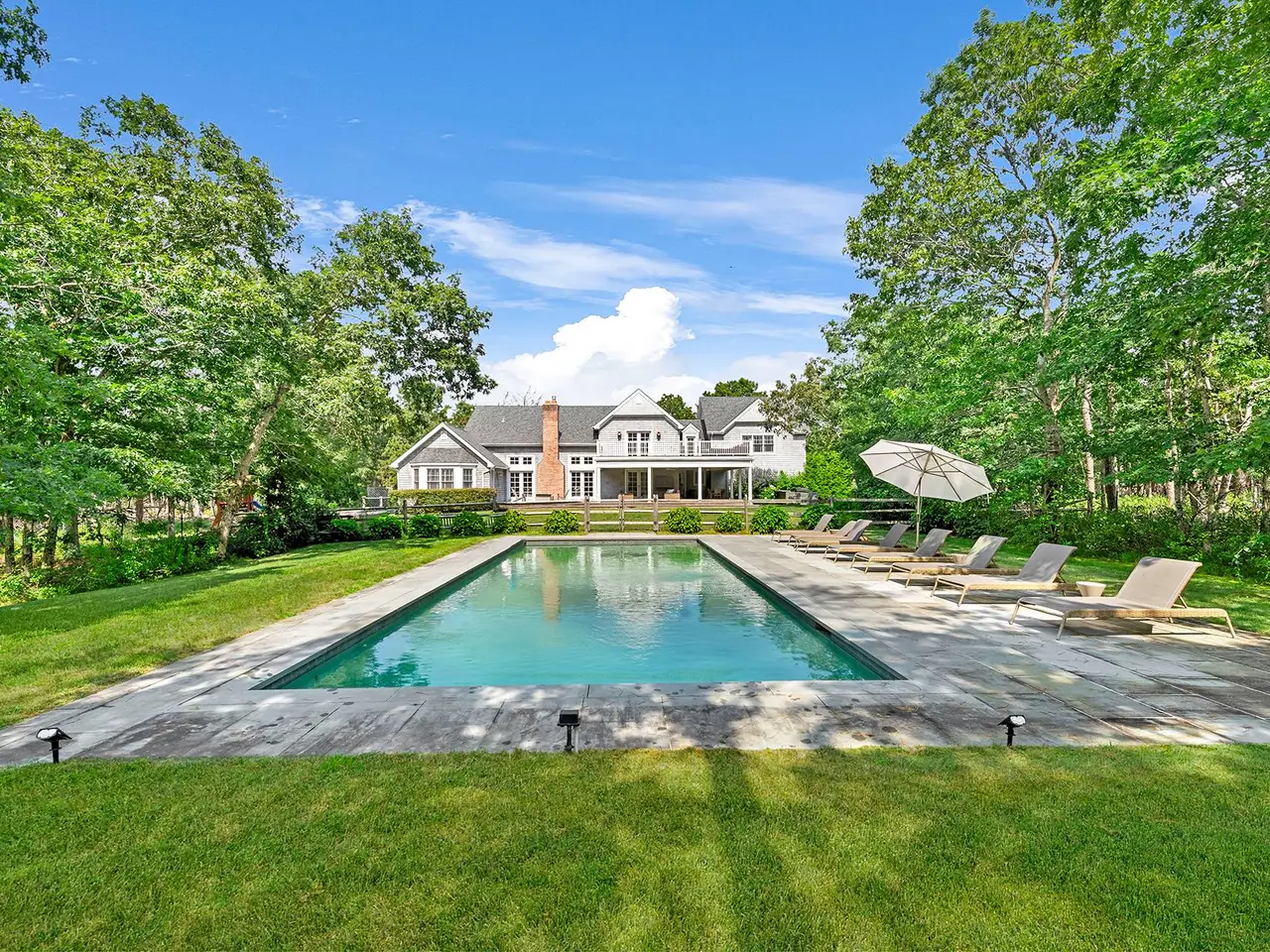 Privacy abounds in this beautifully renovated Wainscott traditional home. Sited on 5.5 acres with deco turf tennis/basketball this 4,500 square feet with 2,500 square foot lower level seven bed, 6.5 bath is the perfect summer rental. As you enter the grand open living areas, you are greeted with tons of natural light from a wall of French doors that open to expansive outdoor deck area. The living room flows into dining area and huge eat-in renovated chef's kitchen with island seating, marble counter tops, stainless steel appliances and breakfast area with window seating. Bedrooms and baths consist of a first floor primary suite with vaulted ceilings, access to the backyard and a renovated expansive en suite bathroom. There is another main floor bedroom as well. The second floor boast an additional primary bedroom with double granite vanity and soaking tub and access to a 2nd floor decked balcony. There are 3 other oversized en-suite guest bedrooms. The newly finished lower level consists of two more bedrooms, movie/media room and gym. The back deck has expansive covered seating and dining areas with outdoor kitchen with DCS grill that looks onto a beautifully landscaped yard and 20x40 heated gunite swimming pool. Beyond the pool lies the tennis court with basketball net that is perfect for all sports lovers. Other features include a new Jacuzzi, a two-car garage, and an outdoor shower. There's easy access to East Hampton and Sag Harbor villages! Prime location and close proximity to both bay and the ocean beaches.