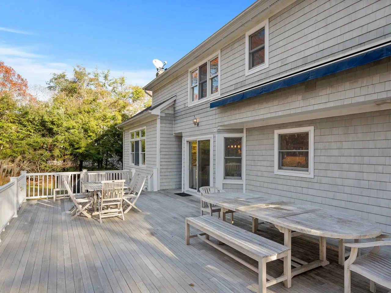 Newly renovated, 4+ bedroom rental with pool on Georgica Woods Lane in Wainscott. Enter a beautifully furnished sanctuary that exudes grace and elegance at every turn. The sun-drenched living room boasts double-height ceilings, an abundance of glass, and charming exposed beams, creating a bright and airy atmosphere. Whether you're hosting a gathering or enjoying a quiet evening, this space is sure to impress. For entertainment, the home features both a playroom and a media room, offering endless options for fun and relaxation. The large, informal eat-in kitchen and dining area are perfect for casual meals and lead seamlessly to a spacious dining deck, ideal for alfresco dining. The kitchen is a chef's dream, equipped with top-of-the-line stainless steel appliances, a large island, and breakfast bar stools for a comfortable and inviting space. Outside, you'll find a stunning 50-foot pool surrounded by pristine white stone decking, providing the perfect spot to lounge and soak up the sun. The second level houses four generously sized bedrooms and two newly renovated bathrooms, ensuring ample space and comfort. Additionally, a separate renovated full bathroom on the main level offers convenient access to the pool area. Situated in an unbeatable location, this home is equidistant from East Hampton and Bridgehampton, placing you just minutes away from the breathtaking ocean beaches of Sagaponack and East Hampton. Enjoy the best of both worlds with easy access to vibrant village amenities and serene coastal retreats. Don't miss the opportunity to make this exquisite home your summer haven. Listing ID:917635
