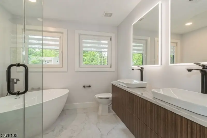 Welcome to 45 Roseland Avenue, a new construction contemporary custom Colonial. This is a wonderful opportunity to own this meticulously built home in the highly desirable Warren Township. From the moment you step in you will be amazed by the custom moulding and impressive millwork, the coffered ceiling and gorgeous hard wood flooring throughout . The chef inspired kitchen features all BOSCH appliances, quartz countertops, tile back splash, and huge center island with wine/beverage fridge. Also on the first level is a dining room, family room with handsome gas fireplace, office and powder room. The second level features a primary bedroom with custom millwork, tow closets and spa bath. There are also 3 well appointed bedrooms, full bath and laundry room on the second level. The third level boasts a huge finished recreation room - use this to create a home theater, playroom, exercise room. There is a finished basement with half bath waiting for you as well. The exterior boasts beautiful paver driveway, walkway, patio and fenced in yard. Situated on a level lot this home is the total package waiting for YOU!. Close to shopping, restaurants, parks with proximity of all major highways , NJ transit trains to NYC.