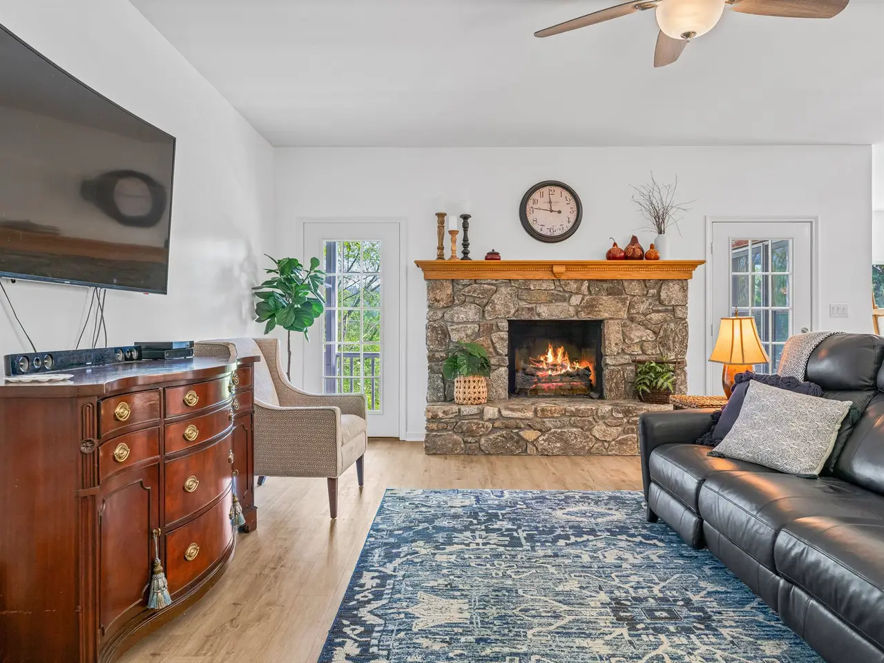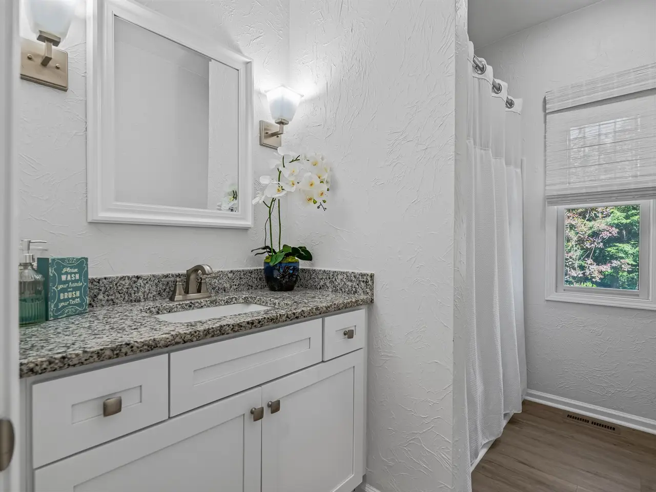 Elegant brick home in the coveted Reems Creek Golf Community, offering wonderful mountain views and showcasing an open, updated floor plan across two beautifully finished levels. Freshly painted and impeccably maintained, the main level features a vaulted great room with stone fireplace and German schmear finish, chef's kitchen with granite counters, black stainless appliances, and breakfast nook. The luxurious primary suite includes vaulted ceilings, spa bath with walk-in tiled shower, soaking tub, and custom closet. Two additional bedrooms, 1.5 baths, laundry, and oversized garage with workshop complete the main level, along with a covered porch and open deck. The lower level boasts a spacious second living quarters with great room, fireplace, second kitchen, second primary suite with ensuite bath and custom closet, fitness/game room, two storage rooms, and covered patio. Minutes to downtown Weaverville and Asheville. Optional golf and social memberships available at the clubhouse.