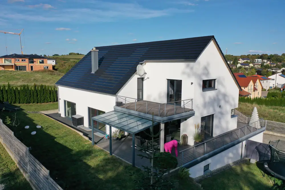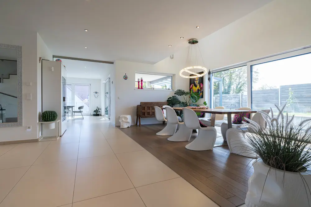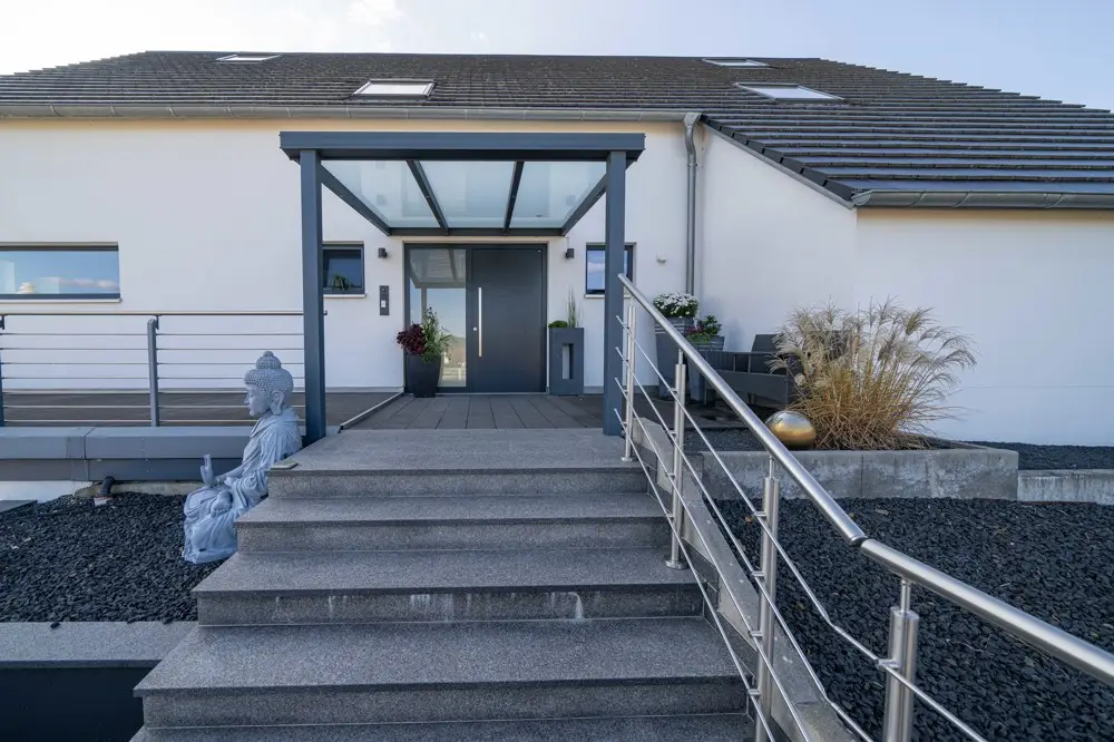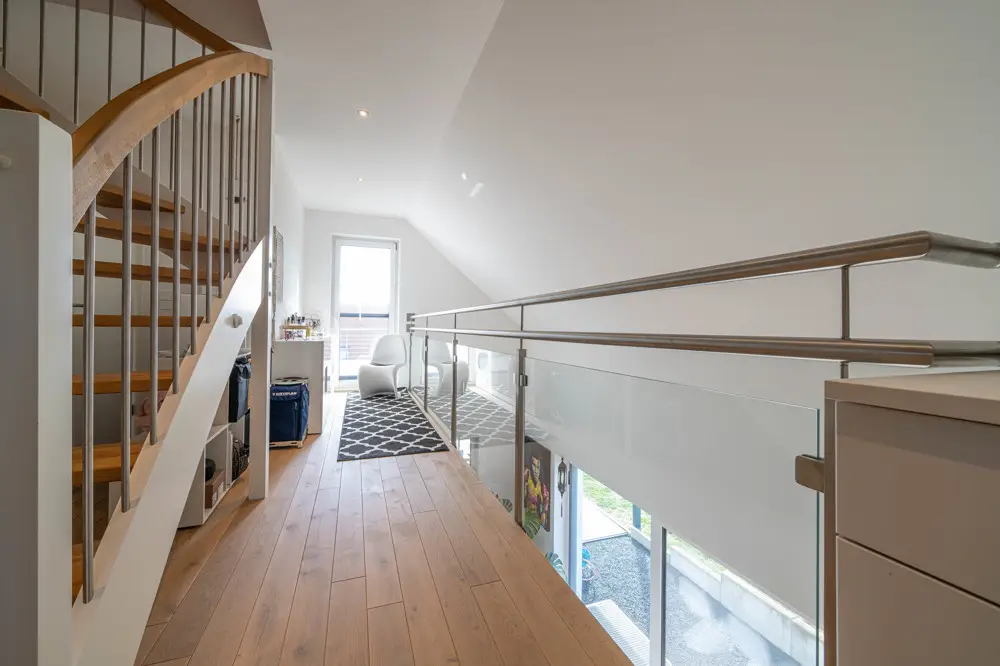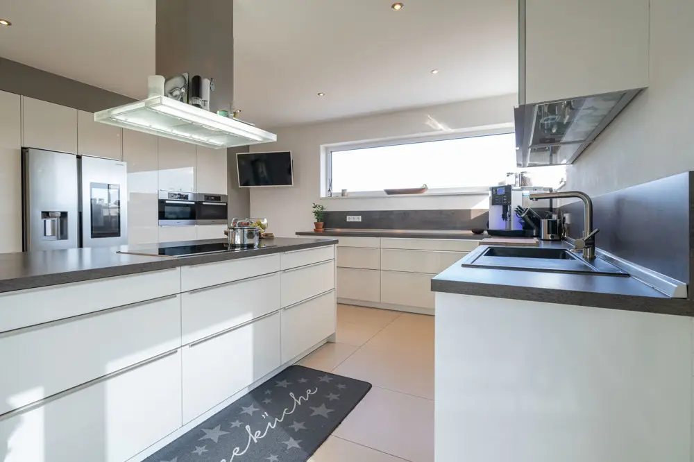 This attractive architect-designed house was built in 2012 according to the owner's personal wishes. Particular emphasis was placed on high living comfort, design and the best construction quality. The result is a modern, well thought-out home with a spacious floor plan and high-quality, elegant furnishings. Large glass windows and doors, natural stone floors and real wood parquet dominate the materials used. Overall, this property offers an ideal home for a family that appreciates luxury and modern amenities. In the impressive living and dining area, you can expect airy ceiling heights and bright natural stone; the floor-to-ceiling windows ensure that the rooms are flooded with light. One highlight (of many) is the visually and functionally high-quality designer panoramic fireplace and the homely fitted kitchen as part of the overall concept of extravagant furnishings. A large sliding glass door separates the kitchen from the dining/living area. The panoramic fireplace separates the dining area from the living room and is fitted with glass on both sides. The elegant fitted kitchen from Leicht with its many technical refinements and a modern cooking island leaves nothing to be desired with its high-quality Siemens, Miele and Whirlpool appliances: Induction hob, Silence dishwasher, modern oven and an American fridge with ice cube maker. From the kitchen, a floor-to-ceiling sliding glass door leads to the stylish covered terrace with fantastic views of the natural surroundings, allowing you to relax after work. The terrace is laid out around half the house, guaranteeing an uninterrupted view of the city. The landscaped lawn surrounds a large part of the house and is fenced off with wooden privacy screens and plants. Adjacent to the living area on the first floor, you will find a guest bedroom and an en suite bathroom with equally impressive modern fittings. The numerous spotlights and the LED strip in the open-plan area make the first floor ceiling shine brightly. A checkroom and a guest WC with urinal complete the offer on the first floor. A spacious open gallery is centrally located on the top floor. From here, you can access the bright bedroom with a practical dressing area and a master bathroom en suite with luxurious fittings. You will find a large walk-in shower, a spacious deep-soaking bath, WC, bidet and two washbasins. From the sleeping area and the gallery, you have access to the wonderfully large balcony and can enjoy the view of the natural surroundings from here. Two further well-designed, bright and spacious rooms complete the sleeping area on this floor. An open staircase leads to the attic, which has been converted into a studio. Only limited by sloping ceilings, you have another living area here, e.g. as a play area for children, a guest area or for your home office. In the converted basement you will find the boiler/technical room, a heated anteroom with built-in cupboards, a fitness room with wellness area (sauna and shower), a separate laundry room and a fully equipped home cinema. An additional storage room and a further guest WC complete this area. You have direct access to the garage from the entrance hall and the utility room. Here you have enough space for 4 large cars and other various vehicles and objects. A car enthusiast will really appreciate this garage with access in the house. The garage floor has been coated with a self-leveling reaction resin mortar and additionally sealed. An electric double garage door is a matter of course here. In front of the garages, you have numerous other parking options for your guests in the spacious courtyard. The entire house (including the basement) is heated by underfloor heating using a heat pump. The Creaton roof panels in black matt, including a fully integrated photovoltaic system, give the house a modern look, support the energy supply in the house and ensure low heating costs. The exterior railings are made of stainless steel and the terrace boards are fitted with an aluminum substructure. Electric roller shutters provide comfort and security. The house has a total of 6 rooms, including 4 bedrooms and a studio. There are also 2 guest WCs and 2 bathrooms, a sauna with wellness shower, fitness room and home cinema. This architect's house is situated on a slope and is a rare highlight. Let us convince you of its noble overall concept during a personal viewing. Please understand that we only allow viewings on presentation of a financing confirmation. VON POLL FINANCE can assist you with this. Our colleagues will be happy to provide you with a mortgage certificate free of charge and without obligation.