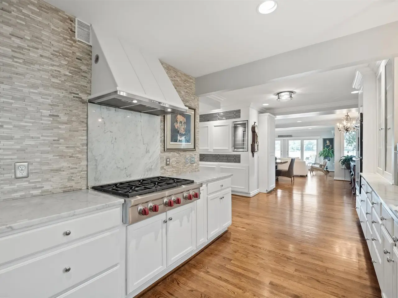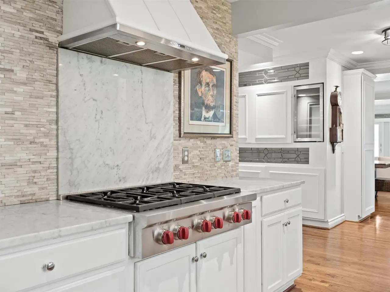 White marble kitchen with stacked stone backsplash