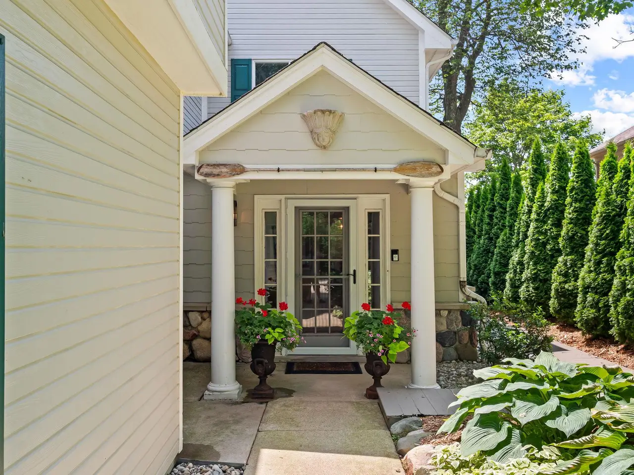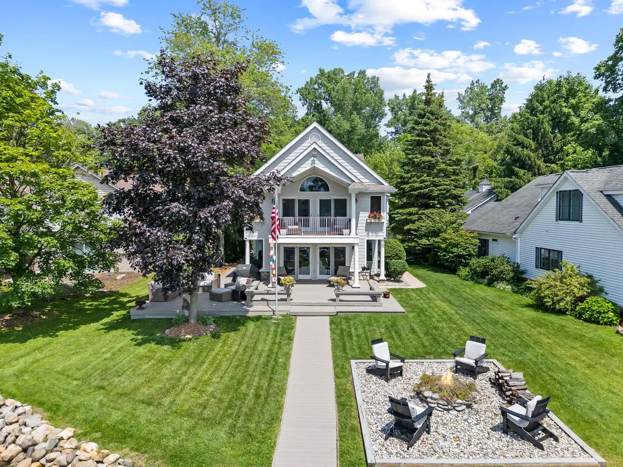 Lakefront living with 65’ of frontage on Green Lake. Take your pontoon out for relaxing, sunset cruises on the electric motor-only lake. A welcoming entry opens to bright living spaces that flow effortlessly outdoors. Glass front door flanked by transom windows. White marble kitchen, stacked stone backsplash, Shaw’s farmhouse sink, six-burner Wolf gas cooktop, hood fan, Kitchen-Aid double oven, GE refrigerator, Whirlpool dishwasher & beverage refrigerator. The open-concept floor plan connects the kitchen to the great room. Natural fireplace. Side-by-side Anderson doorwalls open to the deck for seamless indoor-outdoor entertaining. Hardwood floors throughout the entire home. Flexible floor plan offering an entry-level library/den, which can double as a guest suite as it is adjacent to a full bathroom with a rain shower & glass door. Wake up each morning to panoramic lake views from your primary suite balcony, a perfect setting for your morning coffee! Vaulted ceiling, walk-in closet & built-ins. Two additional bedrooms, one with a loft kids will love! En-suite bedroom with private balcony overlooking the lake. Second-floor bonus room could be used as a secondary primary, family room, exercise room or office, with a full bathroom. Anderson windows capture water views from nearly every room. Epoxy garage floor, additional space for workshop & storage. Extra-wide concrete driveway for guest parking. Surrounded by lush landscaping. Arborvitae lined side walkway to the backyard. Stunning western sunset views. Large lakeside deck, with built-in benches, is the perfect setting for evening cocktails with friends & family. Enjoy conversation & s'mores around the stone fire pit. Rock seawall. L-shaped dock with room for sun loungers, wonderful sandy shoreline. Green Lake Association offers year-round activities for the entire family, with 4th of July fireworks. Very quiet & peaceful setting, Willow Pond Nature Preserve across the street. This home delivers on the lake lifestyle!