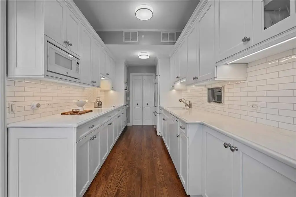 • Custom cabinetry and elegant quartz countertops in the kitchen