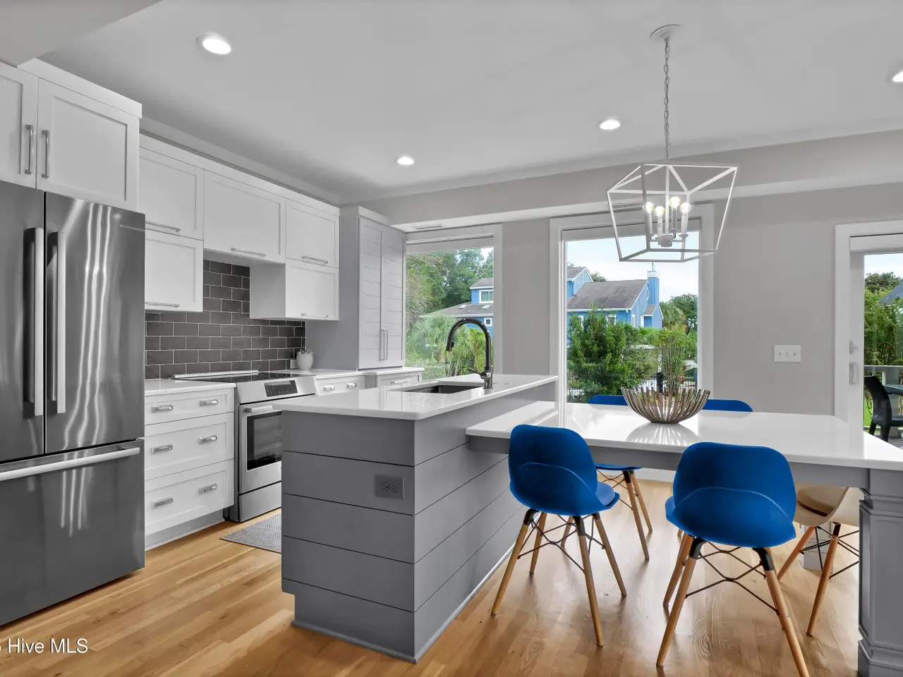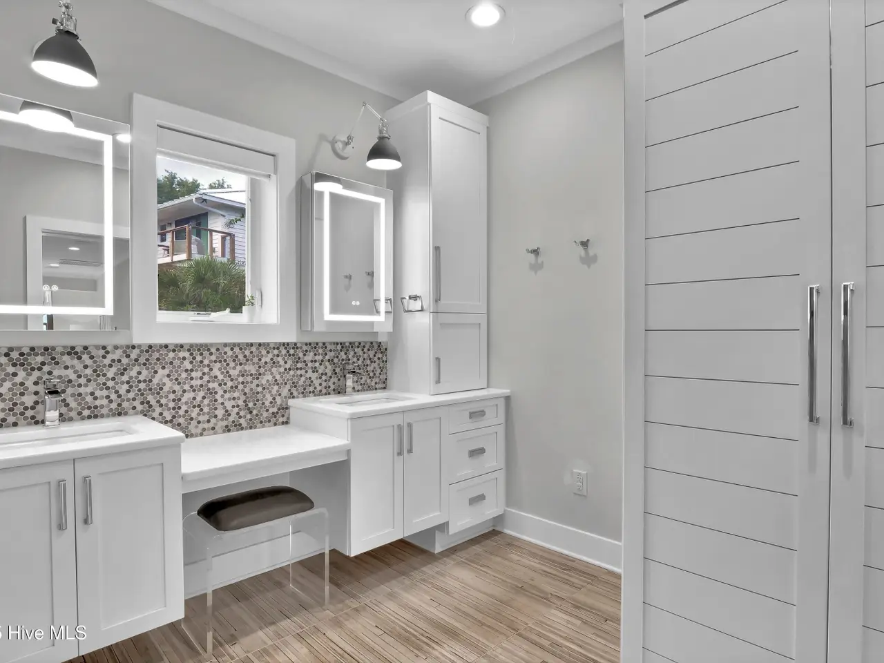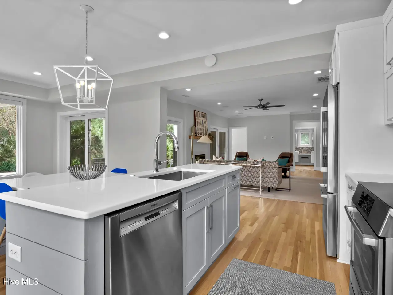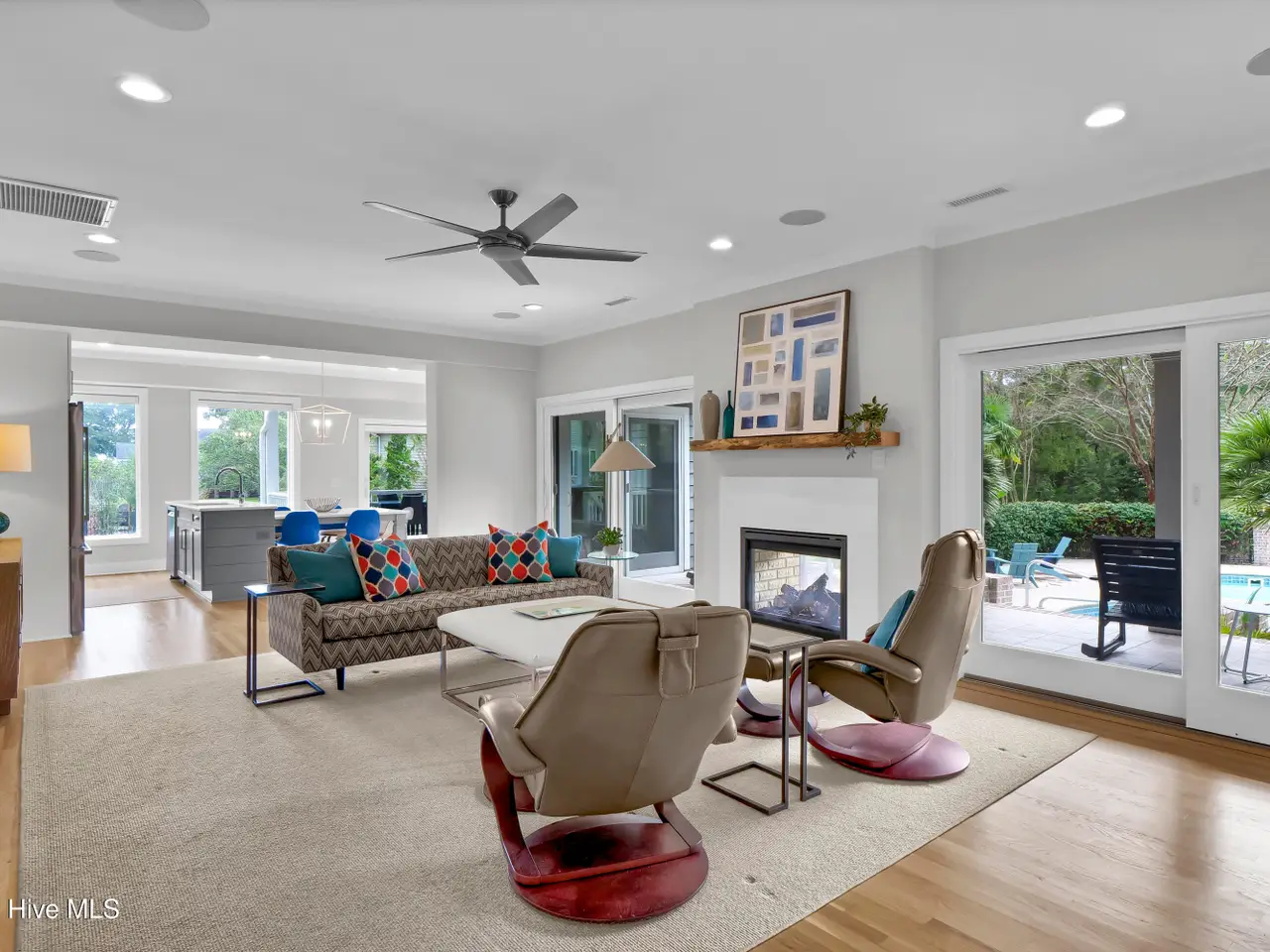 Welcome to your dream home, where coastal retreat meets modern luxury! Boating and entertaining awaits you, with this rare .75 acre property including an assigned 30' BOAT SLIP, saltwater pool, hot tub, outdoor shower, outdoor fireplace, surround sound and Control 4 AV equipment, large screened in porch, and newly renovated decks boasting a view of the magnificent intracoastal waterway! With a complete interior renovation, this stunning home boasts Bosch appliances in first and second floor kitchens, with custom walnut refrigerator doors in primary kitchen that match custom walnut open shelving and walnut cooktop hood. Also featured are Quartz countertops throughout, including Cambria Quartz, and a walnut custom double sink vanity in the primary ensuite. Natural white oak hardwoods, with water base sealer carry throughout the entire home and new tile was added in all baths and laundry. Gas fireplaces will warm the space in both living rooms, with a double sided interior-exterior gas fireplace on the first floor, that can be enjoyed on the patio, overlooking the beautiful saltwater pool. Additional impressive features include an intracoastal waterway view, hot tub, cable rail stairwell throughout, Hunter Douglas shades, lighting brands such as Serena and Lily, Hudson Valley, and Rejuvenation, Restoration Hardware pulls and hooks, and a touch of Serena and Lily wallpaper to complete the modern coastal aesthetic.Nothing was left untouched as the exterior was painted, all decks were stained, wood porch ceilings were refinished, and all exterior lighting and fans were replaced.Additional Updates Include:New main house HVAC unit in 2023.New whole house water filtration system in 2024.After an evening of entertaining your family and friends in your own coastal paradise, enjoy a sunset cruise on the intracoastal waterway, with a boat ride to Masonboro Island or nearby restaurant. This home truly has it all!