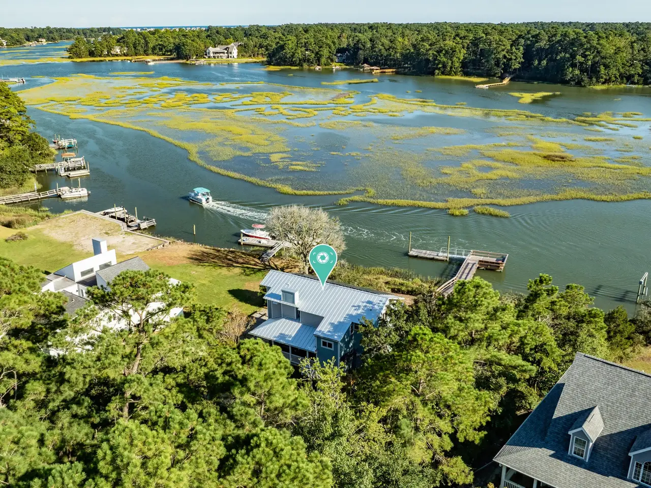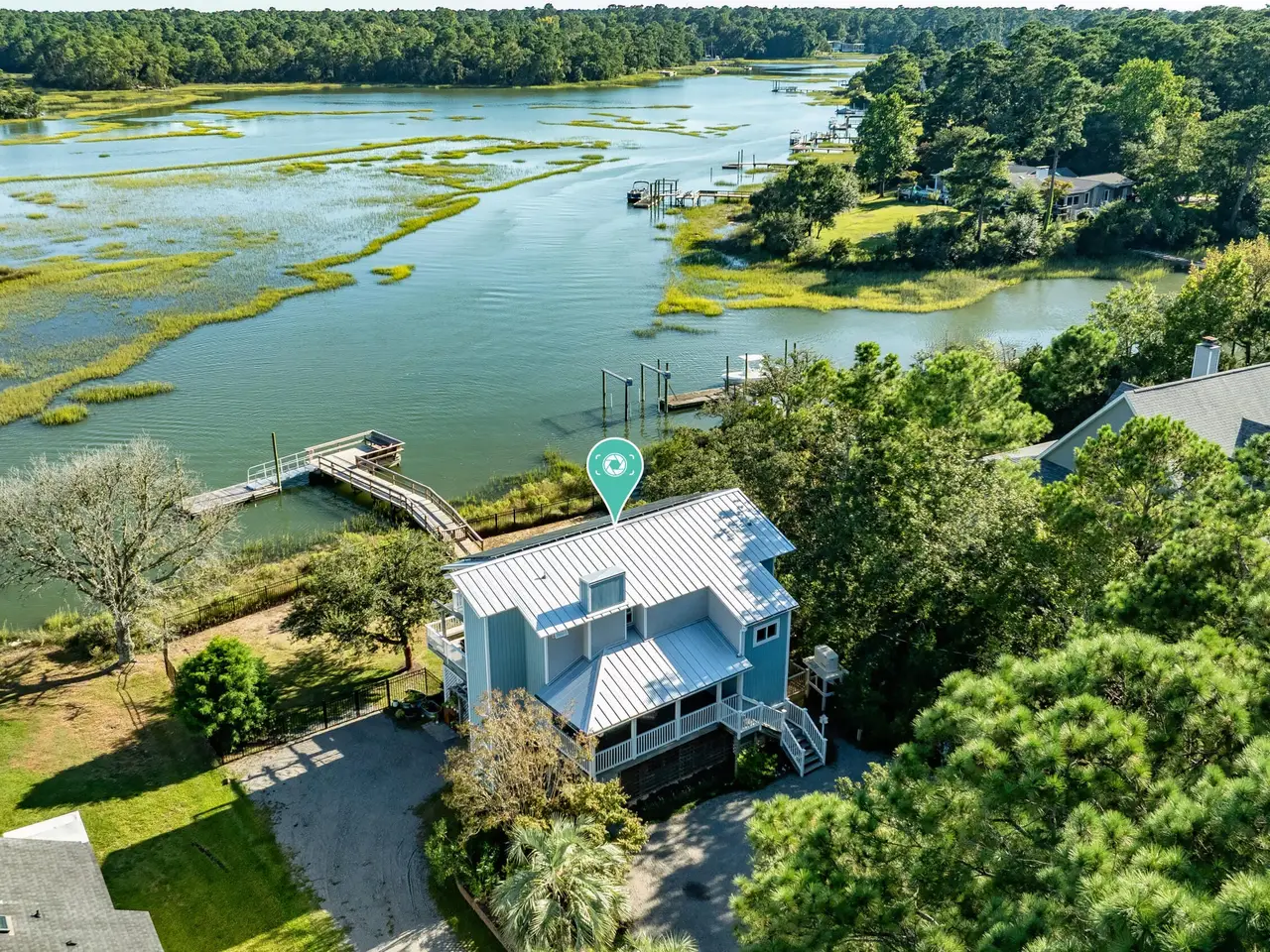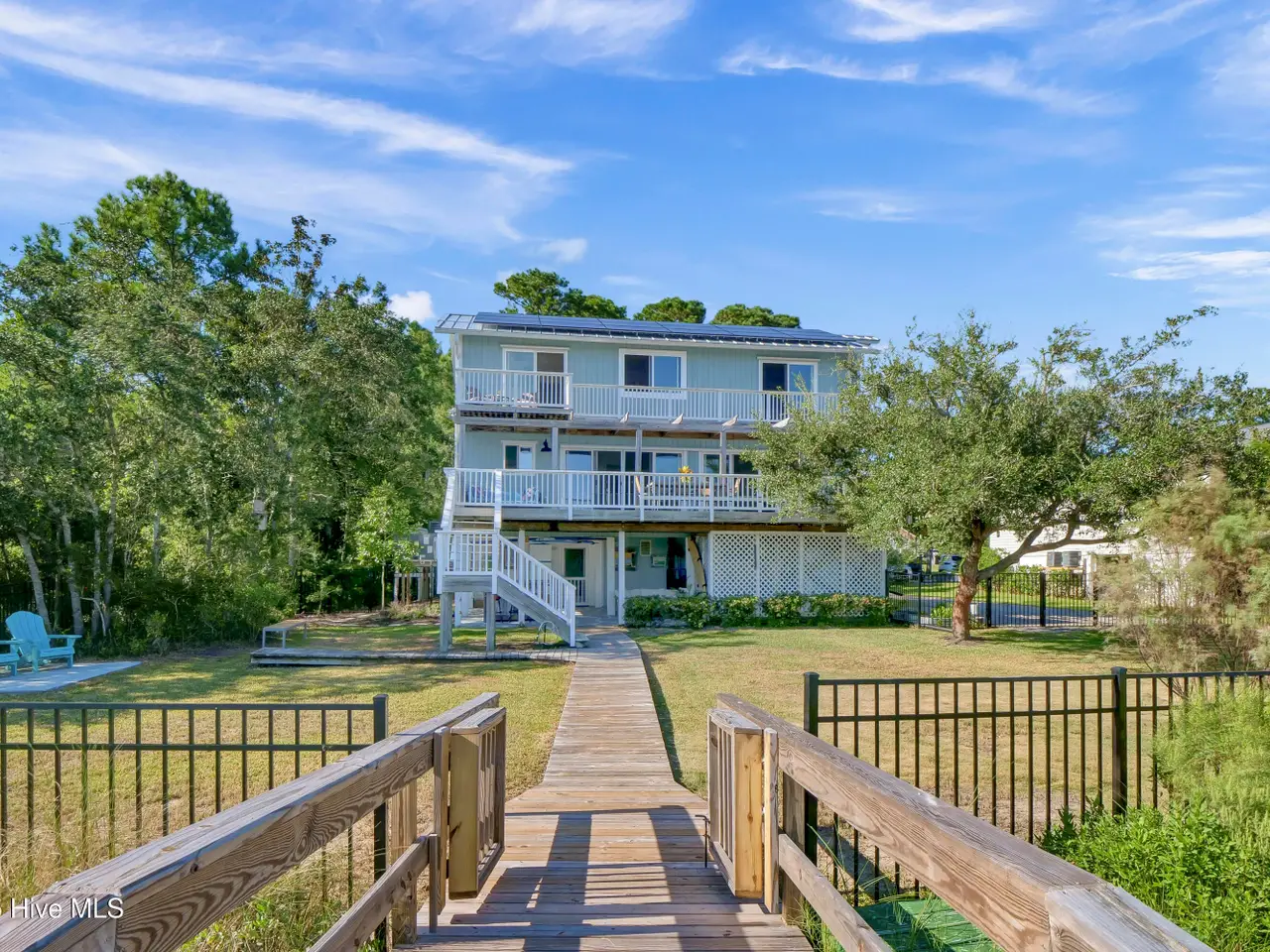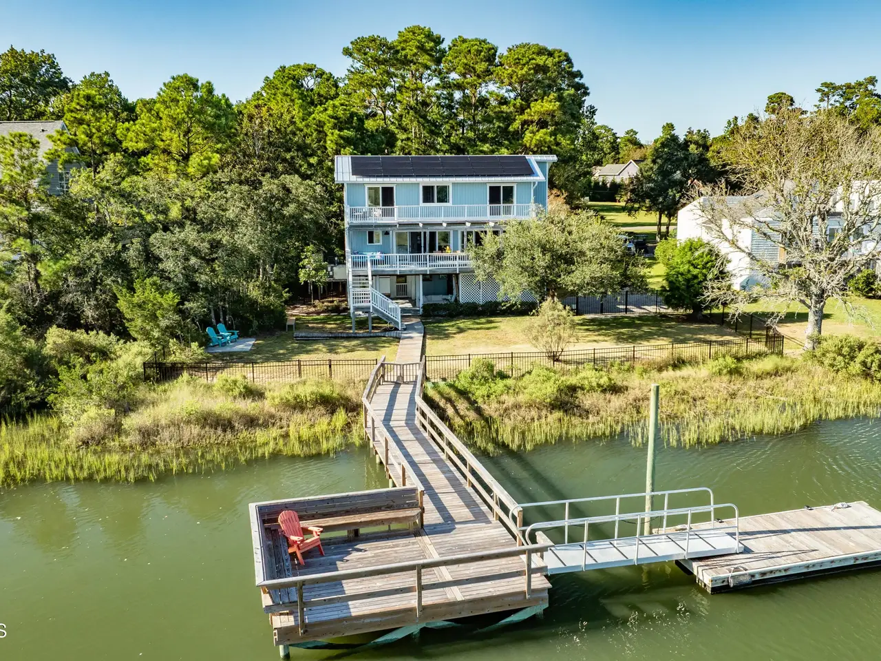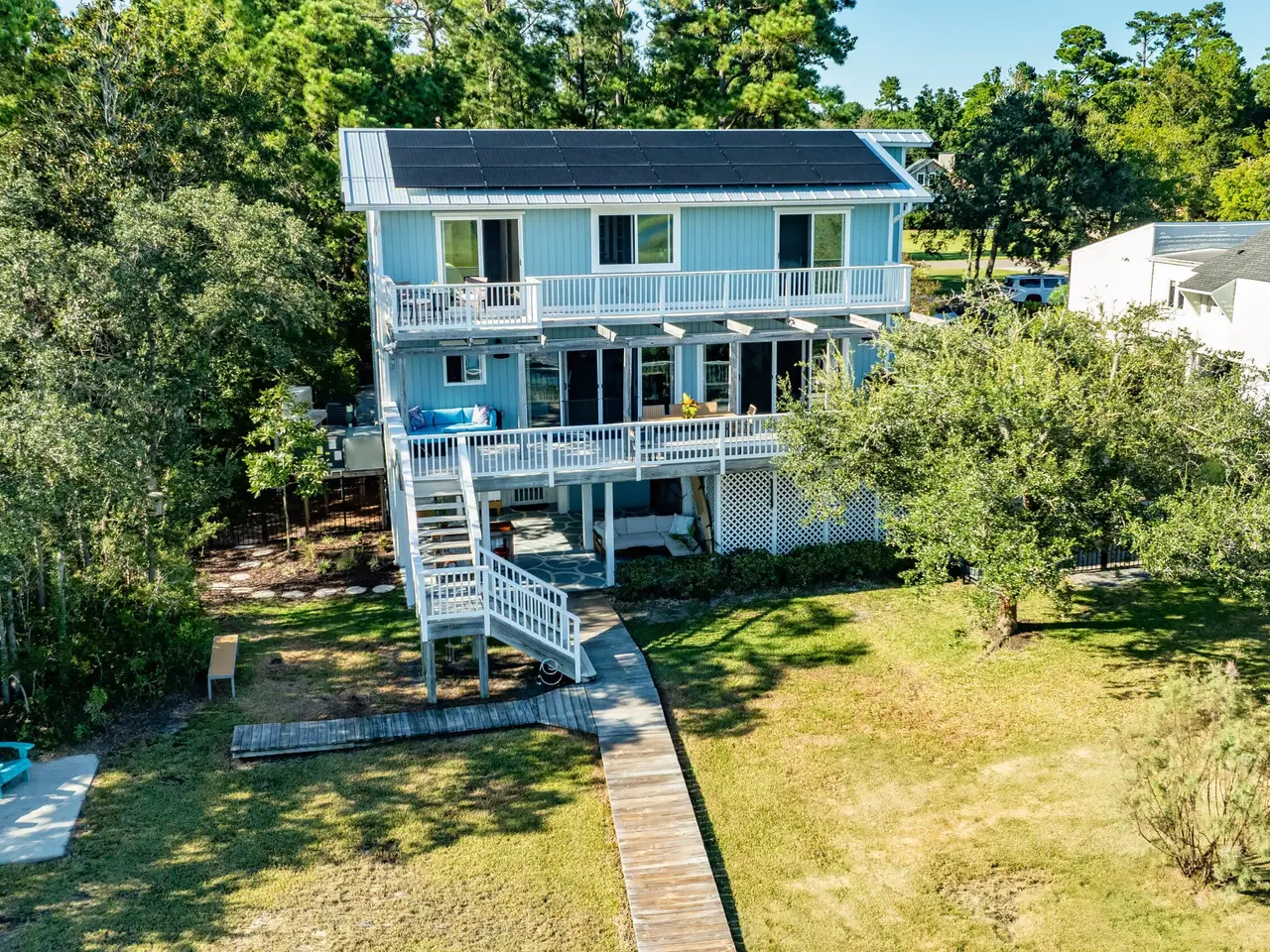 Ready for waterfront living? Spectacular location on Page's Creek with sweeping creek views and easy access to the Intracoastal Waterway. Experience the luxury of your private pier with 2 boat slips just steps off your deck! 2024 Renovations included a new metal roof, new windows, new HVAC including ducts and insulation, plus a new electric hybrid hot water heater. Beautifully renovated interior with new kitchen and baths. Enjoy cooking in the pretty white kitchen that features a stainless farmhouse sink, LG dual fuel range, plus a spacious island making it the perfect spot for entertaining or casual dining. Electric fireplace in family room combines ambiance and a cozy space for cooler weather. Access the 3-bedroom 2 bath second floor via the pretty open staircase or choose a quick elevator ride. Stair free access as the elevator services all levels to make life simple. Newly refinished wood flooring throughout the second level living areas plus renovated baths with tile, quartz, walk-in shower in master bath and a claw foot tub/shower combo in the guest bath. Never worry about loss of electricity with the newly purchased and completely paid for 14 panel 2 battery solar system that powers the house day and night. There is an additional whole house generator to back up the solar! Amazing outdoor living spaces with over 1,000 sq. ft. of covered porches, decks, and patios! Soak up the sun or have a relaxing afternoon in the shade, your choice. Downstairs tiki bar area, large outdoor shower with hot water and a peek a boo view of the creek. Workshop area plus a detached shed for storage. Mature and lush landscaping provides a home for wildlife, yet it is minutes to Mayfair, Wrightsville Beach, or easy access to I-140 and downtown. No HOA and low county taxes. Ready for coastal living and boating? This is the one!
