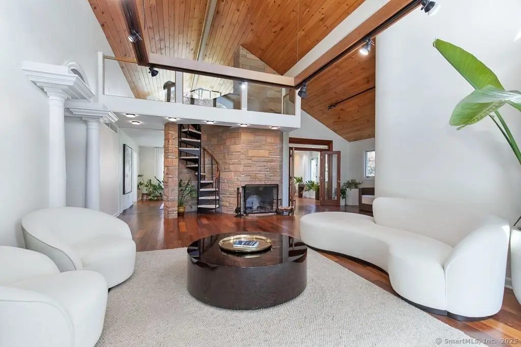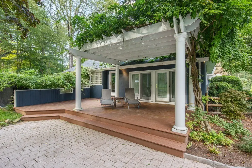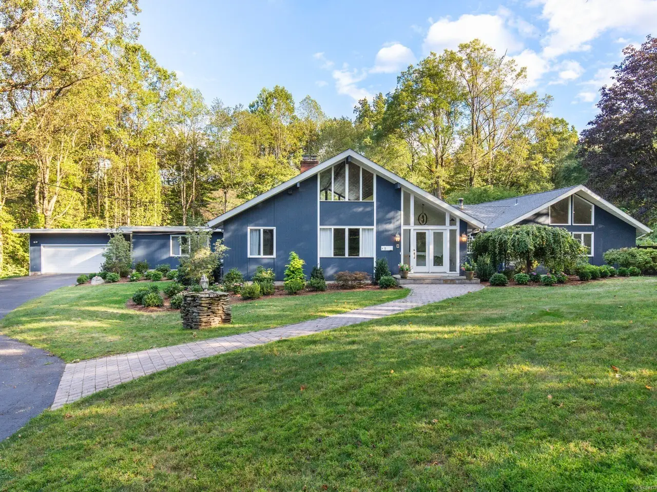 Bring the country club home with breathtaking gardens surrounding this magnificent contemporary California ranch, perfectly set at the end of a quiet cul-de-sac in one of Woodbridge's most desirable neighborhoods. You'd never guess you were just minutes from downtown New Haven while tucked away in this private nature lover's retreat backing up to the Wepawaug Falls-a series of cascading waterfalls owned by the Woodbridge Land Trust. Relax on the expansive deck and enjoy the tranquil sounds of the backyard pond and waterfall. Take a dip in the heated gunite pool with spa or host a friendly game on your private tennis/sports court. Surround sound inside and out enhances every gathering. You simply won't find another property like this in Woodbridge! Step inside and be wowed by the open, light-filled layout with vaulted ceilings, gleaming hardwood floors and designer lighting. A welcoming foyer leads to the formal living room and a spectacular great room with a custom stone fireplace and a spiral staircase to an open loft. The chef's kitchen with adjoining butler's pantry opens to a spacious formal dining room. Four generous bedrooms include a primary suite with a spa-like bath, abundant custom closets, and a private deck overlooking the grounds. Lower level adds even more living space. Conveniently located close to major highways, shops, restaurants, and Yale University.