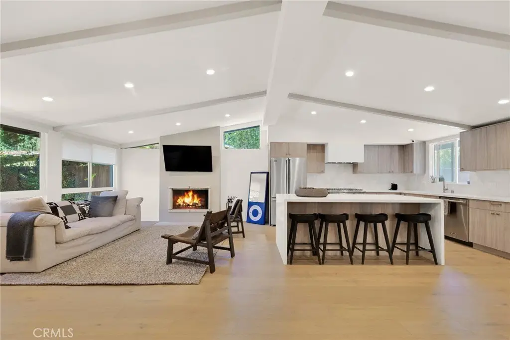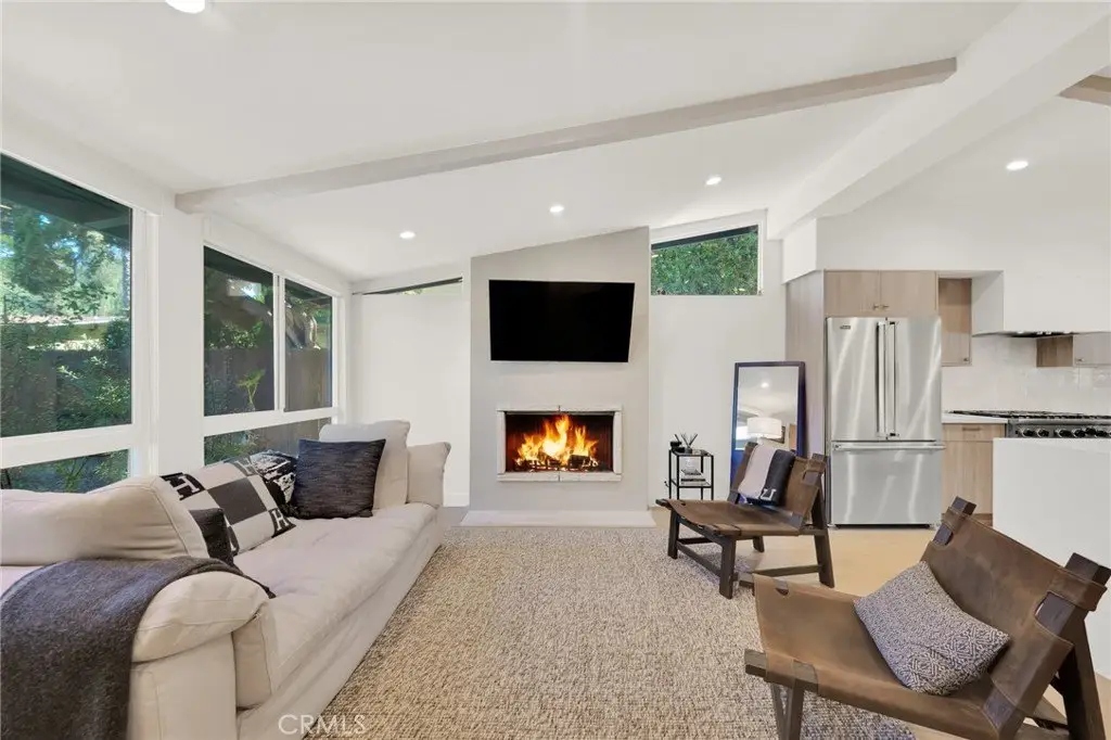 Experience the perfect blend of style and comfort in this beautifully reimagined mid-century modern single-story pool home, ideally situated south of the boulevard in a beautiful sought-after Woodland Hills neighborhood. Originally renovated about three years ago (2023) with high-end finishes and thoughtful design, the home has been lovingly maintained to preserve its like-new feel. Step through a lush, private courtyard into a light-filled living space with soaring beam ceilings and courtyard views. The open-concept great room features European engineered wood floors, an updated fireplace, and a dining area ideal for gatherings. The chef’s kitchen boasts Viking stainless steel appliances, a generous center island with seating, custom flat-panel cabinetry, quartz counters, and a full-height tile backsplash. Designed for seamless indoor/outdoor living, this three-bedroom, two-and-a-half-bath home offers a family room that flows to the pool, firepit, and patio, plus a separate grassy yard. The primary suite includes a custom walk-in closet, spa-like en-suite bath, and direct patio access with serene views. A secondary bedroom also opens to the garden. Extensive upgrades from the renovation done in 2023 include designer fixtures, new windows, roof, HVAC, tankless water heater, updated plumbing/electrical, refreshed pool with new coping, plaster, tile, LED lighting, and more. Close to Ventura Blvd’s dining and shopping, The Village, Westfield Topanga, Calabasas Commons, award-winning schools, beaches, and the 101 Freeway—this home offers a private retreat with unbeatable convenience. Call Sheila Cathers or Julie Saldivar at 818-993-7370