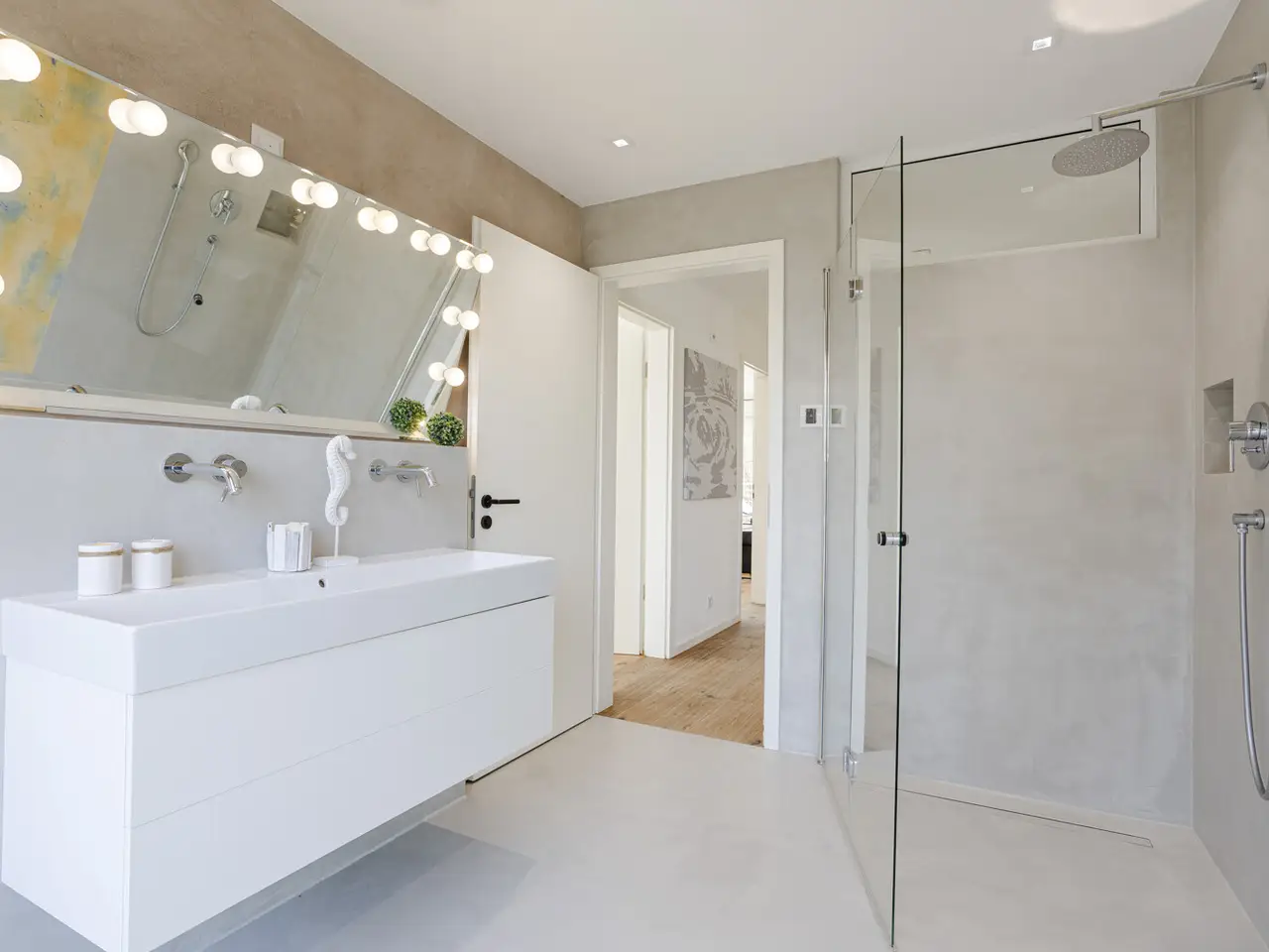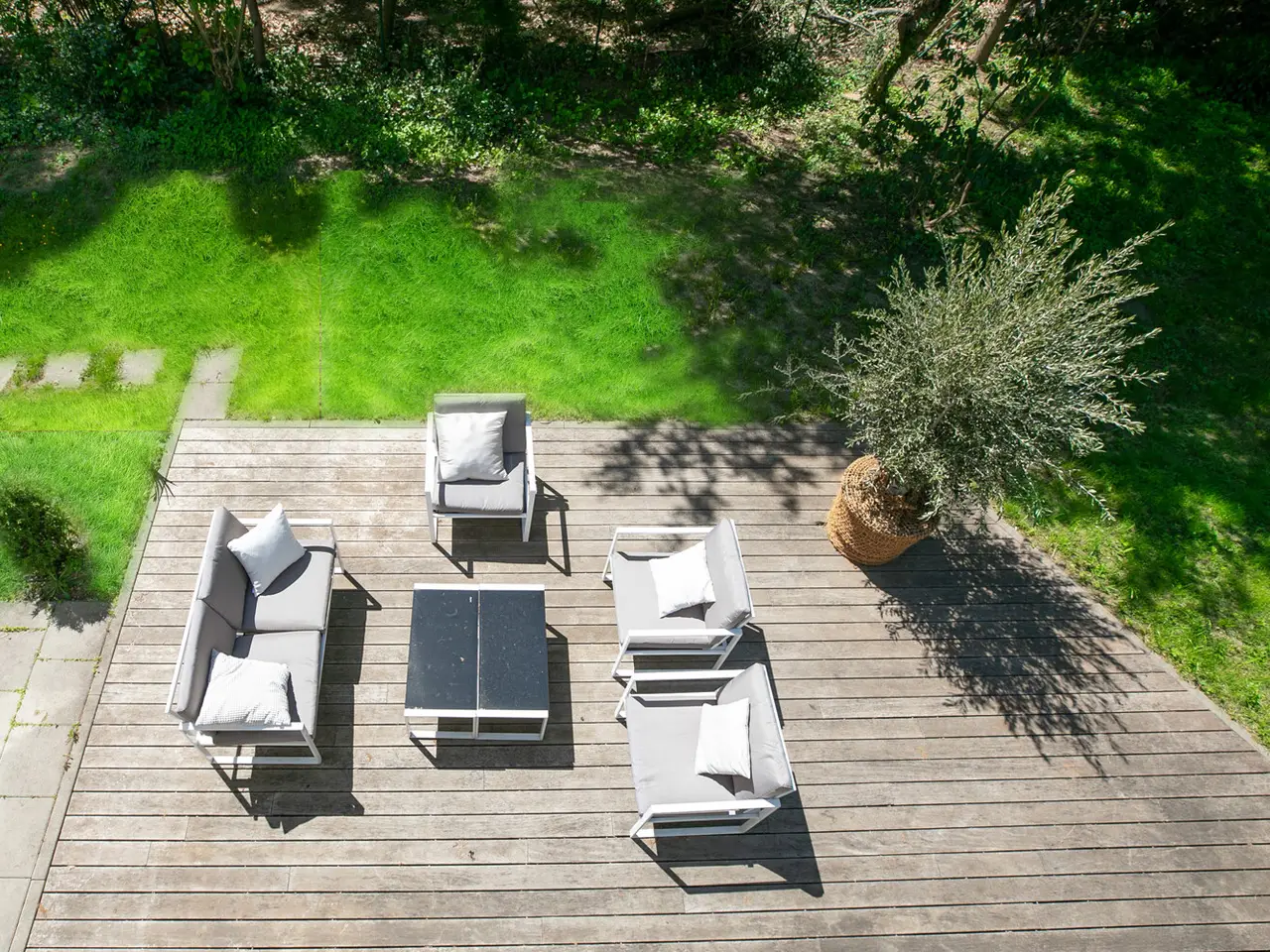 This exclusive villa combines luxury, comfort and functionality in a spacious living area and is ideal for large families looking for plenty of living space. The detached/two-family house is located in a quiet cul-de-sac and impresses with its sunny south/west-facing position, which ensures a private and peaceful atmosphere. The well-tended garden with idyllic swimming pond invites you to spend relaxing hours outdoors and offers a unique ambience. Upon entering the house, you are greeted by an inviting entrance area with a modern steel staircase that leads to the open, light-flooded living and dining area. Large windows create a bright atmosphere and provide a view of the garden and swimming pond. The living/dining area is also equipped with a large, high-quality fitted kitchen that leaves nothing to be desired. A counter and high-quality Miele appliances ensure maximum convenience and quality when cooking. On cooler days, the wood-burning stove creates a cozy atmosphere. The first floor also has practical extras such as a checkroom, a guest WC and a separate study, which is ideal as a home office or retreat. A utility room provides tidiness and storage space. A garage, a carport in front of the garage and three parking spaces in the driveway are available for your vehicles. There is also enough space in front of the house on the street to provide ample parking for family and guests. This detached house not only impresses with its generous living space and well thought-out architecture, but also with its modern fittings. It is the perfect place for a large family who want to enjoy life in an exclusive and comfortable home. Please note that the property comes with a heritable building right with an annual payment of 4,350 euros. The basement with separate entrance and separate toilet offers the possibility for an au pair. A sauna room with shower provides a wellness retreat. A large hallway can be ideally used as a playroom for the children, while the other rooms offer plenty of storage space and flexibility. Another highlight is the approx. 70 m² 2-room granny apartment with separate entrance, shower room and terrace. It is suitable for guests, as an office or for renting out and is furnished to a high standard. On the upper floor, five spacious bedrooms offer plenty of room for parents and children. Two high-quality bathrooms, including a luxurious master bathroom with direct access to the spacious terrace, ensure maximum comfort. The terrace invites you to spend relaxing hours outdoors and offers a fantastic view of the green plot. The attic studio in the upper part of the house offers a variety of uses. It is already equipped with connections for the kitchen and bathroom and can therefore be used as an additional bedroom, study or as a separate living unit. From the loggia, you can enjoy a wonderful view of the greenery, inviting you to relax.