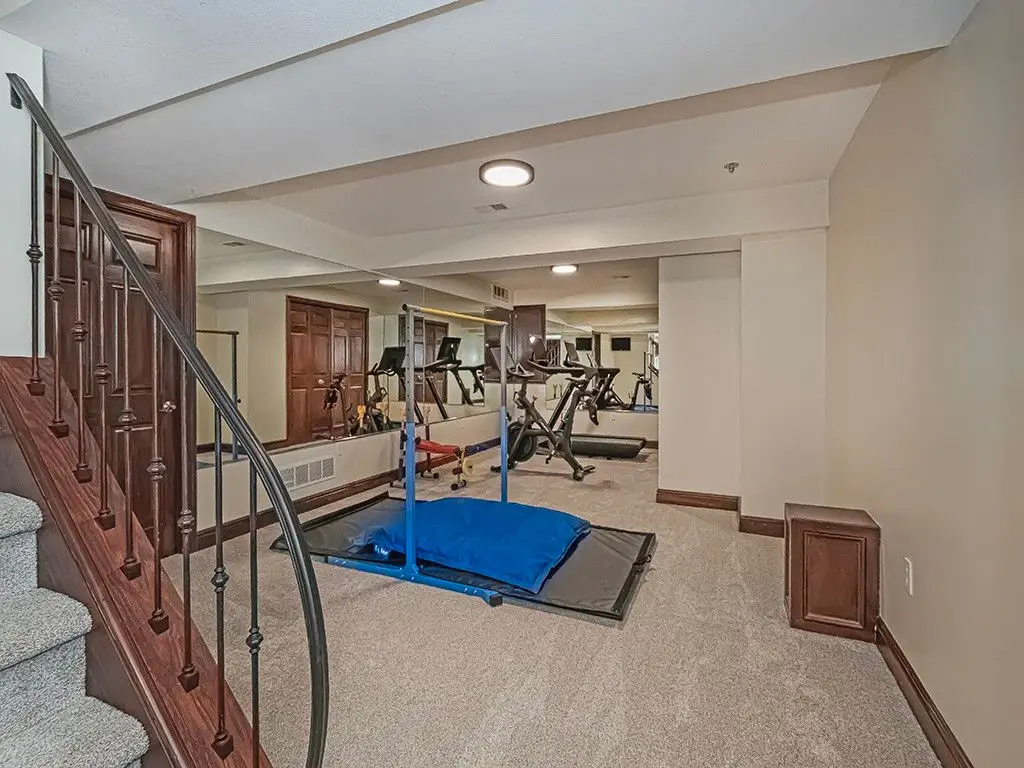 Handsome gas fireplace in sunken family room