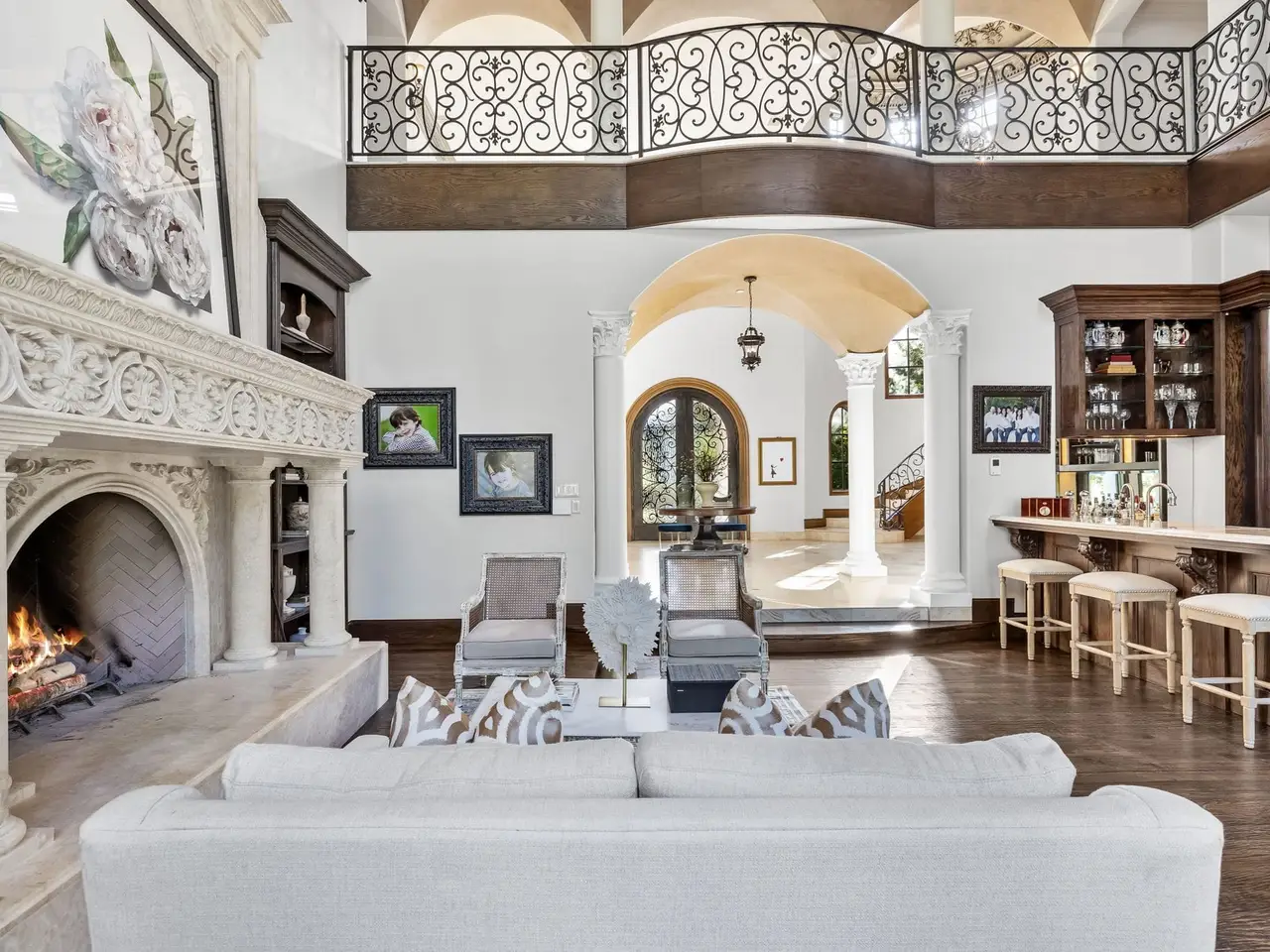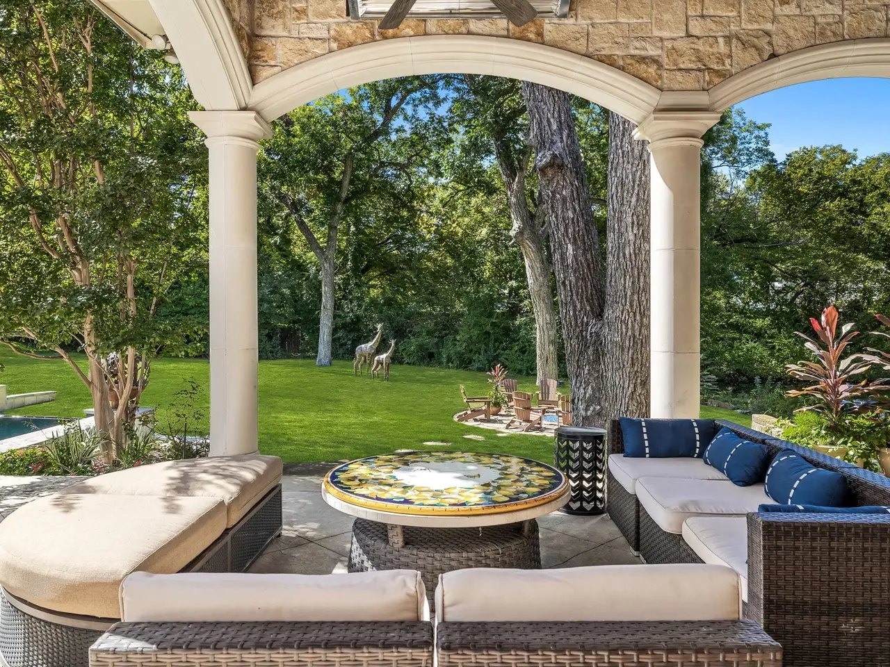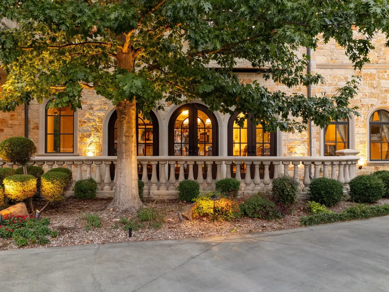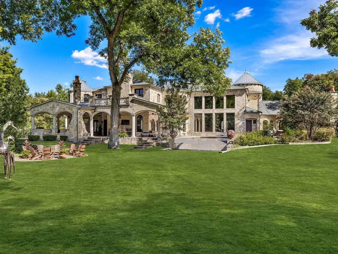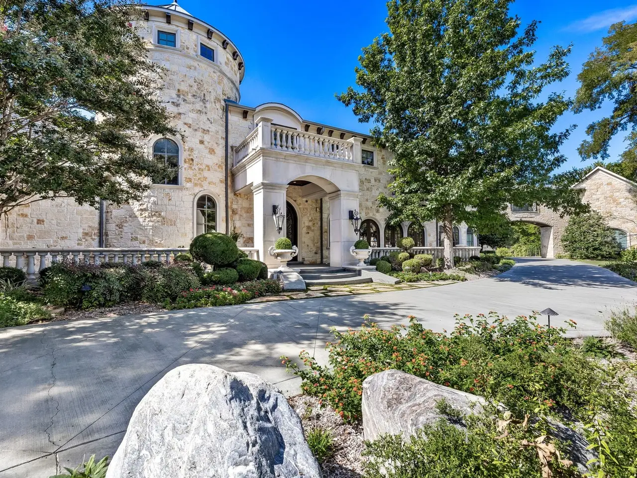 Majestic luxury in cul-de-sac home full of custom features, including private pond & fountain, energy-efficient features, elevator, and custom design touches. Grand entry wows with dramatic iron staircase and vaulted ceilings that show off gold inlay turret with chandelier. Huge dining room with French doors to front veranda, custom ceiling mural, and access to 750-btl temp-controlled wine room. Formal living features floor-to-ceiling UV-protected windows overlooking outdoor retreat, Isokern fireplace, and onyx-topped bar with 2 Uline fridges. Expansive gourmet kitchen includes 2 Bosch dishwashers, Viking 6-burner gas cooktop, double ovens, warming drawer, & massive island. Oversize walk-in pantry offers 2nd built-in fridge and extra storage. Stylish study has French doors to front patio and hidden room used as storm shelter. Primary suite feels like a luxury hotel, with imported wood doors from Bali, coffee bar & refrigerator, and elegant fireplace in sitting area. Spa-like primary bath with exquisite hand-carved marble tub, walk-in shower with dual heads, dual vanities, heated travertine flooring, and walk-in closet with island. Expansive game room offers space for pool table or gaming, with access to large balcony overlooking lush outdoors. Theatre includes ample seating and refrigerator for movie nights. Spacious exercise room fits machines & weights with access to steam shower bathroom. Secondary bedrooms have full baths & walk-in closets, and can be extra office or craft space. Expansive covered patio is ideal outdoor living, with built-in kitchen, fireplace, misting & mosquito systems, and room for seating & dining. Exquisite heated pool overlooks verdant yard with firepit, private pond, and fountain. Additional features include Infinity Carrier HVAC system, gated driveway & sport court, and upstairs 2nd laundry room. Close proximity to top-tier dining, entertainment, and golf courses. Conveniently located to Dallas top private and collegiate prep schools.