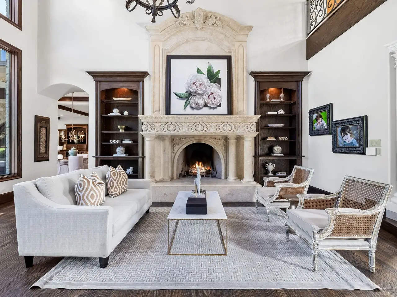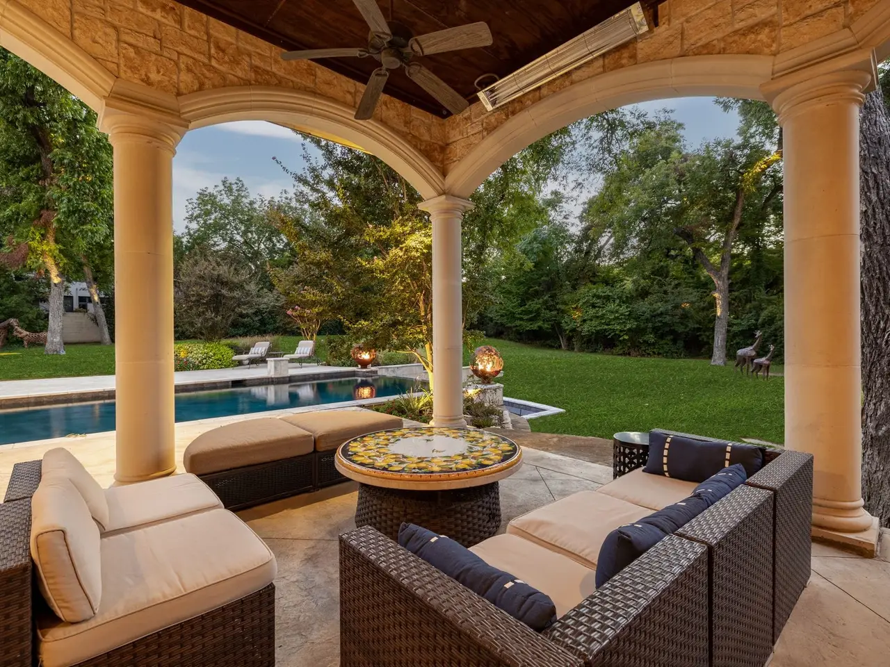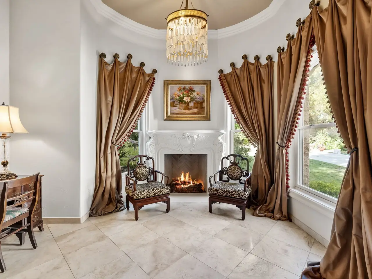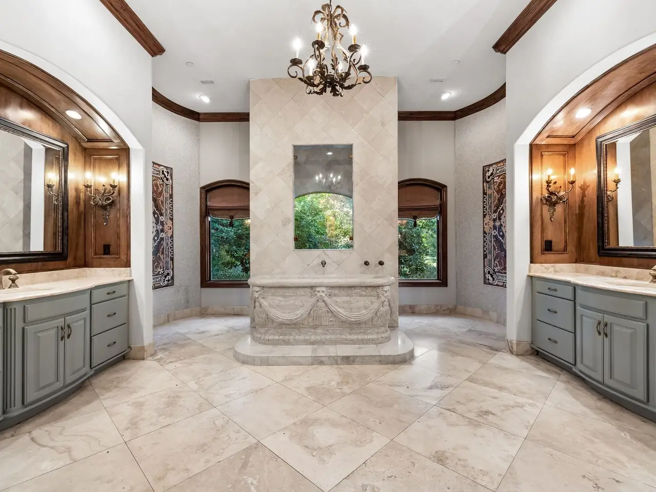 Majestic luxury in cul-de-sac home full of custom features, including private pond & fountain, energy-efficient features, elevator, and custom design touches. Grand entry wows with dramatic iron staircase and vaulted ceilings that show off gold inlay turret with chandelier. Huge dining room with French doors to front veranda, custom ceiling mural, and access to 750-btl temp-controlled wine room. Formal living features floor-to-ceiling UV-protected windows overlooking outdoor retreat, Isokern fireplace, and onyx-topped bar with 2 Uline fridges. Expansive gourmet kitchen includes 2 Bosch dishwashers, Viking 6-burner gas cooktop, double ovens, warming drawer, & massive island. Oversize walk-in pantry offers 2nd built-in fridge and extra storage. Stylish study has French doors to front patio and hidden room used as storm shelter. Primary suite feels like a luxury hotel, with imported wood doors from Bali, coffee bar & refrigerator, and elegant fireplace in sitting area. Spa-like primary bath with exquisite hand-carved marble tub, walk-in shower with dual heads, dual vanities, heated travertine flooring, and walk-in closet with island. Expansive game room offers space for pool table or gaming, with access to large balcony overlooking lush outdoors. Theatre includes ample seating and refrigerator for movie nights. Spacious exercise room fits machines & weights with access to steam shower bathroom. Secondary bedrooms have full baths & walk-in closets, and can be extra office or craft space. Expansive covered patio is ideal outdoor living, with built-in kitchen, fireplace, misting & mosquito systems, and room for seating & dining. Exquisite heated pool overlooks verdant yard with firepit, private pond, and fountain. Additional features include Infinity Carrier HVAC system, gated driveway & sport court, and upstairs 2nd laundry room. Close proximity to top-tier dining, entertainment, and golf courses. Conveniently located to Dallas top private and collegiate prep schools.