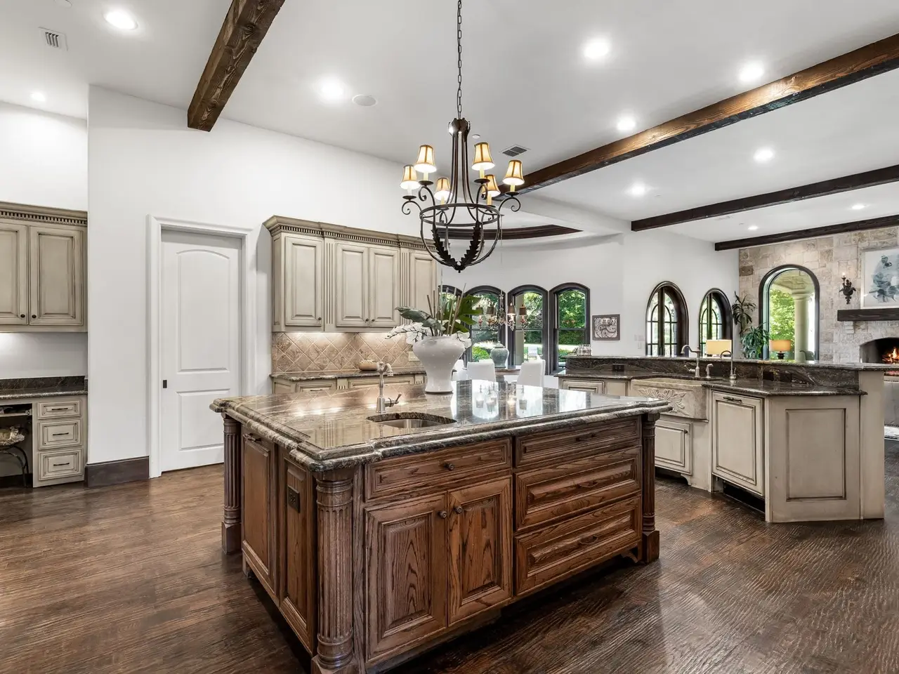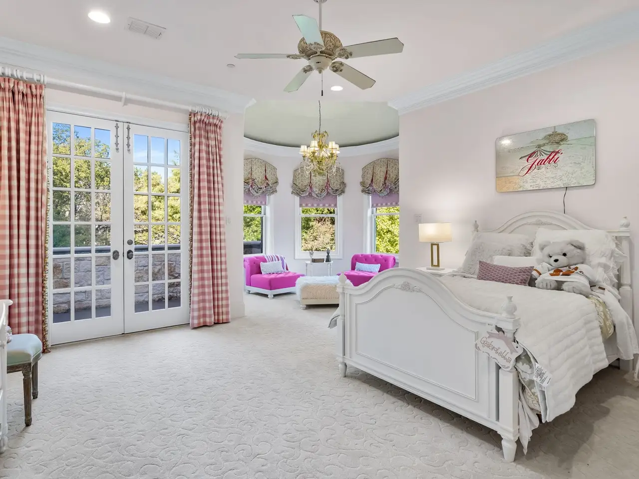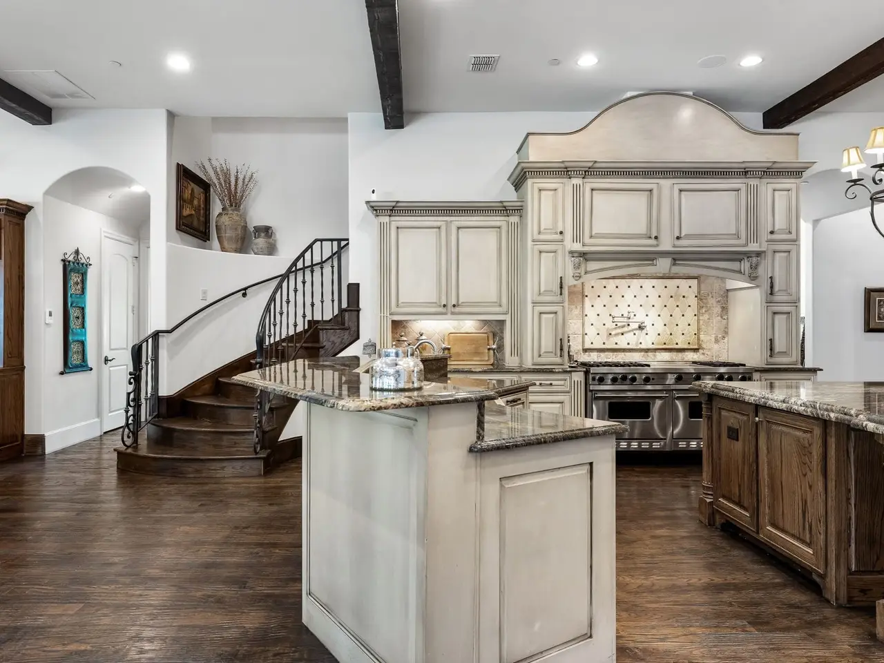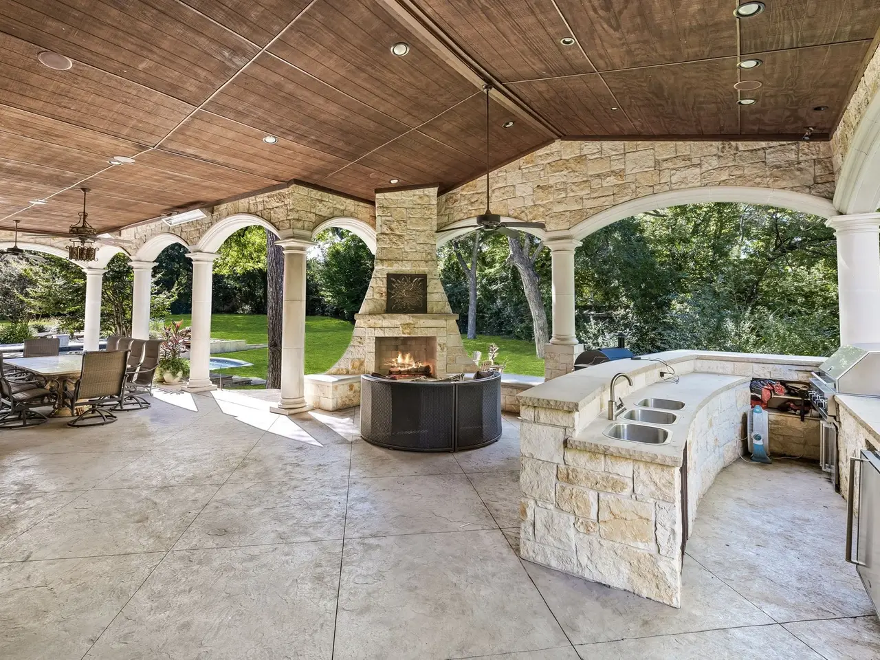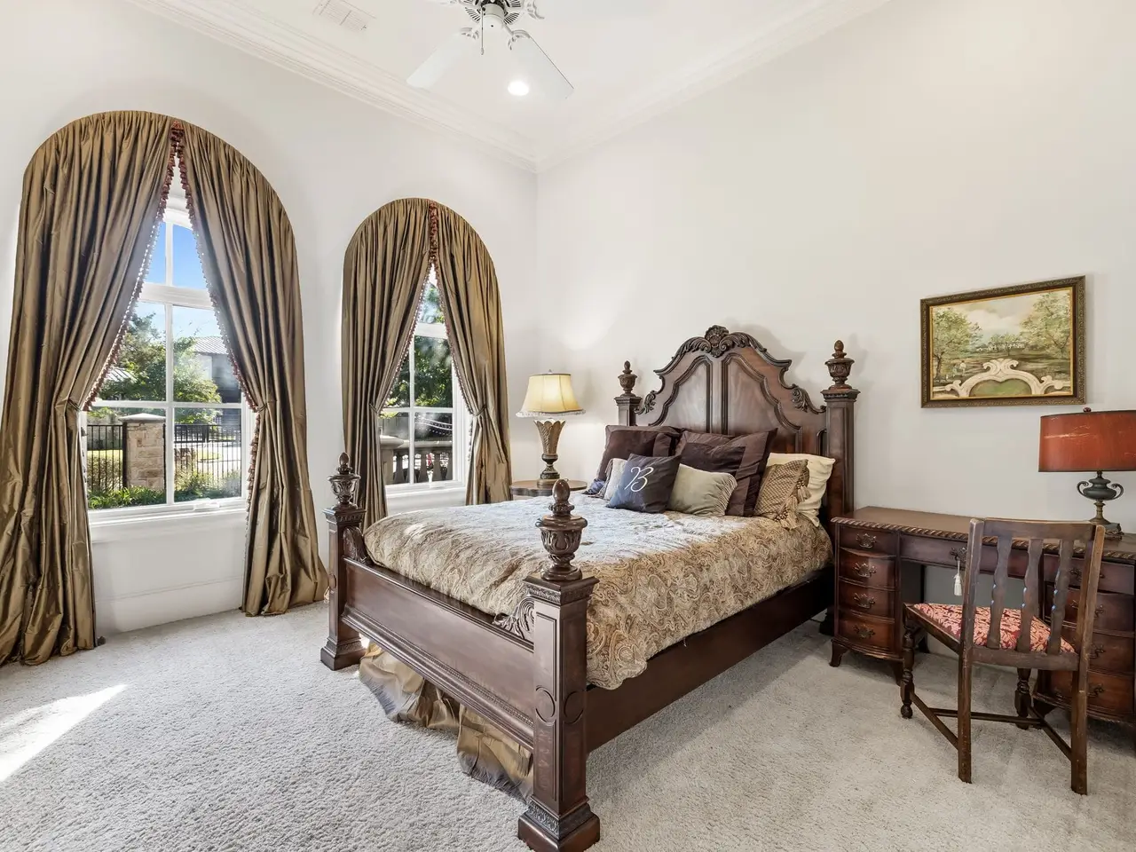 Majestic luxury in cul-de-sac home full of custom features, including private pond & fountain, energy-efficient features, elevator, and custom design touches. Grand entry wows with dramatic iron staircase and vaulted ceilings that show off gold inlay turret with chandelier. Huge dining room with French doors to front veranda, custom ceiling mural, and access to 750-btl temp-controlled wine room. Formal living features floor-to-ceiling UV-protected windows overlooking outdoor retreat, Isokern fireplace, and onyx-topped bar with 2 Uline fridges. Expansive gourmet kitchen includes 2 Bosch dishwashers, Viking 6-burner gas cooktop, double ovens, warming drawer, & massive island. Oversize walk-in pantry offers 2nd built-in fridge and extra storage. Stylish study has French doors to front patio and hidden room used as storm shelter. Primary suite feels like a luxury hotel, with imported wood doors from Bali, coffee bar & refrigerator, and elegant fireplace in sitting area. Spa-like primary bath with exquisite hand-carved marble tub, walk-in shower with dual heads, dual vanities, heated travertine flooring, and walk-in closet with island. Expansive game room offers space for pool table or gaming, with access to large balcony overlooking lush outdoors. Theatre includes ample seating and refrigerator for movie nights. Spacious exercise room fits machines & weights with access to steam shower bathroom. Secondary bedrooms have full baths & walk-in closets, and can be extra office or craft space. Expansive covered patio is ideal outdoor living, with built-in kitchen, fireplace, misting & mosquito systems, and room for seating & dining. Exquisite heated pool overlooks verdant yard with firepit, private pond, and fountain. Additional features include Infinity Carrier HVAC system, gated driveway & sport court, and upstairs 2nd laundry room. Close proximity to top-tier dining, entertainment, and golf courses. Conveniently located to Dallas top private and collegiate prep schools.