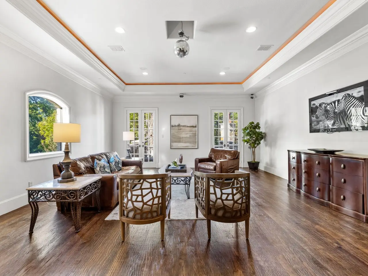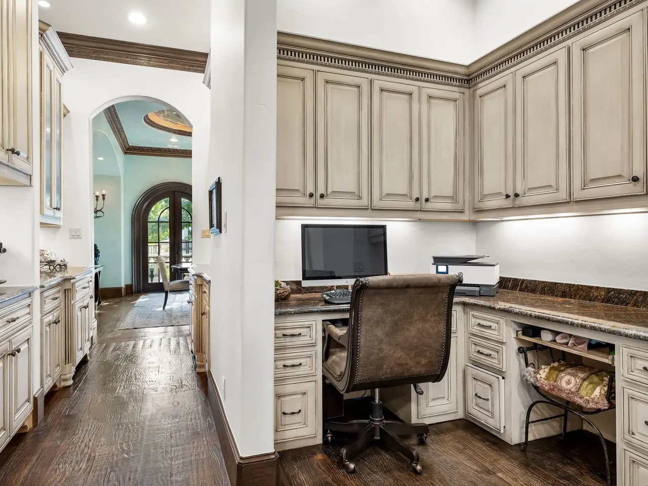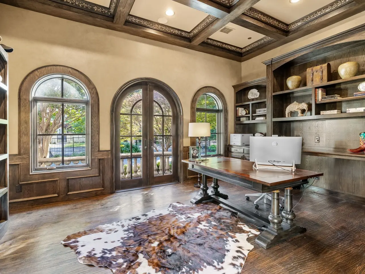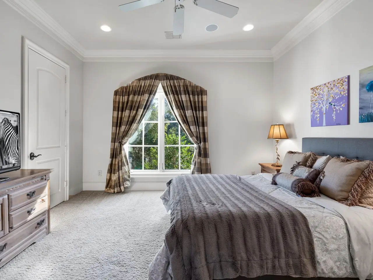 Majestic luxury in cul-de-sac home full of custom features, including private pond & fountain, energy-efficient features, elevator, and custom design touches. Grand entry wows with dramatic iron staircase and vaulted ceilings that show off gold inlay turret with chandelier. Huge dining room with French doors to front veranda, custom ceiling mural, and access to 750-btl temp-controlled wine room. Formal living features floor-to-ceiling UV-protected windows overlooking outdoor retreat, Isokern fireplace, and onyx-topped bar with 2 Uline fridges. Expansive gourmet kitchen includes 2 Bosch dishwashers, Viking 6-burner gas cooktop, double ovens, warming drawer, & massive island. Oversize walk-in pantry offers 2nd built-in fridge and extra storage. Stylish study has French doors to front patio and hidden room used as storm shelter. Primary suite feels like a luxury hotel, with imported wood doors from Bali, coffee bar & refrigerator, and elegant fireplace in sitting area. Spa-like primary bath with exquisite hand-carved marble tub, walk-in shower with dual heads, dual vanities, heated travertine flooring, and walk-in closet with island. Expansive game room offers space for pool table or gaming, with access to large balcony overlooking lush outdoors. Theatre includes ample seating and refrigerator for movie nights. Spacious exercise room fits machines & weights with access to steam shower bathroom. Secondary bedrooms have full baths & walk-in closets, and can be extra office or craft space. Expansive covered patio is ideal outdoor living, with built-in kitchen, fireplace, misting & mosquito systems, and room for seating & dining. Exquisite heated pool overlooks verdant yard with firepit, private pond, and fountain. Additional features include Infinity Carrier HVAC system, gated driveway & sport court, and upstairs 2nd laundry room. Close proximity to top-tier dining, entertainment, and golf courses. Conveniently located to Dallas top private and collegiate prep schools.