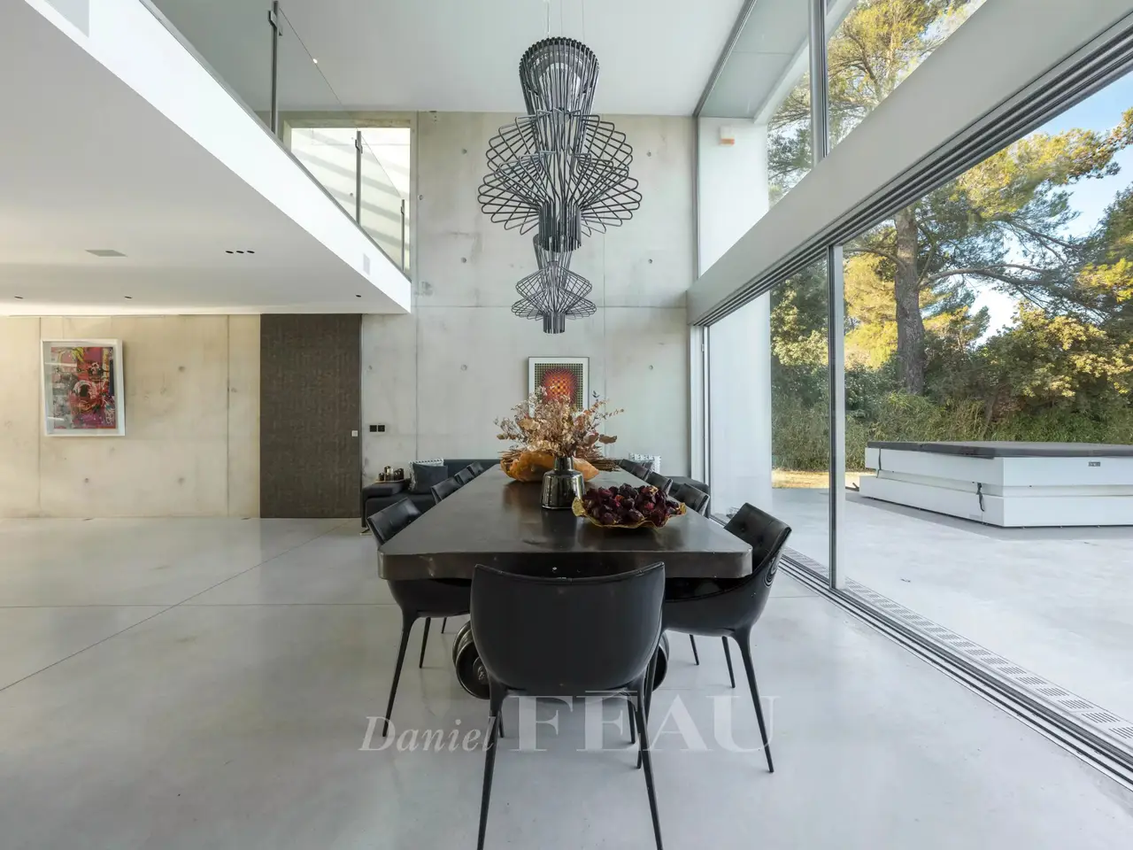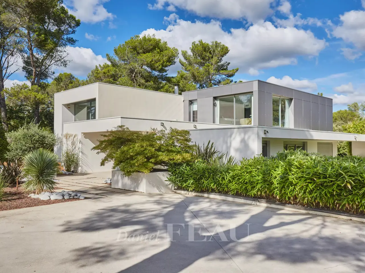 This resolutely contemporary 400 sqm property dating from 2011 is in a peaceful location 10 minutes from Cours Mirabeau and the centre of Aix, 15 minutes from the TGV station, 25 minutes from the airport and near the autoroutes. Set in 4000 sqm of grounds and commanding an exceptional view of the iconic Sainte Victoire Mountain, it includes a 180 sqm reception area, a 70 sqm home cinema, five bedrooms and a study. With a heated 15 x 5 metre mirror swimming pool, a jacuzzi and a carport.