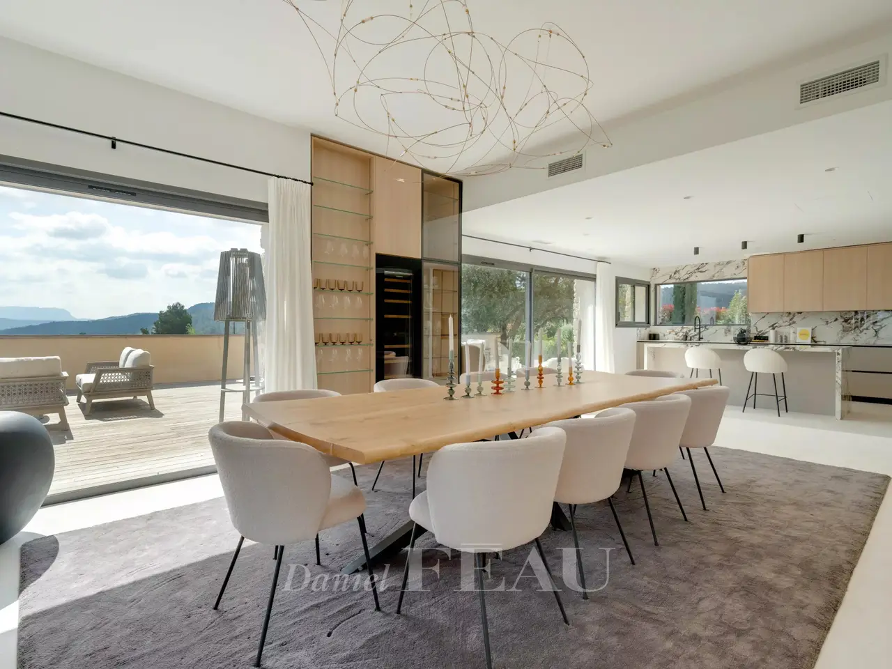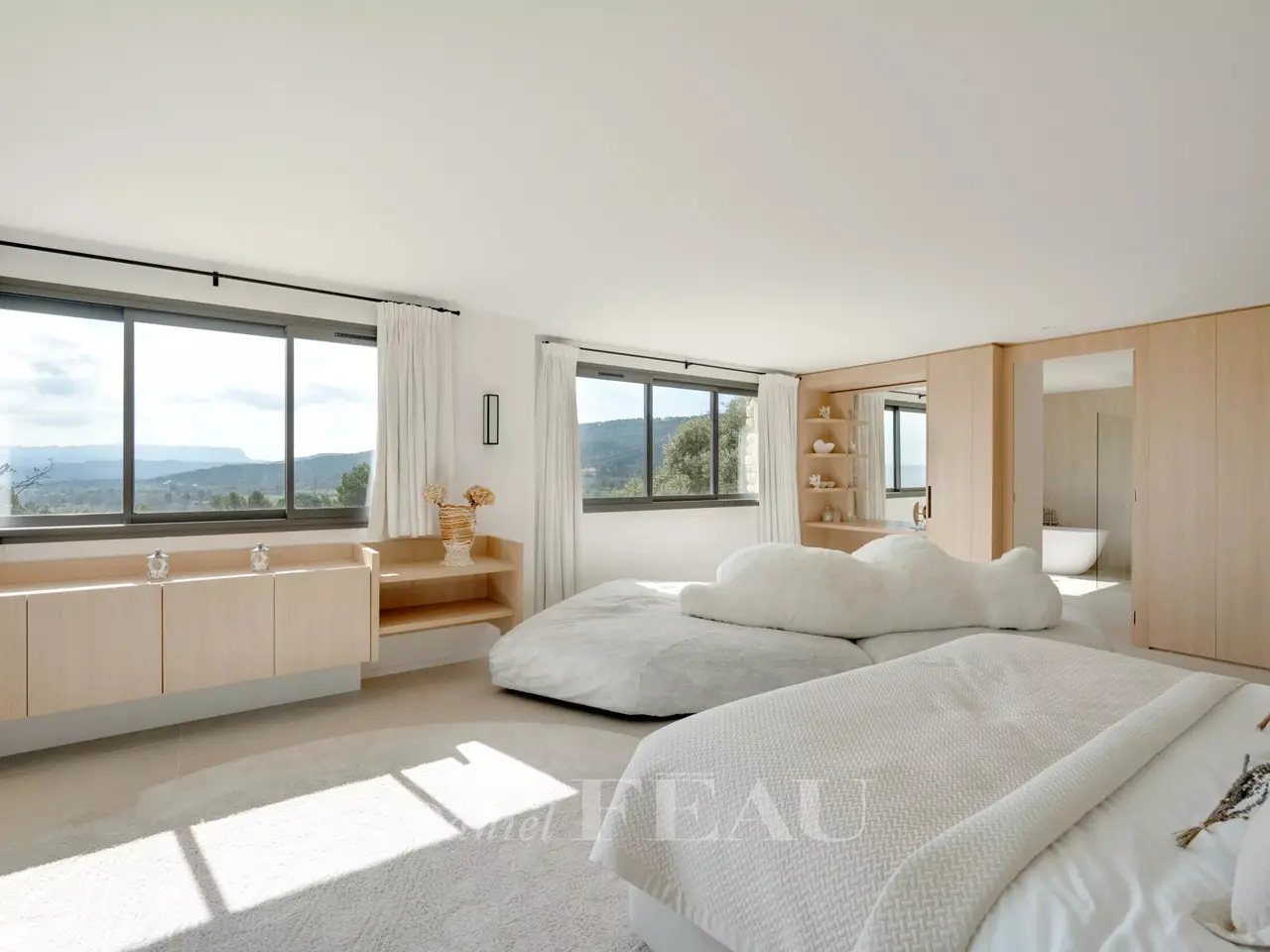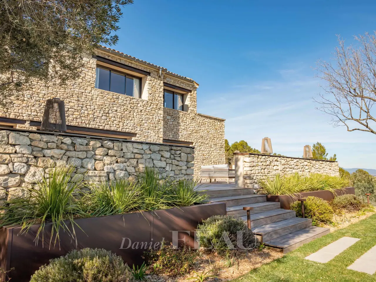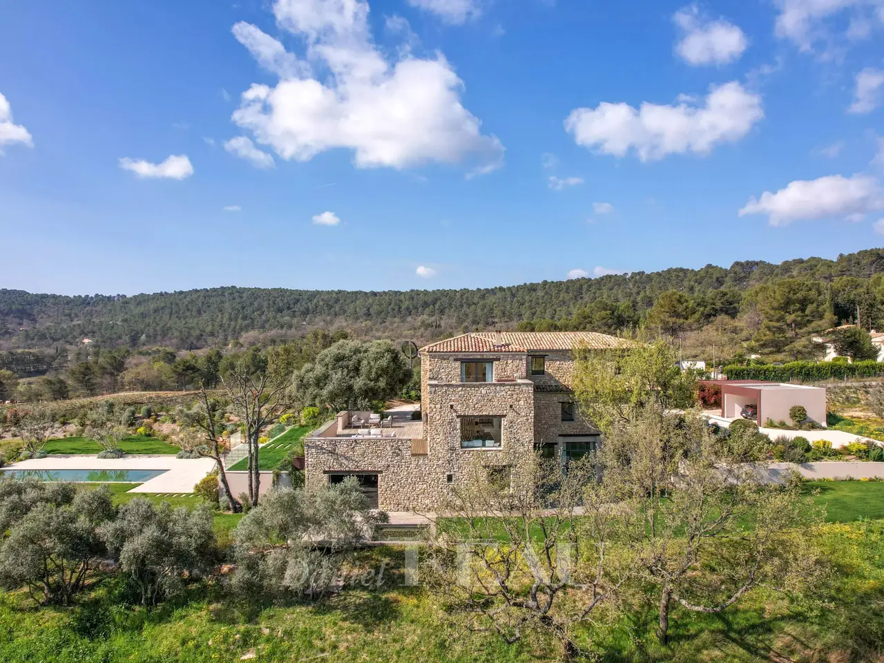 Sole Agent. This superb property is located 15 minutes from Aix en Provence in an elevated setting commanding breathtaking views of the iconic Saint Victoire Mountain and the Luberon countryside. Offering 470 sqm of living space, it is set In 6 hectares of peaceful grounds (two hectares of which are enclosed and feature a 15 x 5 metre overflow swimming pool). Allying stone, steel and extensive glazing, the beautifully appointed and tastefully decorated main house includes a spacious entrance hall, a living/reception room and dining room and open-plan kitchen with wide patio windows opening onto 250 sqm timber-decked terraces, a study, and a suite with a bathroom and dressing room. Upstairs are a study/library area, and two suites including a 70 sqm master with a terrace overlooking the surrounding countryside. The garden level comprises a sitting room with a bar, two bedrooms including a suite, technical premises, a home cinema, a sauna, and a heated 10 x 4 metre swimming pool. There is also a further independent bedroom. With a car port for five vehicles. Water is provided by the Canal de Provence. Unique.