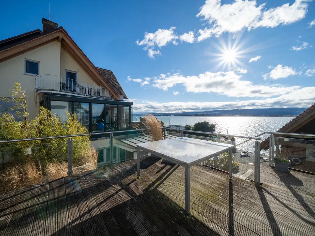 Our exceptionally beautiful property is a very rare lakeside plot of approx. 1,071 m² with direct lake access on the shores of Lake Constance. The property is developed with an exclusive detached house with approx. 302.56 m² of living space and a granny apartment and offers you a special living experience. Completed in 2005, the house impresses with its well thought-out room concept, high-quality furnishings and private lake access. The south-facing property has a total of 7 rooms, including 3 spacious bedrooms and 2 modern bathrooms that leave nothing to be desired. The layout of the rooms is ideal for couples or families who value comfort and spaciousness. The heart of the property is the bright, spacious living and dining area, which boasts an impressive view of Lake Constance. A wood-burning stove ensures cozy hours on cooler days. The open architecture and large window fronts guarantee plenty of natural light and a friendly atmosphere. Two fitted kitchens with integrated large kitchen appliances offer maximum cooking convenience in both the main unit and the separate granny apartment. The granny apartment is fully equipped and is ideal for guests or as an additional source of income through renting out. Another highlight are the three spacious balconies and terraces, one of which is directly connected to the apartment. They invite you to linger and enjoy the unique lake view. The shallow natural beach at the private access to the lake is particularly child-friendly and offers numerous leisure activities right on the doorstep. The modern heating system with underfloor heating ensures cozy warmth in all rooms and underlines the high-quality furnishings of the house. The construction quality, which meets the highest aesthetic and functional standards, makes this property in this exclusive location stand out as a special property. The proximity to nature and the direct location on the shore provide first-class living quality and offer an excellent opportunity to secure a rare property in this sought-after region. This property is an ideal investment for anyone looking for a modern and comfortable living solution with direct water access and privacy. Please understand that you will receive further information after a personal meeting. For this reason, we kindly ask you to provide your full contact details including telephone number.