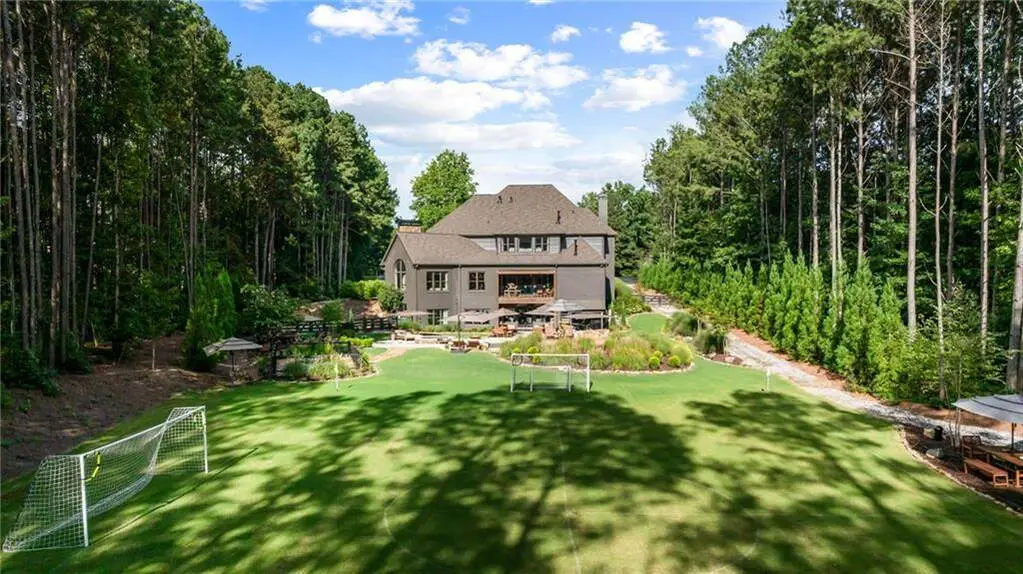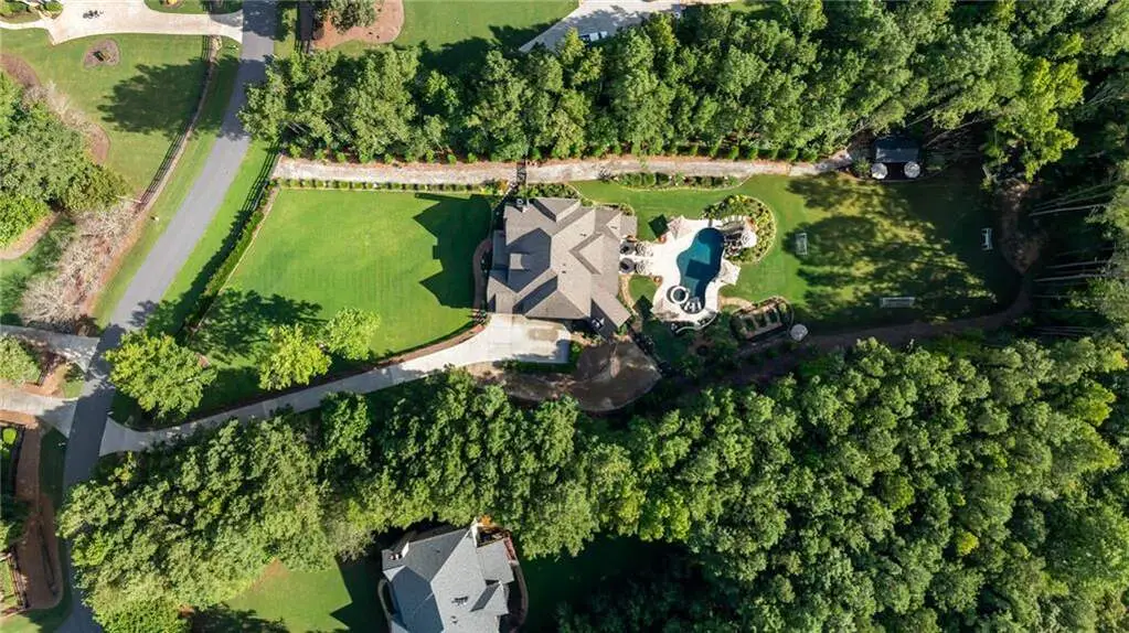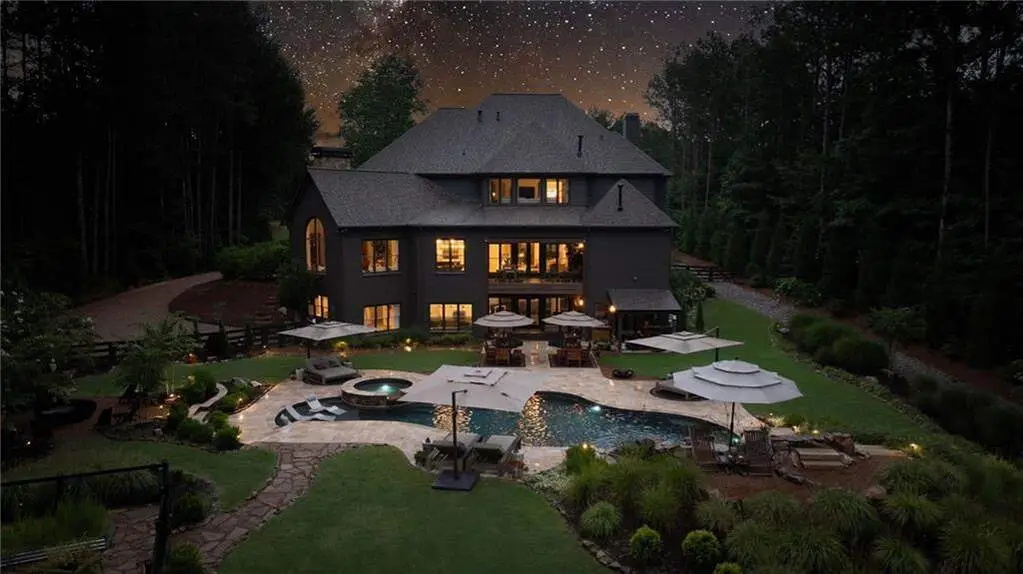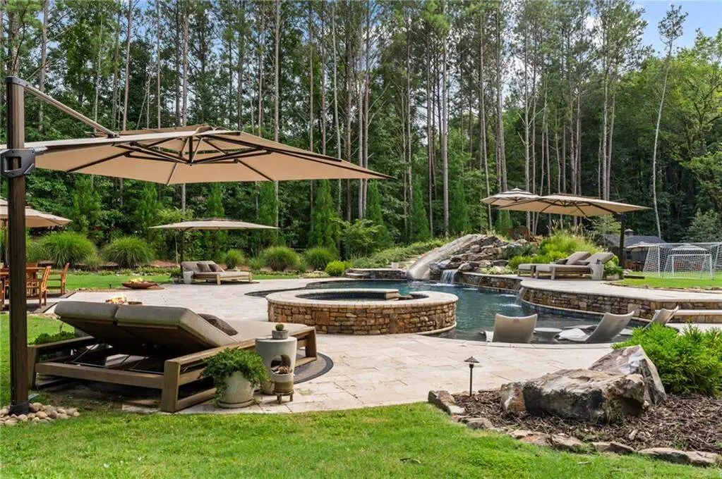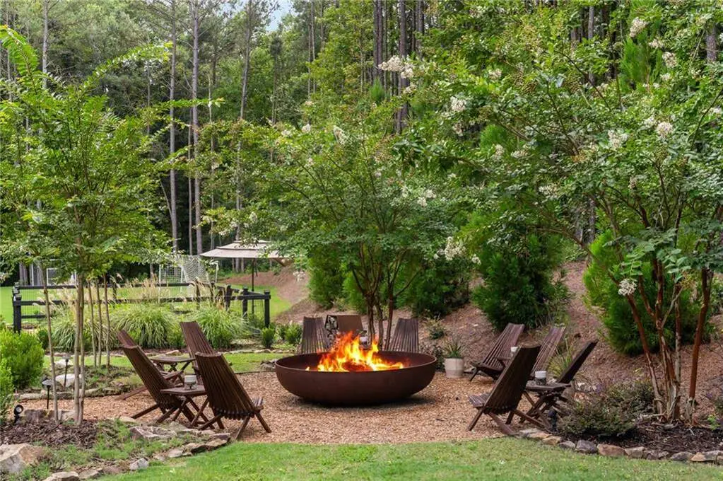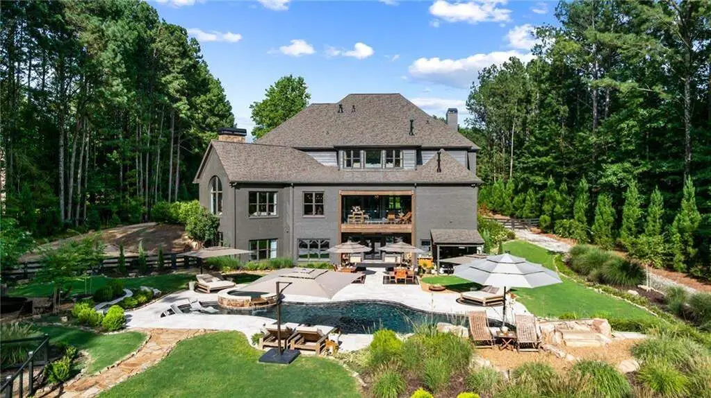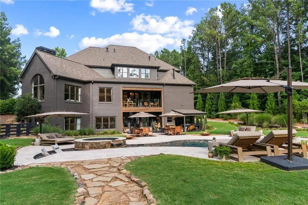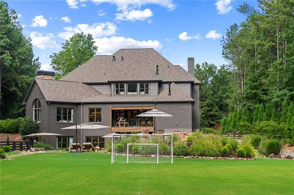 Tucked within a gated enclave and offering the rare blend of a sought-after Alpharetta address and low Cherokee County taxes, this stunning modern cottage-style estate is a true lifestyle property. Set on a beautifully landscaped lot, the exterior stuns new rock pathways, and a full yard transformation including a leveled, aerated backyard perfect for soccer play. Outdoor living is redefined with a heated saltwater pool featuring a blue light system, waterslide, and 10-person spa, paired with a round steel firepit, 18-speaker sound system with in-ground subwoofers, raised garden beds, firepits, and expansive patios for entertaining. Inside, the light-filled home features refinished Ashwood floors, fresh cedar accents, and over $100,000 in Restoration Hardware lighting. A Control4 smart home system integrates sound, lighting, hardwired cameras, and more. The open chef's kitchen is equipped with Sub-Zero, Wolf, and Miele appliances, plus double ovens and a walk-in pantry. Custom window treatments and built-in garage storage remain. The home boasts 7 total bedrooms, including a serene main-level primary suite with a gas fireplace. Upstairs offers four large bedrooms and the terrace level features two additional suites (one with separate entrance and kitchenette), a theatre, game room, and gym with sauna, all complemented by secondary laundry and ample storage. Experience elevated, turnkey living, just minutes from Milton and downtown Alpharetta.