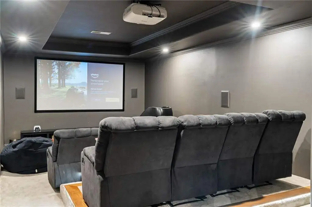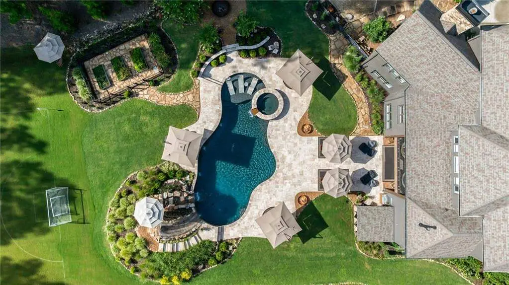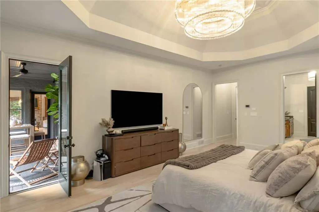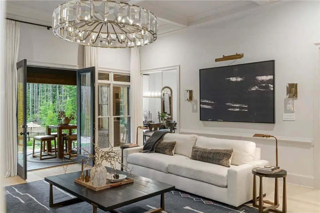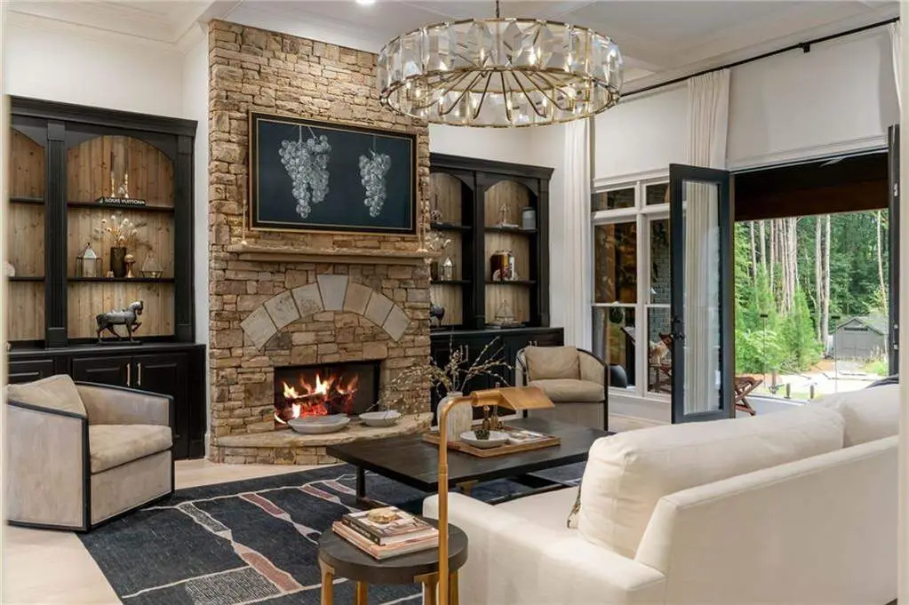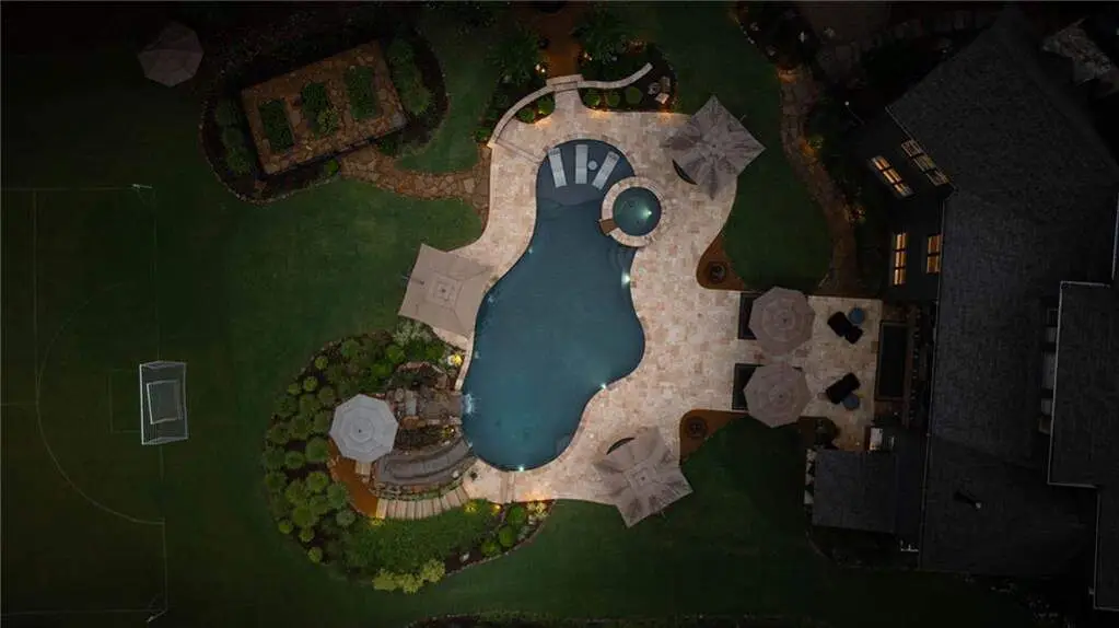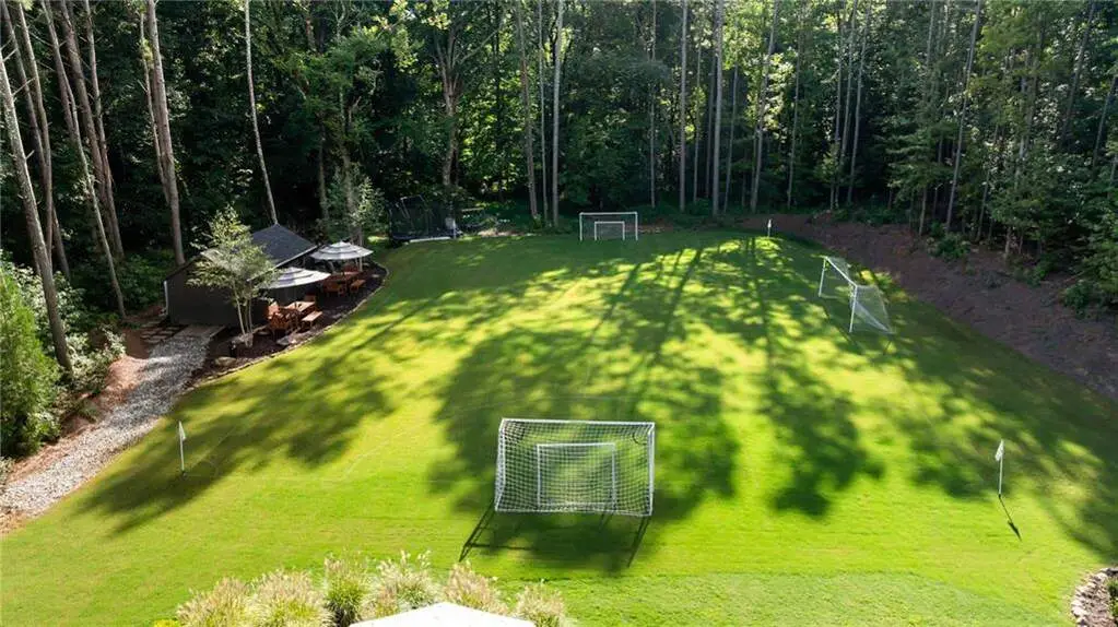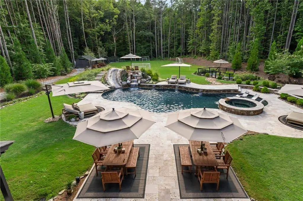 Tucked within a gated enclave and offering the rare blend of a sought-after Alpharetta address and low Cherokee County taxes, this stunning modern cottage-style estate is a true lifestyle property. Set on a beautifully landscaped lot, the exterior stuns new rock pathways, and a full yard transformation including a leveled, aerated backyard perfect for soccer play. Outdoor living is redefined with a heated saltwater pool featuring a blue light system, waterslide, and 10-person spa, paired with a round steel firepit, 18-speaker sound system with in-ground subwoofers, raised garden beds, firepits, and expansive patios for entertaining. Inside, the light-filled home features refinished Ashwood floors, fresh cedar accents, and over $100,000 in Restoration Hardware lighting. A Control4 smart home system integrates sound, lighting, hardwired cameras, and more. The open chef's kitchen is equipped with Sub-Zero, Wolf, and Miele appliances, plus double ovens and a walk-in pantry. Custom window treatments and built-in garage storage remain. The home boasts 7 total bedrooms, including a serene main-level primary suite with a gas fireplace. Upstairs offers four large bedrooms and the terrace level features two additional suites (one with separate entrance and kitchenette), a theatre, game room, and gym with sauna, all complemented by secondary laundry and ample storage. Experience elevated, turnkey living, just minutes from Milton and downtown Alpharetta.
