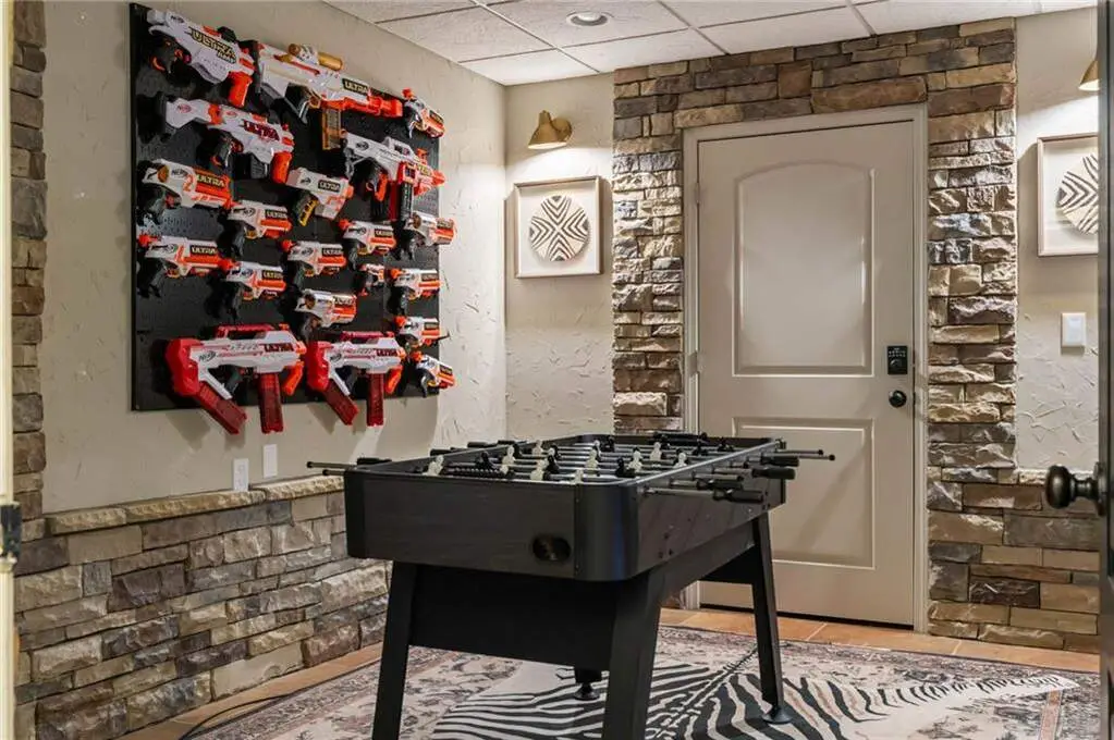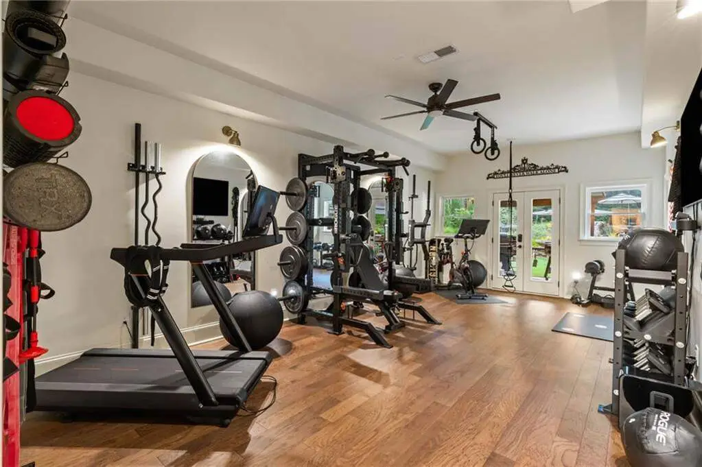 Terrace level with theatre, game room, and gym with sauna