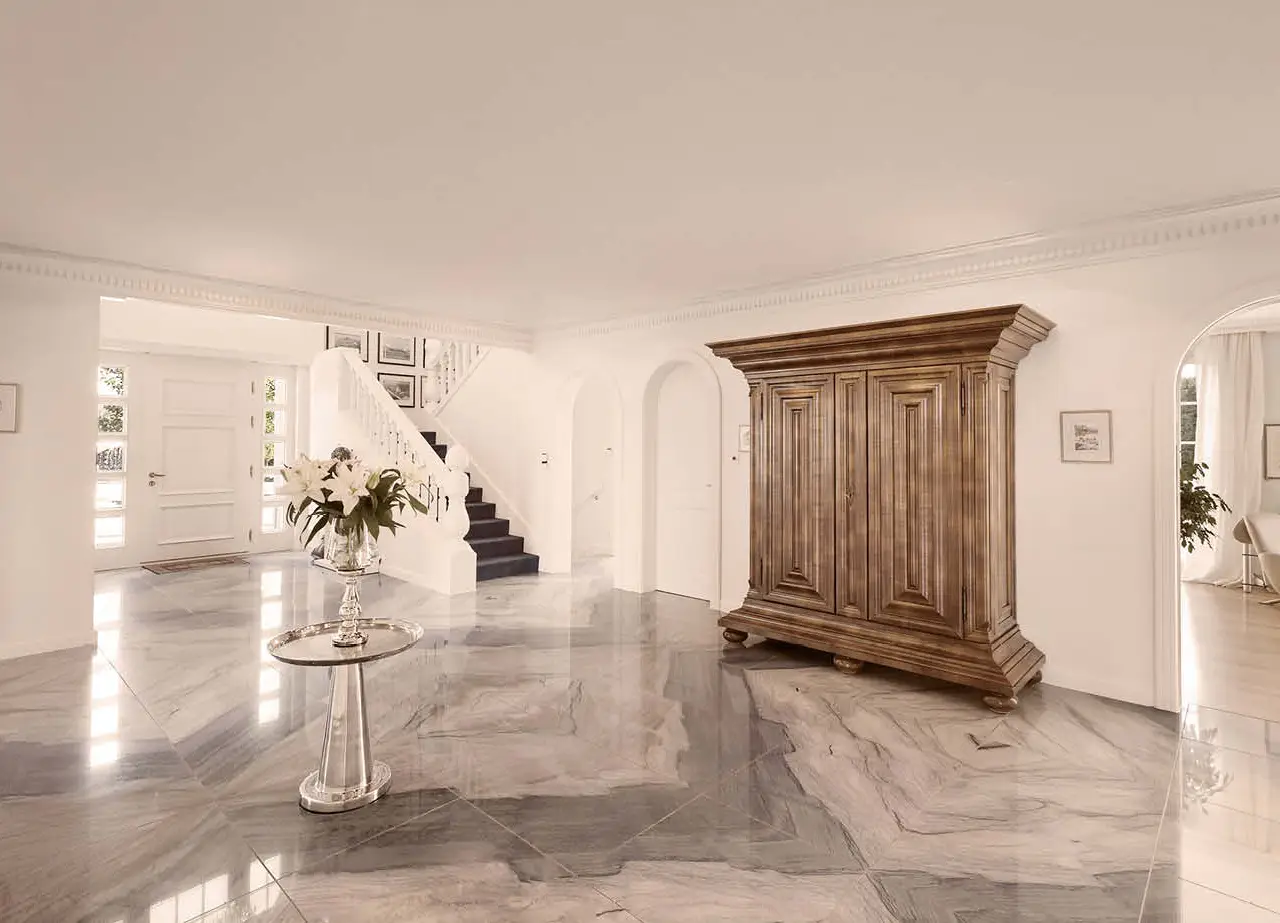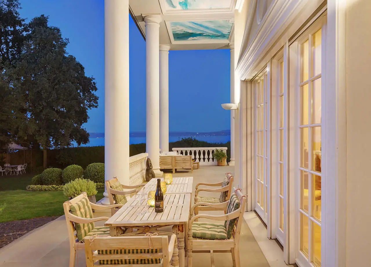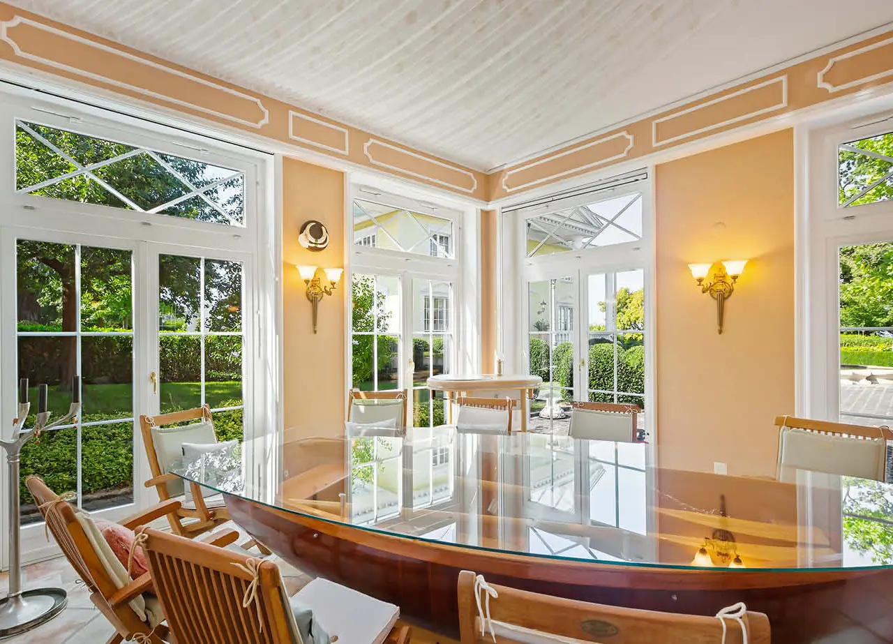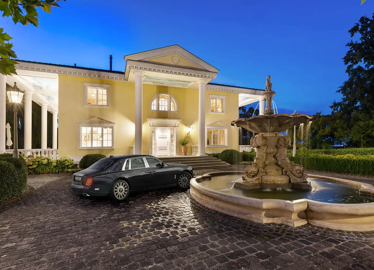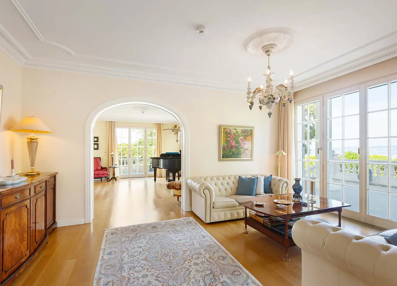Villa "IMPERIAL" – A Residence for Generations Located on one of the most exclusive Swiss lakefronts, Villa "IMPERIAL" combines timeless architecture with direct lake access and a park-like setting. The estate spans over 5,078 sqm and features a grand driveway with fountain, mature trees, a pond, and a pavilion – offering the privacy and elegance of a true retreat. The village blends peaceful, rural charm with excellent connections: Kreuzlingen, Konstanz, St. Gallen, and Zurich are all easily accessible. The region is known for its mild climate, lakeside promenade with marina, sunlit vineyards, and rich leisure opportunities – making it ideal for families and global citizens alike. From the moment you arrive, the property impresses with its sense of grandeur. A stately entrance leads into a high-ceilinged foyer with a sweeping staircase, setting the tone for the refined interiors, featuring natural stone floors, fine woodwork, and an atmospheric lighting design.