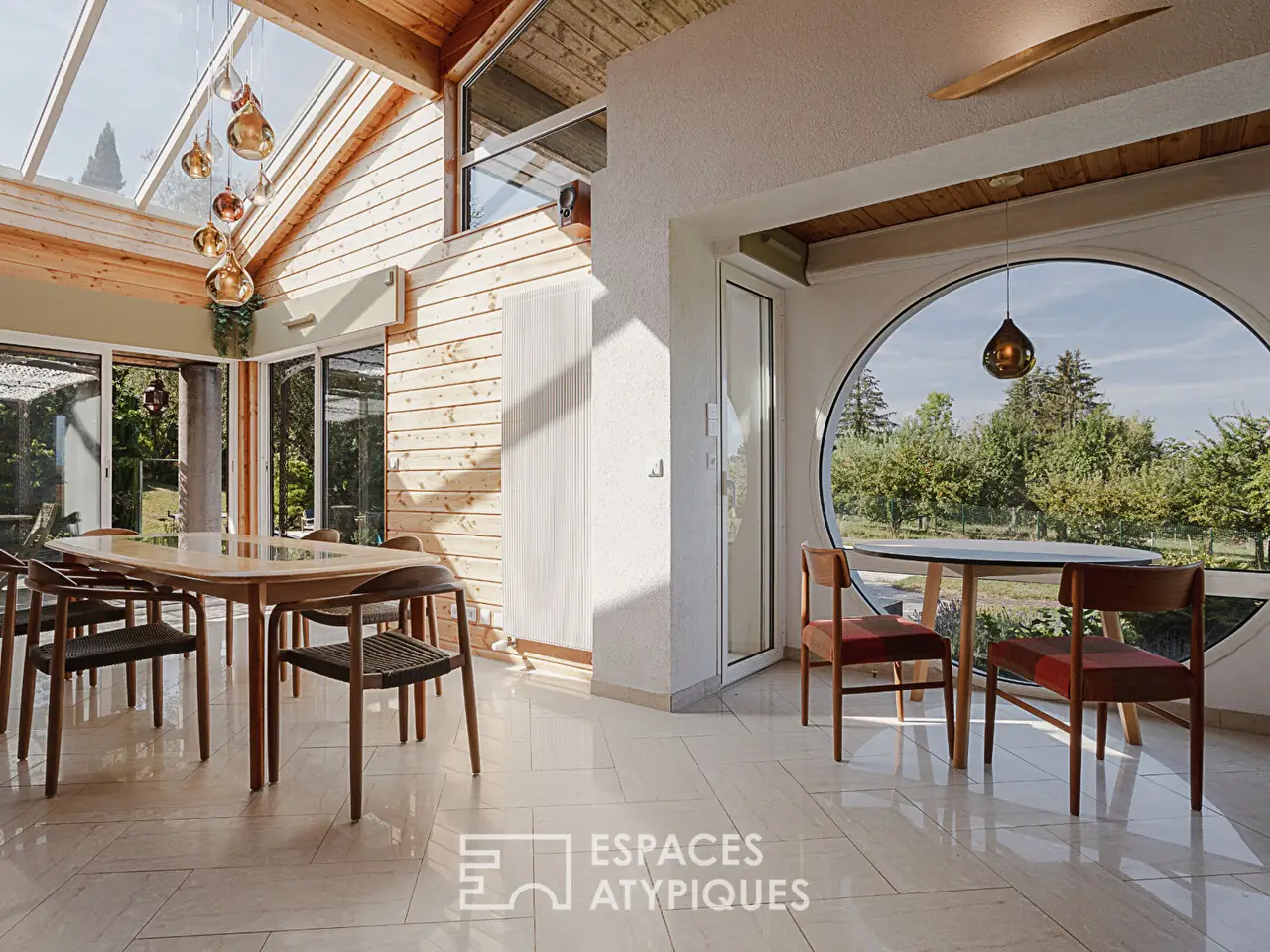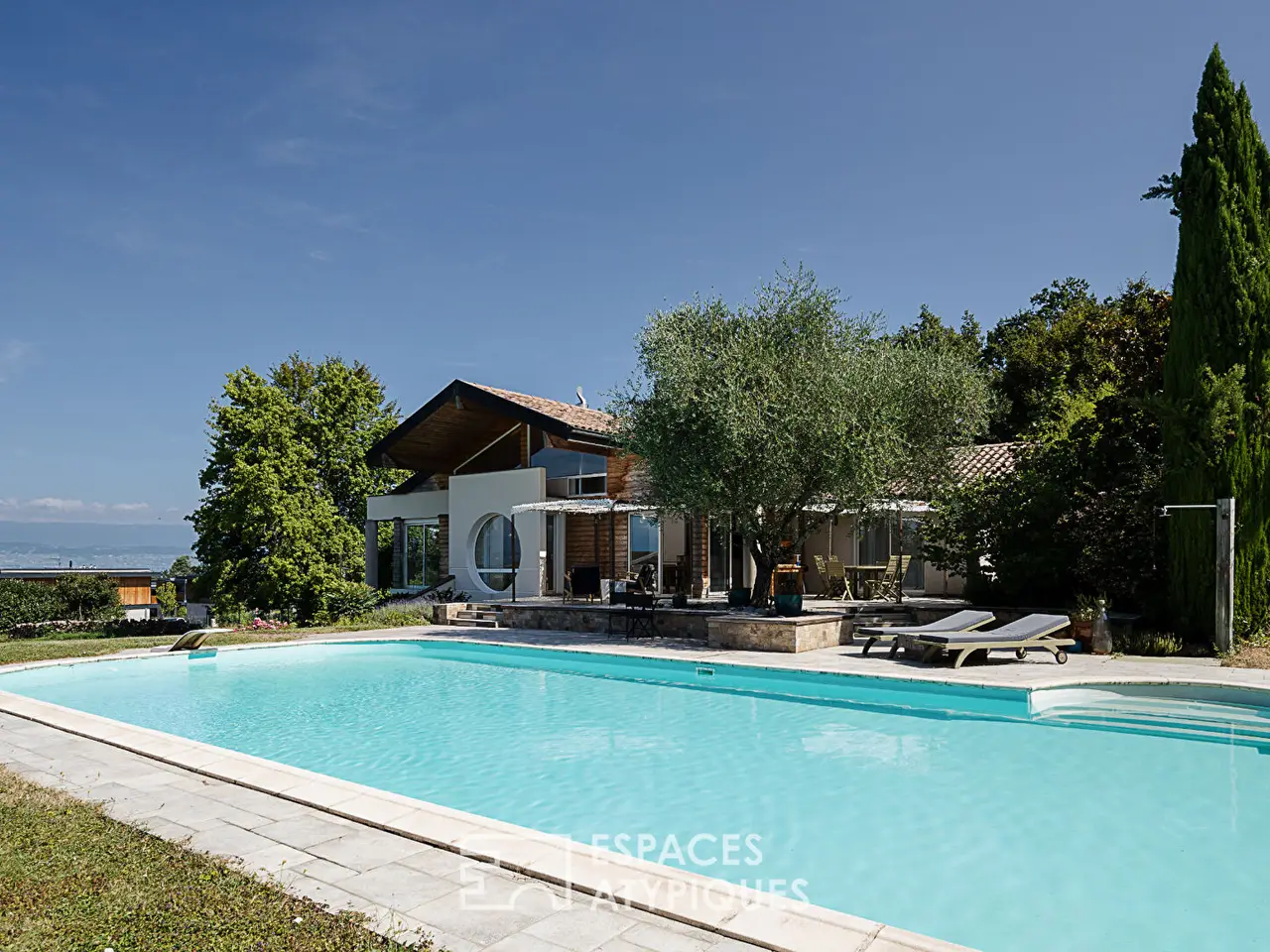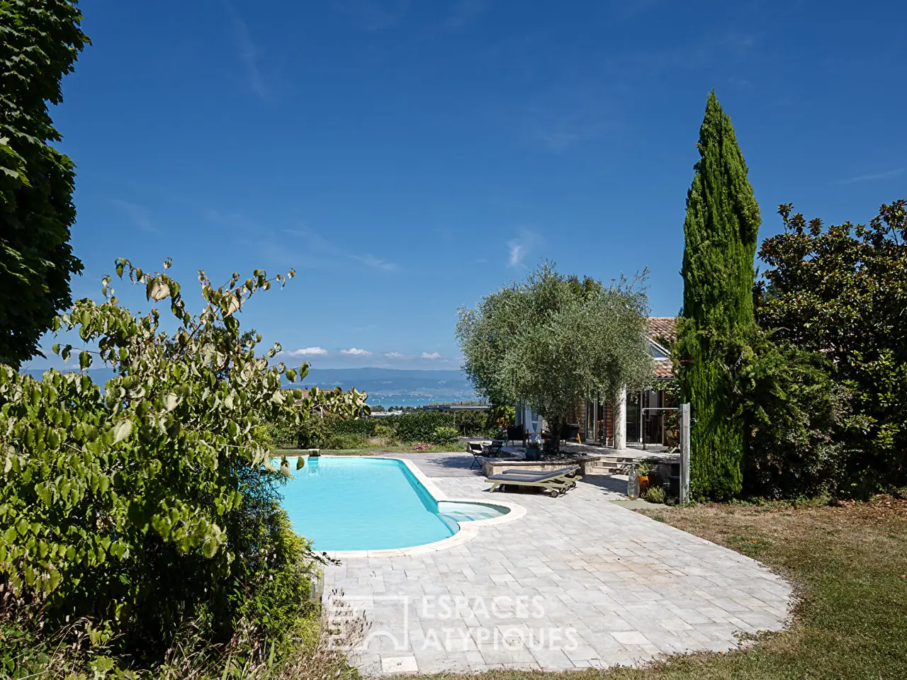 Ideally located in Anthy-sur-Leman, in a peaceful and green environment, this comfortable and atypical architect-designed villa of approximately 170 m2 of living space (220 m2 of usable space), extends on an enclosed and landscaped plot of 3,352 m2 with a swimming pool, in the immediate vicinity of the lake. Passing the entrance, the main level reveals a living space with generous volumes enhanced by a cathedral ceiling and bathed in light thanks to the large bay windows opening onto the garden and its terraces. The kitchen, perfectly equipped, extends into a dining area under glass, while the living room with fireplace and lake view invites relaxation and conviviality. The upper floor also accommodates a master suite designed as a true cocoon of well-being enjoying direct access to the terraces and the swimming pool. It includes a dressing room and an elegant semi-open bathroom with bathtub and walk-in shower. A cloakroom and storage space complete this level. On the lower half-level, a unique room overlooked by the balcony of the living room is distinguished by a monumental custom-made library and loophole windows. Designed in perfect aesthetic continuity, it offers a workspace that is both functional and inspiring. The lower level, organized around a central hall, offers three bedrooms, two of which open onto a terrace extended by the lower part of the garden. This level also includes a bathroom and a laundry room. In its continuation, on the basement floor, wine lovers will find a converted cellar with direct access to the garden. A large multipurpose room, currently used as a gym, as well as a boiler room, complete the features of this superb villa clad in Larch. Outside, the 15-meter long and 5-meter wide swimming pool promises true moments of pleasure. A garage with adjoining storeroom reinforces the many advantages of this property, completely renovated with care and attention to detail by its owners. Finally, an additional building surface of 137 m2 on the ground offers rare potential, making this property a real favorite for lovers of exceptional properties. Close to beaches, shops, schools and transport. ENERGY CLASS: D / CLIMATE CLASS: D Estimated average amount of annual energy expenditure for standard use, established from energy prices for the year 2021/2022/2023: between 3,140 Euros and 4,310 Euros. Information on the risks to which this property is exposed is available on the Georisques website for the areas concerned: www.georisques.gouv.fr. ESPACES ATYPIQUES GENEVOIS - LÉMANREF. 1821EAAdditional information* 7 rooms* 4 bedrooms* 1 bathroom* 1 shower room* 1 floor in the building* Land area: 3352 m2* Parking: 4 spaces* Property tax: €3,034Energy performance diagnosticsPrimary energy consumptiond: 248 kWh/m2.yearExtremely efficient housing*A*B*C*248kWh/m2.year42*kg CO2/m2.yearD*E*F*GExtremely inefficient housing* Of which greenhouse gas emissionsd: 42 kg CO2/m2.yearLow CO2 emissions*A*B*C*42kg CO2/m2.yearD*E*F*GEvery high CO2 emissionsAverage estimated annual energy expenditure for standard use, indexed to the years 2021, 2022, 2023: between €3,140 and €4,310 (subscription included)Agency feesThe fees are inclusive of tax and are payable by the seller
