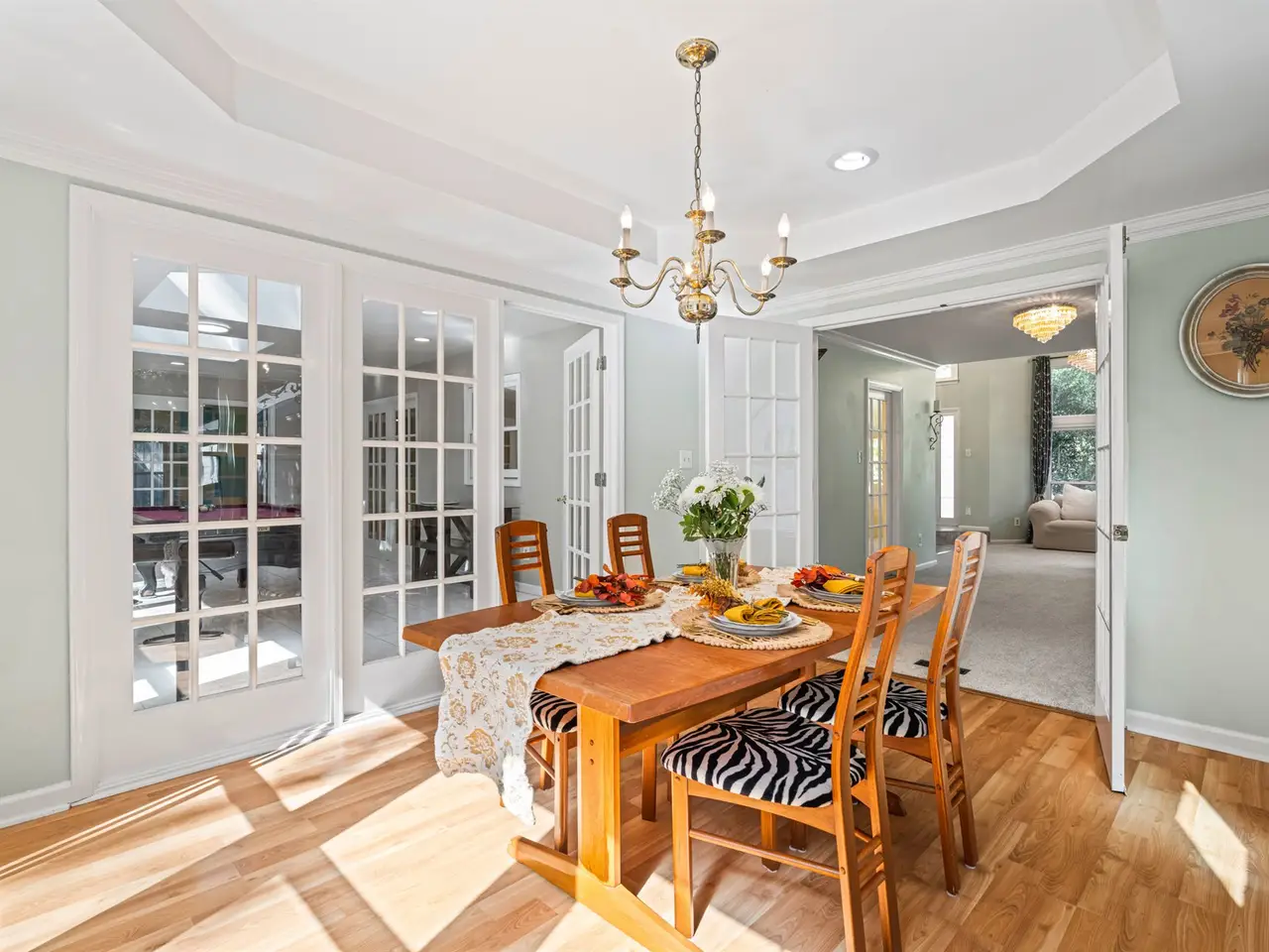 Experience the perfect blend of elegance, comfort, and modern upgrades in this beautifully appointed 4-bedroom, 2.5-bath traditional home located in the highly desirable Shepherd's Vineyard community in Apex, North Carolina. With 3,053 sq. ft. on a 0.29-acre lot, this residence offers both exceptional functionality and a refined lifestyle.The marble-tiled foyer, illuminated by an imported triple-pane Sch?co window and dramatic front door, features a stunning crystal chandelier, which makes a memorable first impression. Chandeliers in the living room area and formal dining room add a luxurious touch, creating the perfect atmosphere for hosting and entertaining.The primary suite serves as a private retreat, complete with a spa-inspired bathroom featuring a jetted soaking tub, sauna, bidet, and a home office?an ideal balance of comfort and practicality.The home's kitchen combines warmth and modern style with newly refinished oak cabinets, new stainless dishwasher, granite countertops, and a center island that is perfect for cooking or gathering. Kitchen French doors flow directly into the billiard room. A custom Sch?co door leads to the 2-car garage with brand-new steel insulated garage doors with glass windows, which elevate both curb appeal and energy efficiency.The billiard room with 3-panel Sch?co door, cheerful playroom, and cozy gathering room overlooking the vibrant banana tree provide distinct areas for relaxation, work, and entertainment. Tile flooring in both the kitchen and billiard room enhances durability and easy maintenance. Step outside to the back deck with a swinging hammock and al fresco dining space, offering the perfect setting for indoor-outdoor living.Each of the upper level four bedrooms features Pergo flooring and abundant natural light, adding warmth and charm throughout the home. Located within a convenient distance of the community clubhouse, pools, tennis, and beach volleyball courts, and just minutes from Apex Peakway, restaurants, shops, Apex Community Park Lake Pine trail, and the community library, this home blends suburban serenity with practicality.This Shepherd's Vineyard residence is more than a home?it's a sanctuary of comfort, style, and thoughtful design, offering multiple areas for living, entertaining, and unwinding in the heart of Apex.