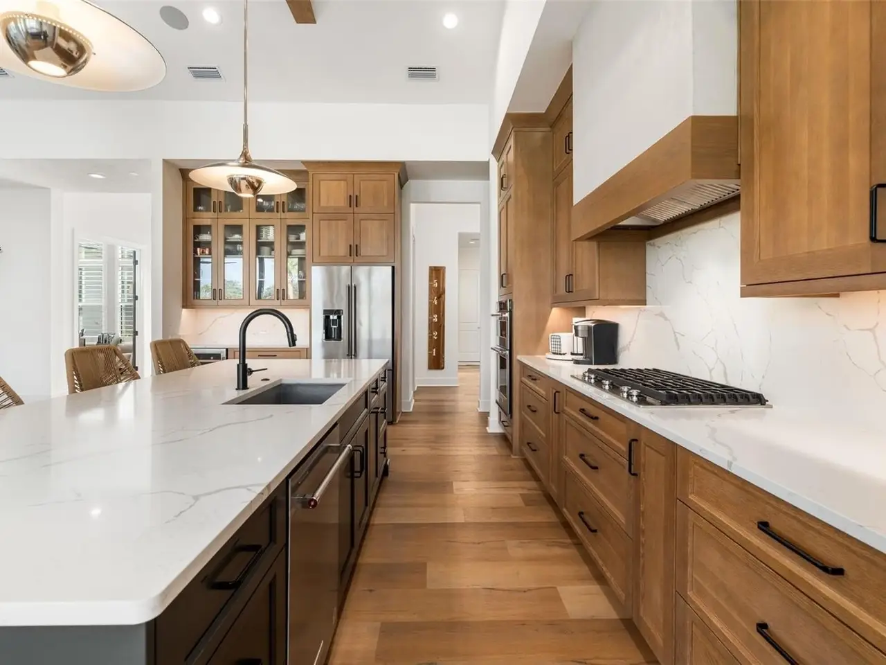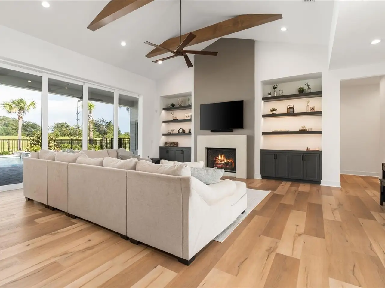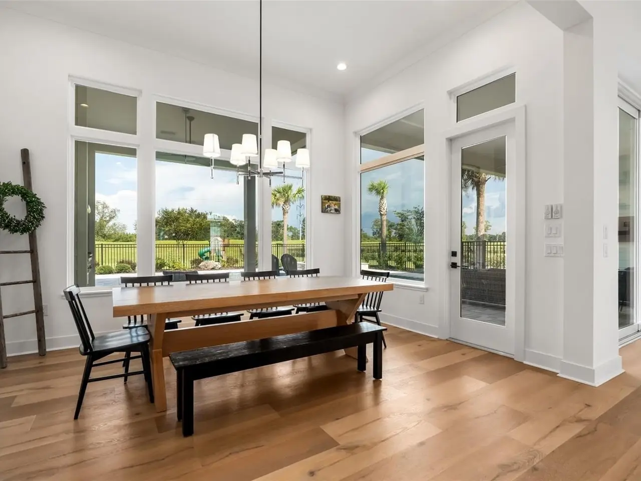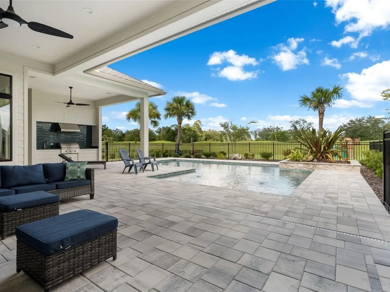 Designed and built by Barry Bullard Homes, this estate blends timeless style with today’s most sought after features, all thoughtfully placed on a fully landscaped, one-acre lot in one of Gainesville’s most desirable luxury communities - Flint Rock. With over 3,600 square feet, this home offers four spacious bedrooms, four full bathrooms, a dedicated study, formal dining, and a flex room with a custom beverage bar that opens directly to your outdoor living space. You’ll instantly appreciate every detail of the kitchen, from the rift-cut oak cabinetry and quartz countertops to the oversized island, stone hood, 5-burner gas cooktop, a built-in convection oven integrated above the microwave, and the wine chiller tucked into its own elegant nook with glass-front cabinets above. The walk-in pantry offers exceptional storage with plenty of space for small appliances, bulk items, and everyday essentials. It doesn’t stop there..your own dedicated household supply room offers even more room for seasonal decor, cleaning essentials, or just extra bulk supplies. Laundy just became that much easier with additional cabinetry, a folding counter, and a designated space to hang clothes. Wood plank flooring runs throughout the main living areas, offering durability with an elevated look. 16' vaulted ceilings with stained wood beams define the great room, which features a gas fireplace, built-ins, and 10’ stack-back sliders that disappear to reveal an expansive lanai and pool. The primary suite has dual walk-in closets, a freestanding soaking tub, and a spa-like walk-in shower. Two full-size, 2-car garages allow for separate entryways from either side of the house for seamless access into the home- each with its own custom drop zone and built-in storage. Out back, the patio is fully paved and made for Florida days. Enjoy a saltwater pool with a sun shelf and flowing water feature, a summer kitchen with a built-in grill and sink, and plenty of covered space to relax or host. Additional energy-efficient upgrades include spray foam insulation, tankless water heaters, a two-zone high-efficiency HVAC system, and vinyl insulated low E windows, all designed to enhance comfort and performance year-round. Flint Rock is a thoughtfully planned community designed to preserve open space and natural beauty. Residents get to enjoy access to recreational areas, nature trails, orchards with fruit and nut-bearing trees, community gardens, and winding walking paths offering more green space than a typical Gainesville subdivision. Schedule a private tour to see the only available home in the neighborhood!