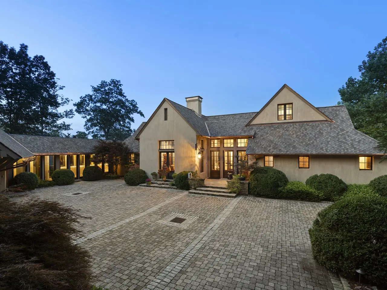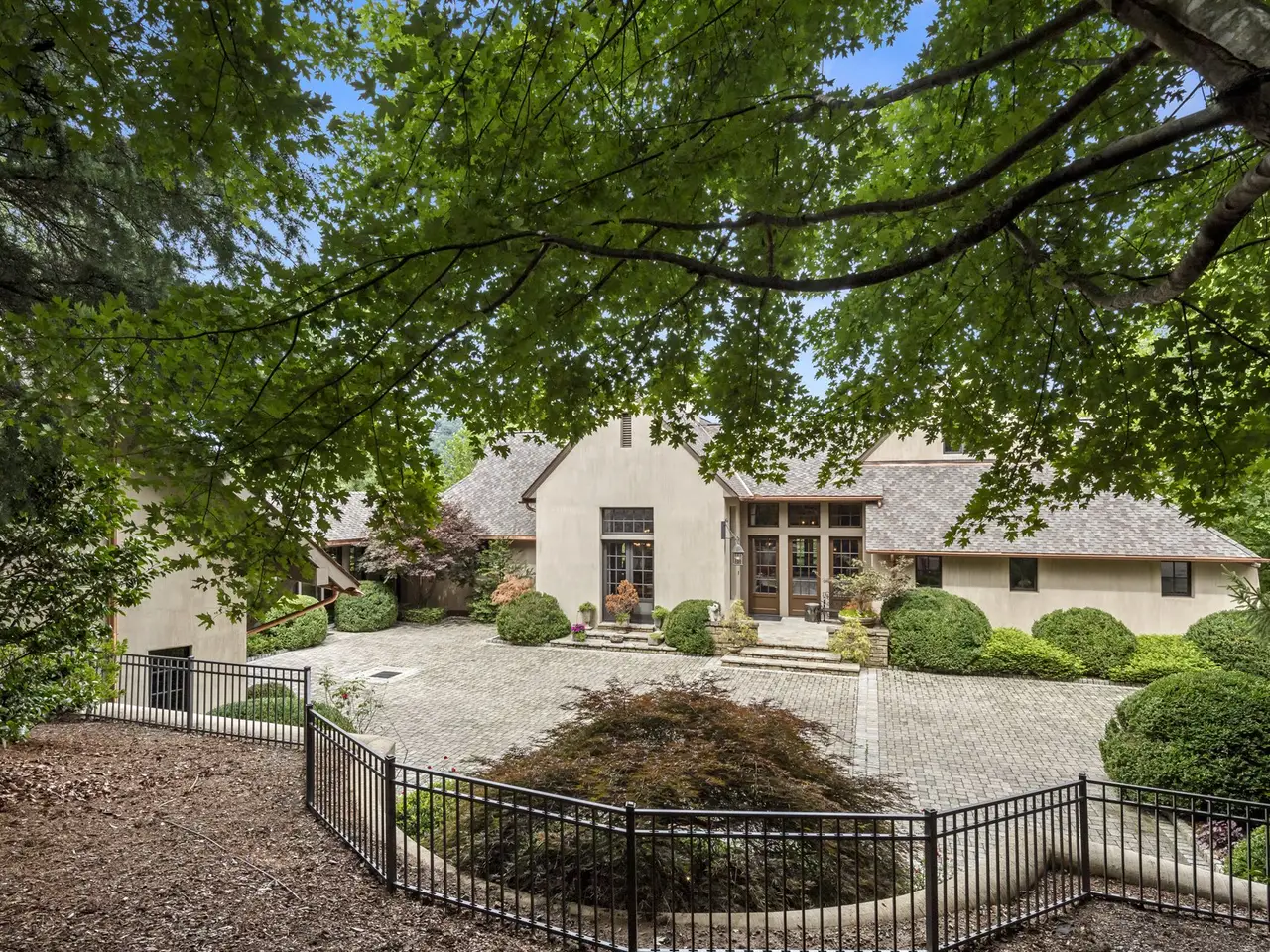 A gentle driveway and expansive brick paver private courtyard welcome you to this luxury mountain enclave. Revel in outstanding long-range mountain views throughout the house with every convenience plus some creative surprises. A fabulous French Country-style kitchen offers Oak and copper accents along with a separate pantry and breakfast room with a retractable wall opening to the outdoor dining porch. The main level primary suite has a beamed ceiling and opens to a screened porch, an elegant primary closet that flows easily into the spa-inspired bath with a steam shower, whirlpool tub, and radiant heat floors. Special highlights include two-story beamed ceilings, clerestory windows, home elevator, hidden bookcase doorways on the terrace level, gorgeous oak wet bar, and private guest quarters. Enticing outdoor living spaces include a fenced level yard, four private screened porches, and an expansive flagstone terrace framed by a stone retaining wall and a built-in gas firepit.