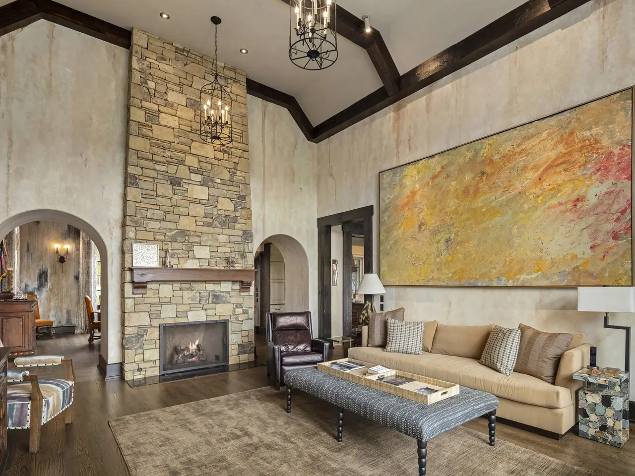 Two-story beamed ceilings and clerestory windows