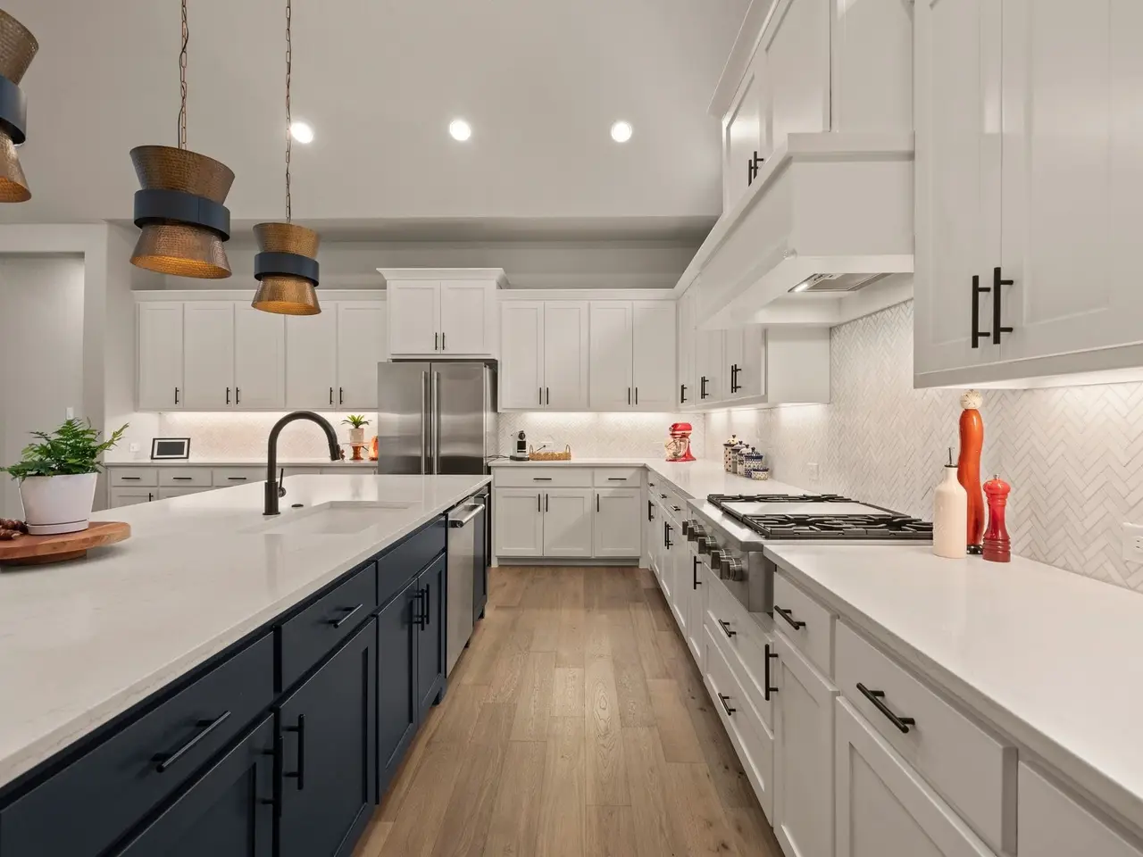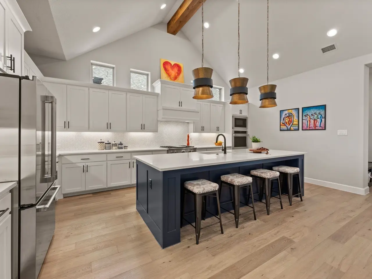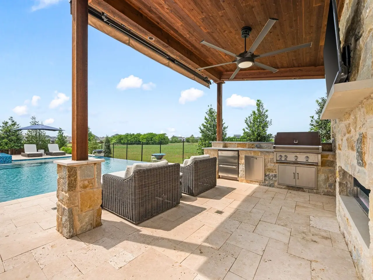 Impeccably maintained single-story with all the right spaces! Four bedrms in a 3-way split layout. The primary BR offers a beautiful view of the pool & greenbelt behind the home! All bedrms feature en-suite baths, plus there's a half bath off the front foyer! The massive, open concept family room-breakfast room-kitchen will impress! Here you will find a beamed ceiling spanning the area, gas fplc & sliding doors to the covered patio with remote drop screen. The spacious kitchen offers tons of quartz counterspace, white perimeter cabinets, center island painted a contrasting blue, gold hardware, designer pendant lighting, gas range, dbl ovens + a butlery area with wine cooler. In addition, there is a 2nd liv-flex space currently outfitted as a gym with rubber flrs, but there is white oak flooring underneath! The home office is just off the main foyer & offers French doors for privacy. This home is better than new with many upgrades: ALL white oak wood floors except tile baths, plantation shutters, upgraded gold cabinet pulls, HALO whole-house water filtration & more! Premium Claffey pool: dramatic infinity edge, play depth, raised spa, travertine pool deck, tanning ledge with umbrella, fire & water bowls! The detached cabana features a gas fireplace, cantilevered remote awning that projects out for extra shade, granite bar, Hestan grill & True beverage fridge. 3-car tandem garage with epoxy floors! Lush front landscape (HOA mows the front yard only). The north-facing backyard overlooks the greenbelt & offers low maintenance landscaping & spectacular sunsets! The community as many amenities, incl the Canyon Falls park & playground!