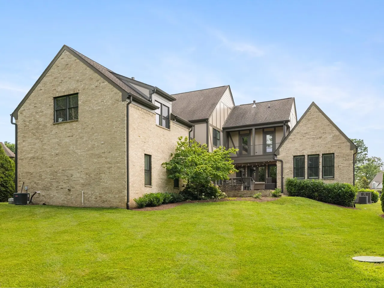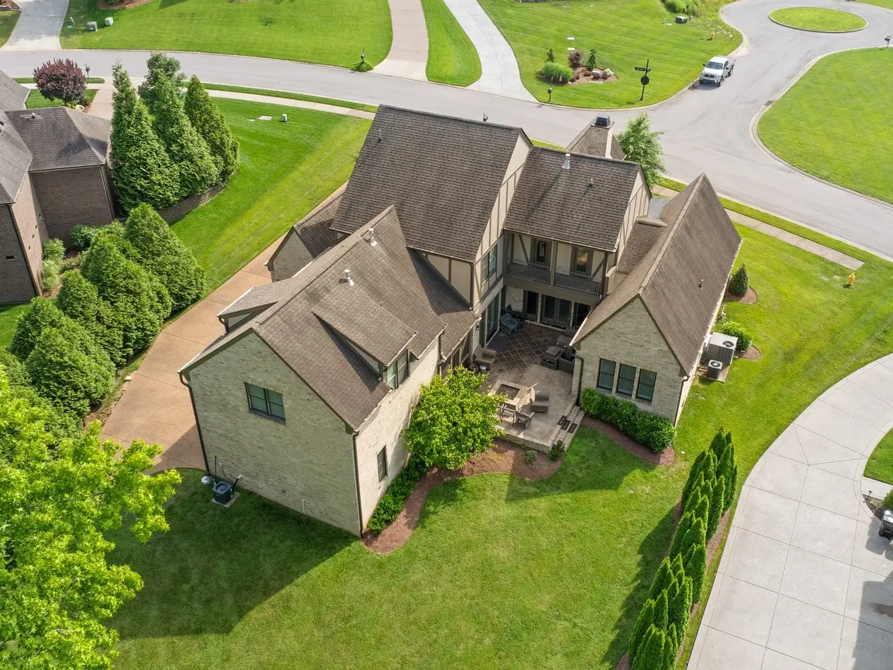 Tucked away on a peaceful cul-de-sac and backing to serene green space, this stunning home offers both privacy and luxury on a spacious lot perfect for everyday living and entertaining. Enjoy outdoor living at its finest with a screened-in porch, cozy outdoor fire pit, balcony overlooking the backyard, and a charming front courtyard--all complemented by a 3-car garage. Step inside to a thoughtfully designed layout with arched doorways and rich hardwoods throughout the main level. The open-concept living, kitchen, and dining areas flow seamlessly together and are anchored by an oversized center island, wood-beamed ceilings, and top-of-the-line appliances. A beverage center in the dining room makes entertaining effortless. The main-level primary suite is a true retreat with vaulted ceilings, a spa-inspired bath featuring a soaking tub, floor-to-ceiling tiled shower, double vanities, and a spacious walk-in closet. A dedicated main-level office adds functionality and flexibility. Upstairs, you'll find three generous bedrooms, each paired with access to one of three bonus/flex rooms--ideal for media, playroom, gym, or guest space. One bonus room is conveniently located with the secondary bedrooms, another is privately situated on the second level, and the third crowns the third floor, offering a full wet bar with a dishwasher, microwave, mini fridge, and electric cooktop--perfect for entertaining or a private guest suite. This home offers a rare combination of space, style, and thoughtful design in a location that feels like a private retreat yet is close to everything you need. Don't miss your chance to make it yours!